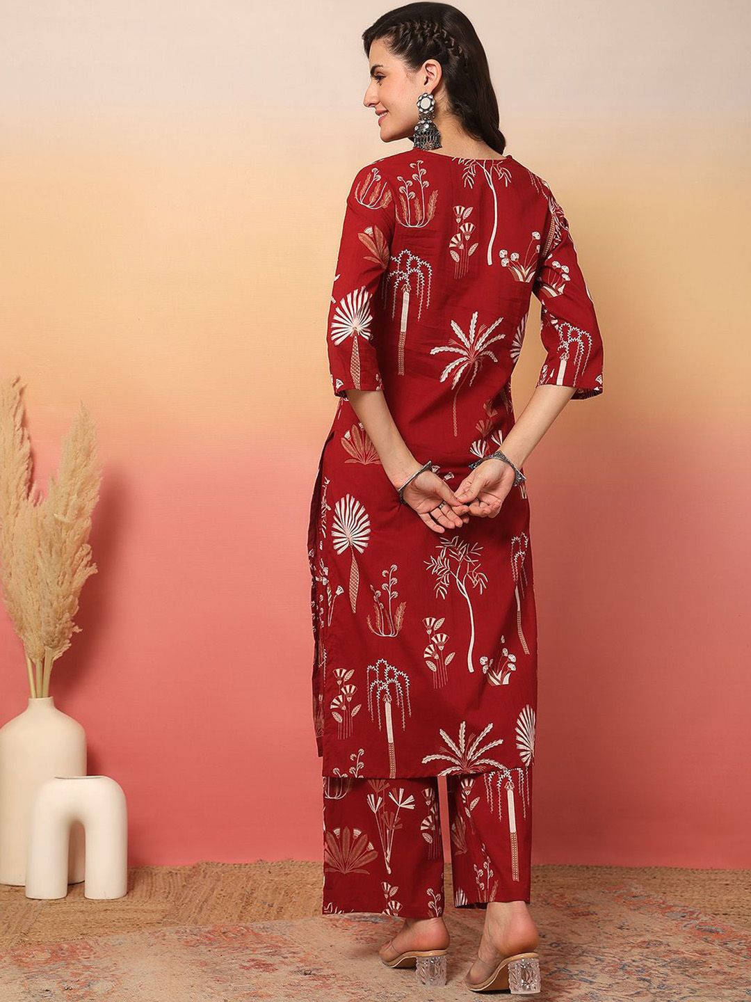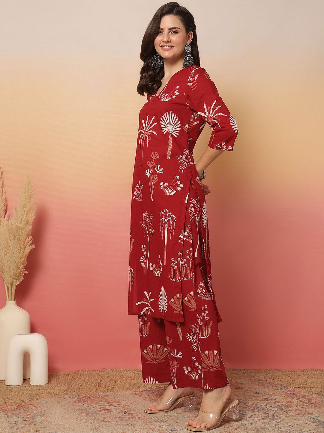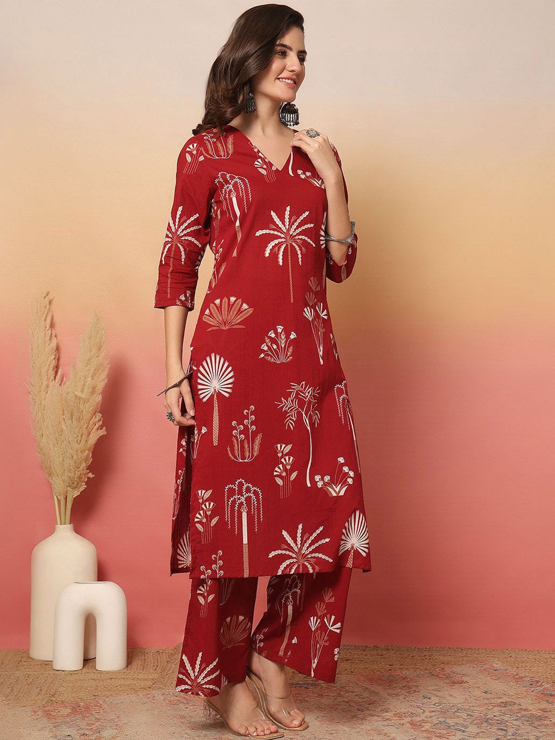 Anouk Rustic Floral Printed V-Neck Pure Cotton Straight Kurta With Palazzos