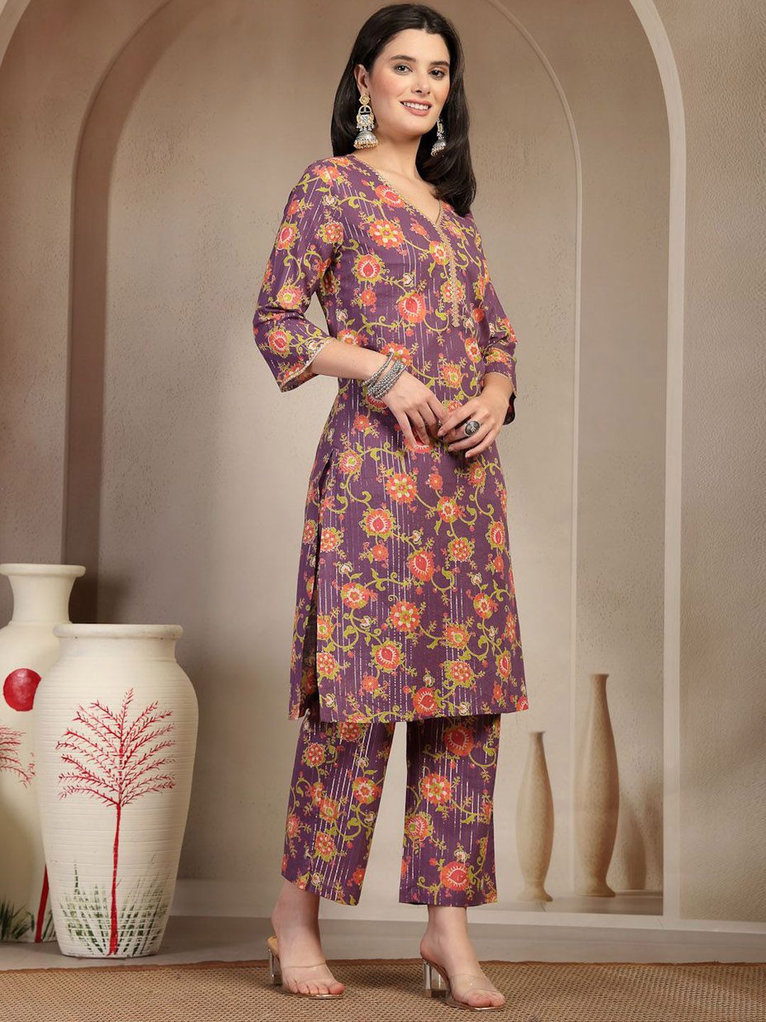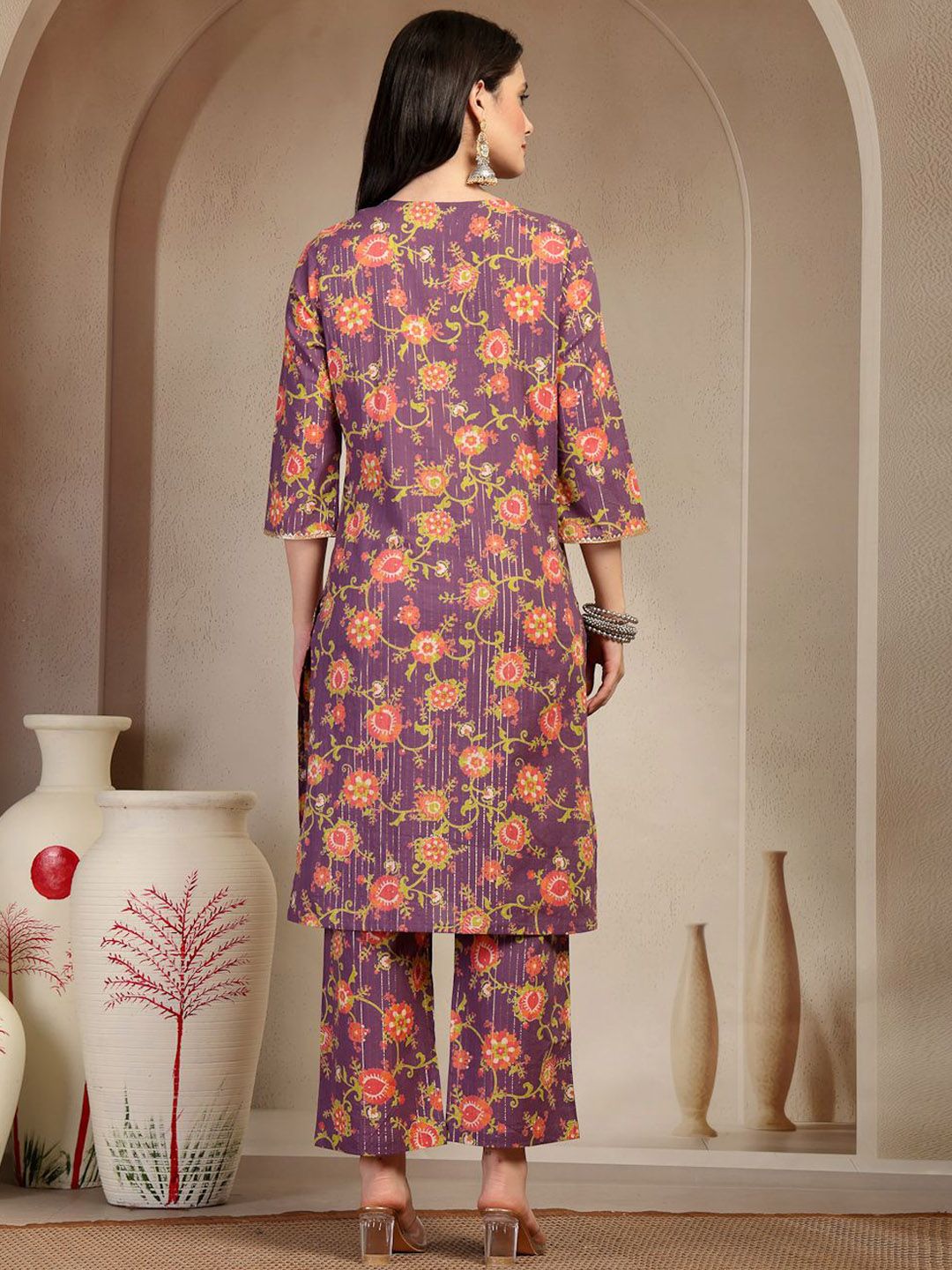 Anouk Rustic Floral Printed V-Neck Gotta Patti Pure Cotton Kurta With Trousers