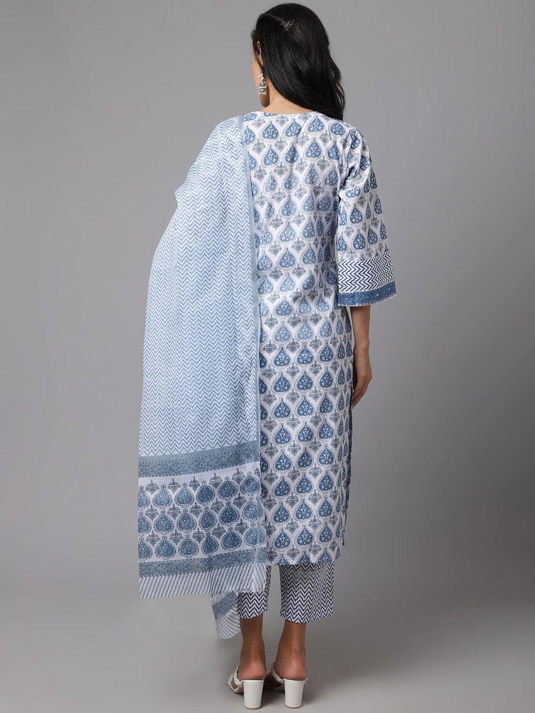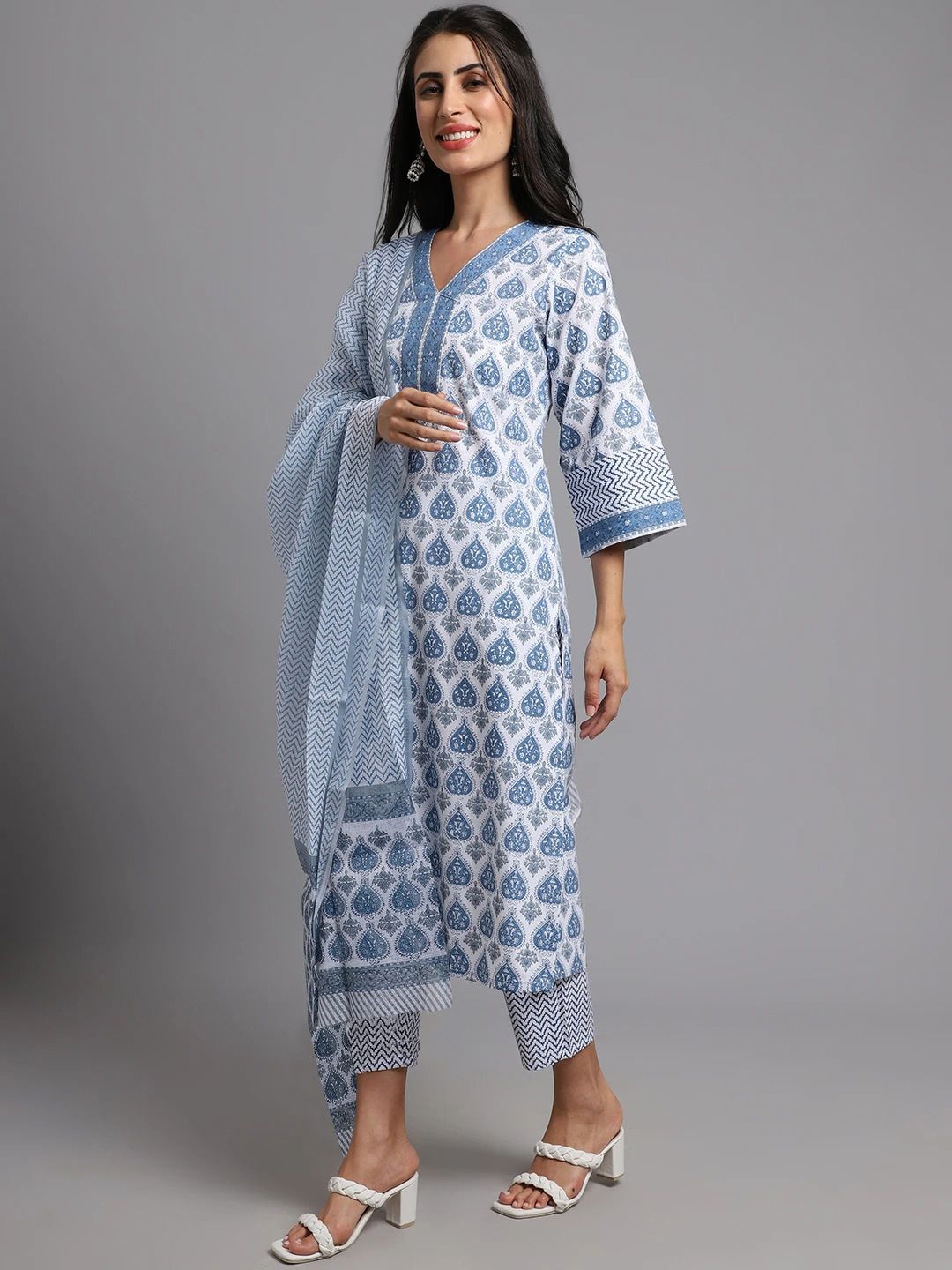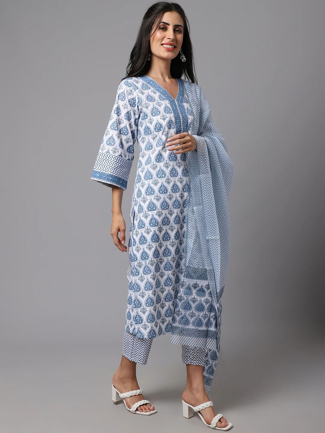 Anouk Rustic Floral Printed V-Neck Straight Kurta with Trousers & Dupatta