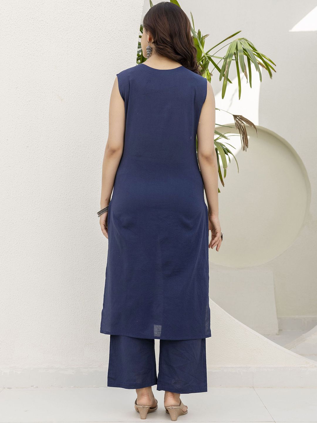 Anouk Rustic Notch Neck Thread Work Pure Cotton Straight Kurta With Trousers & Dupatta