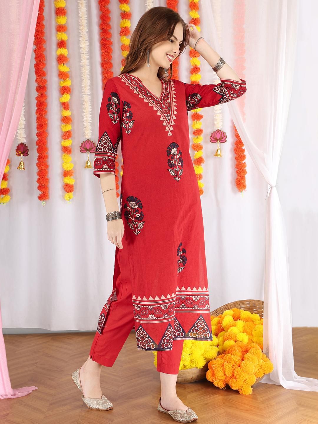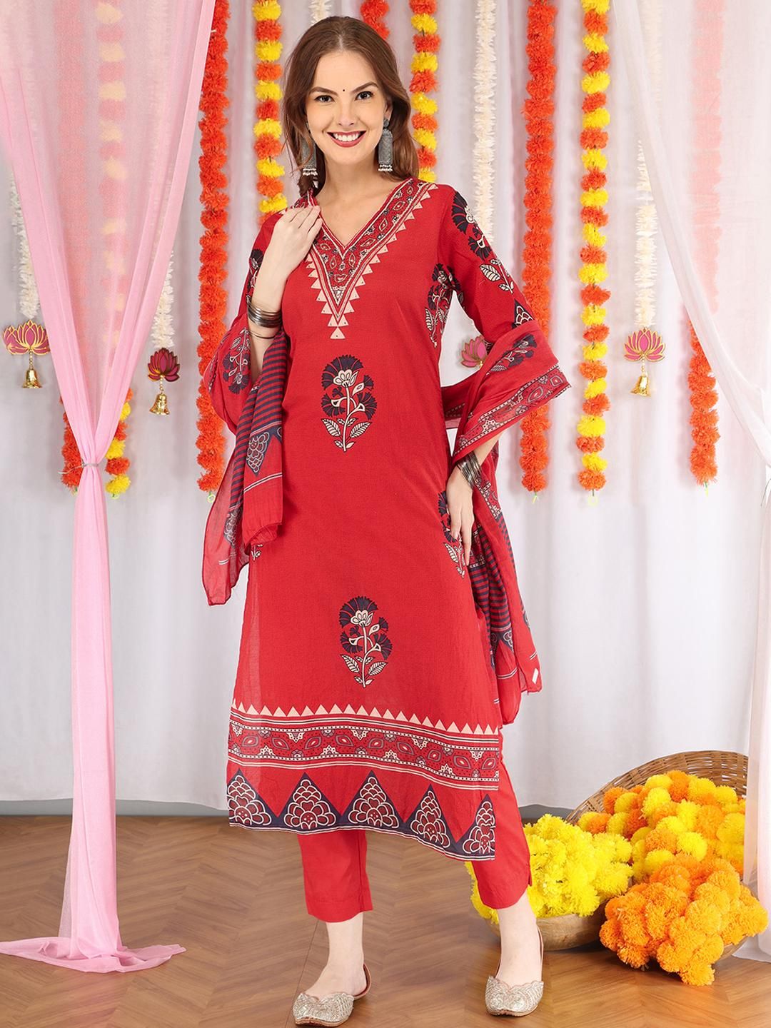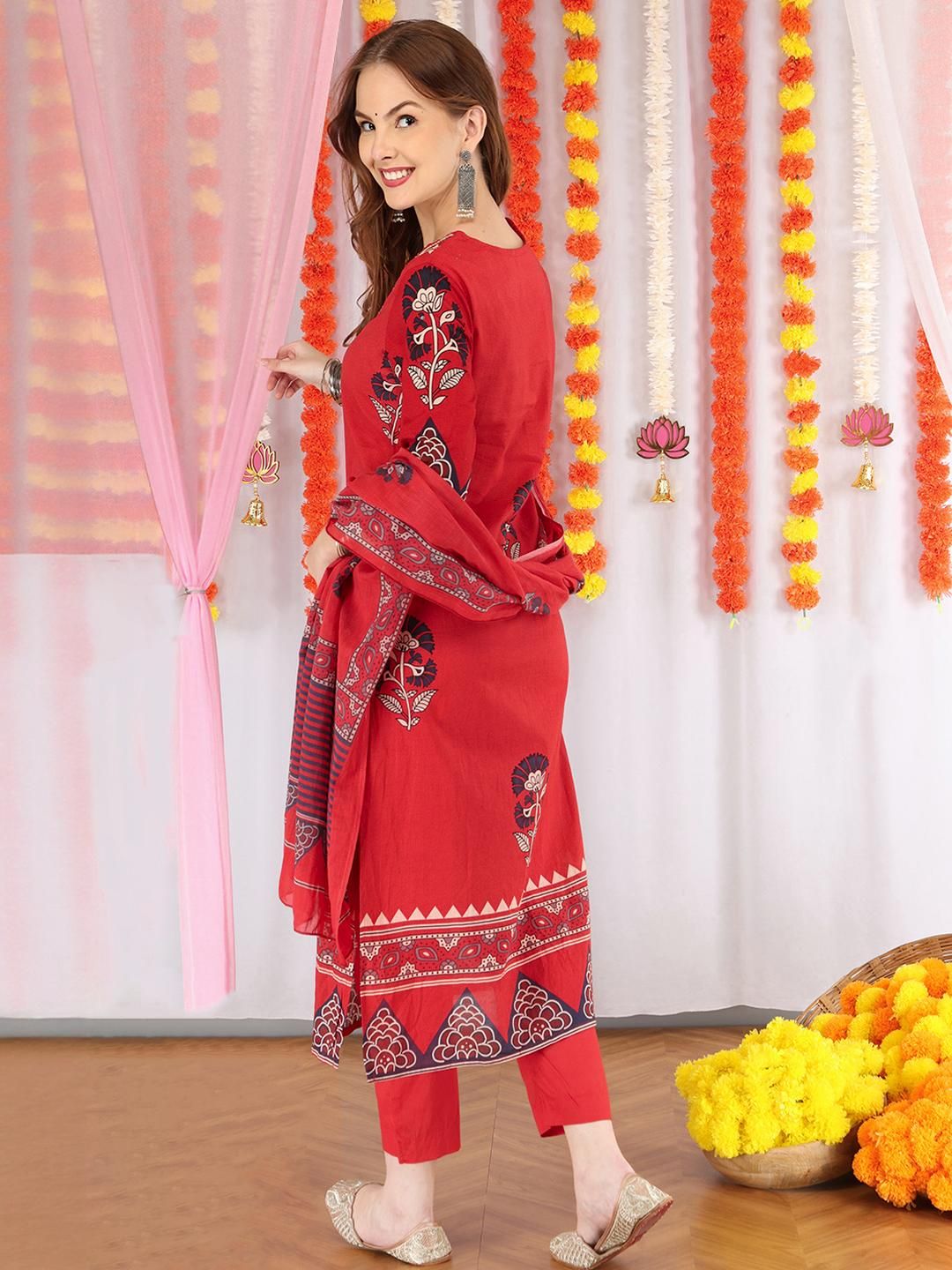 Anouk Women Red Pure Cotton Kurta Sets With Dupatta