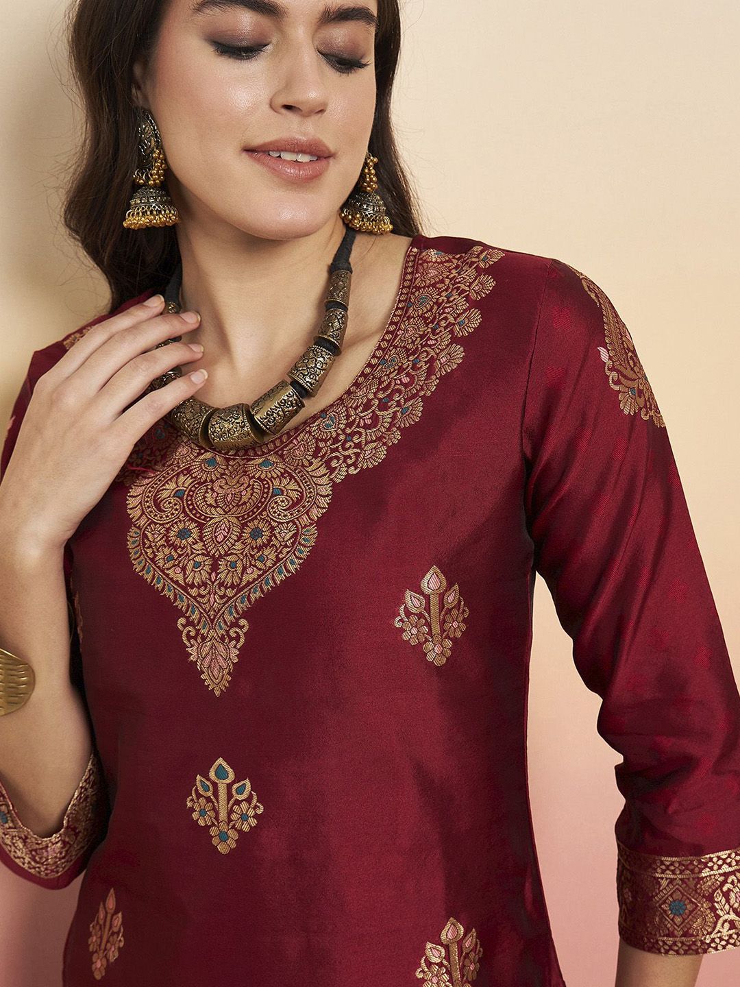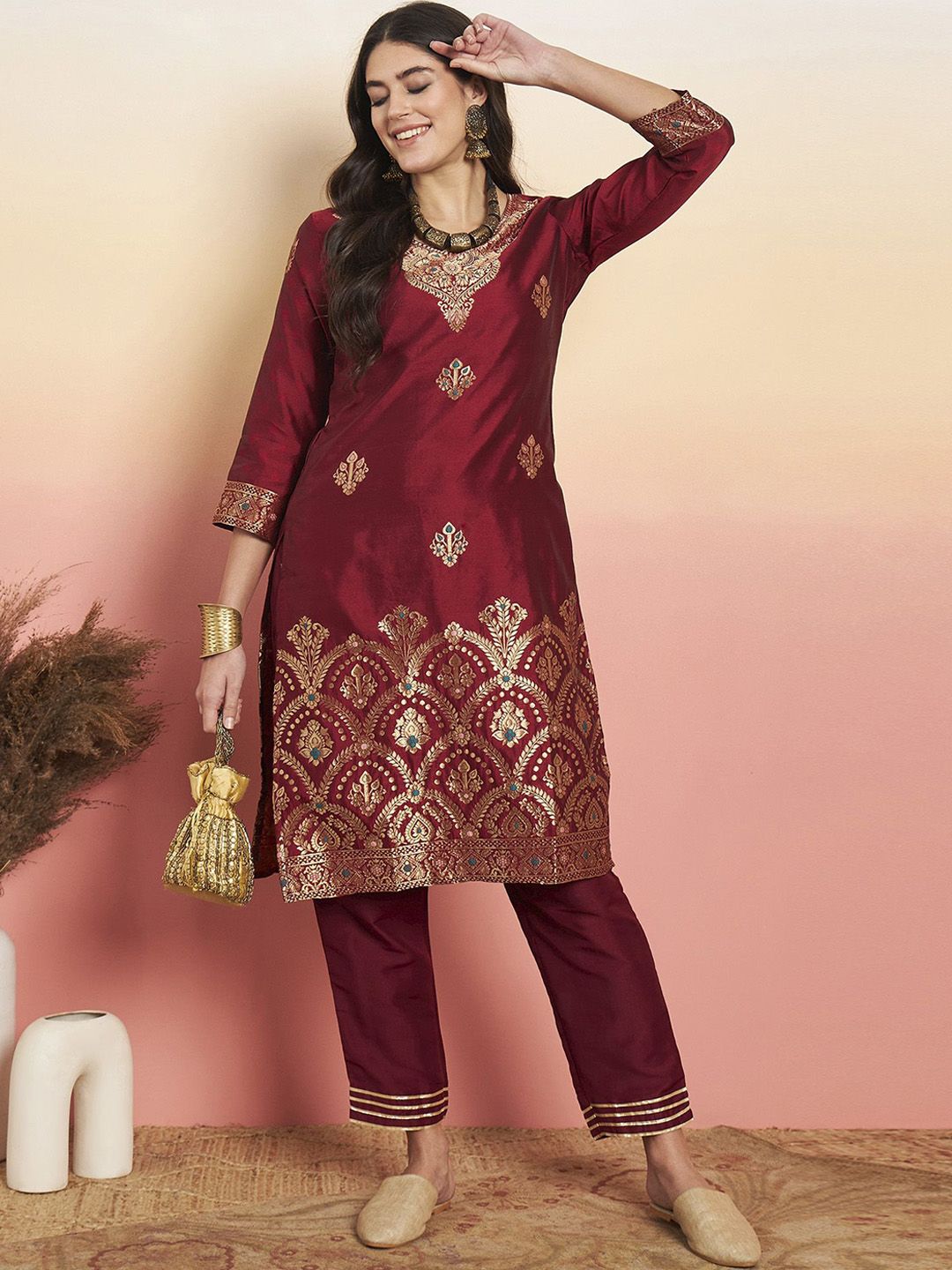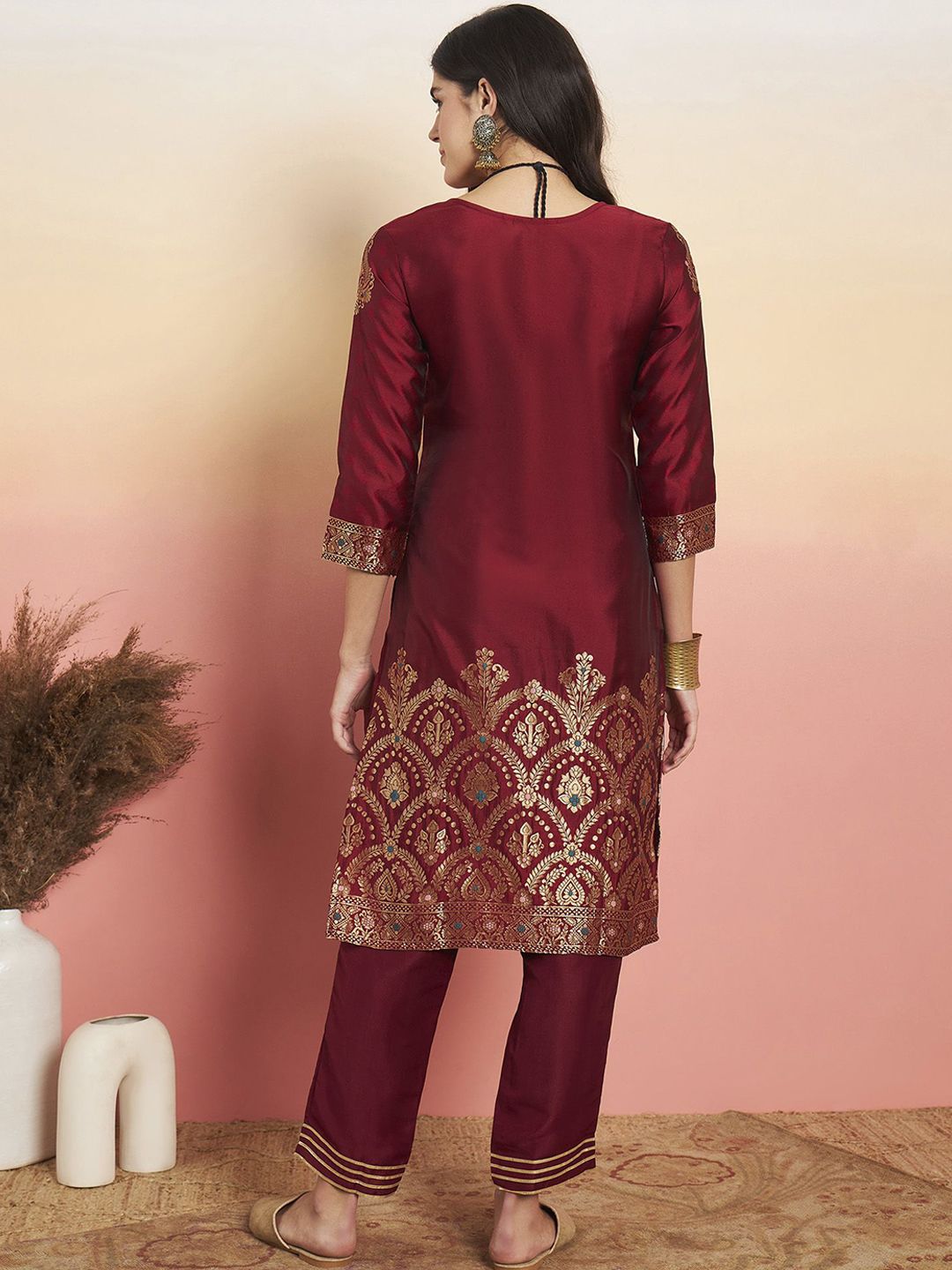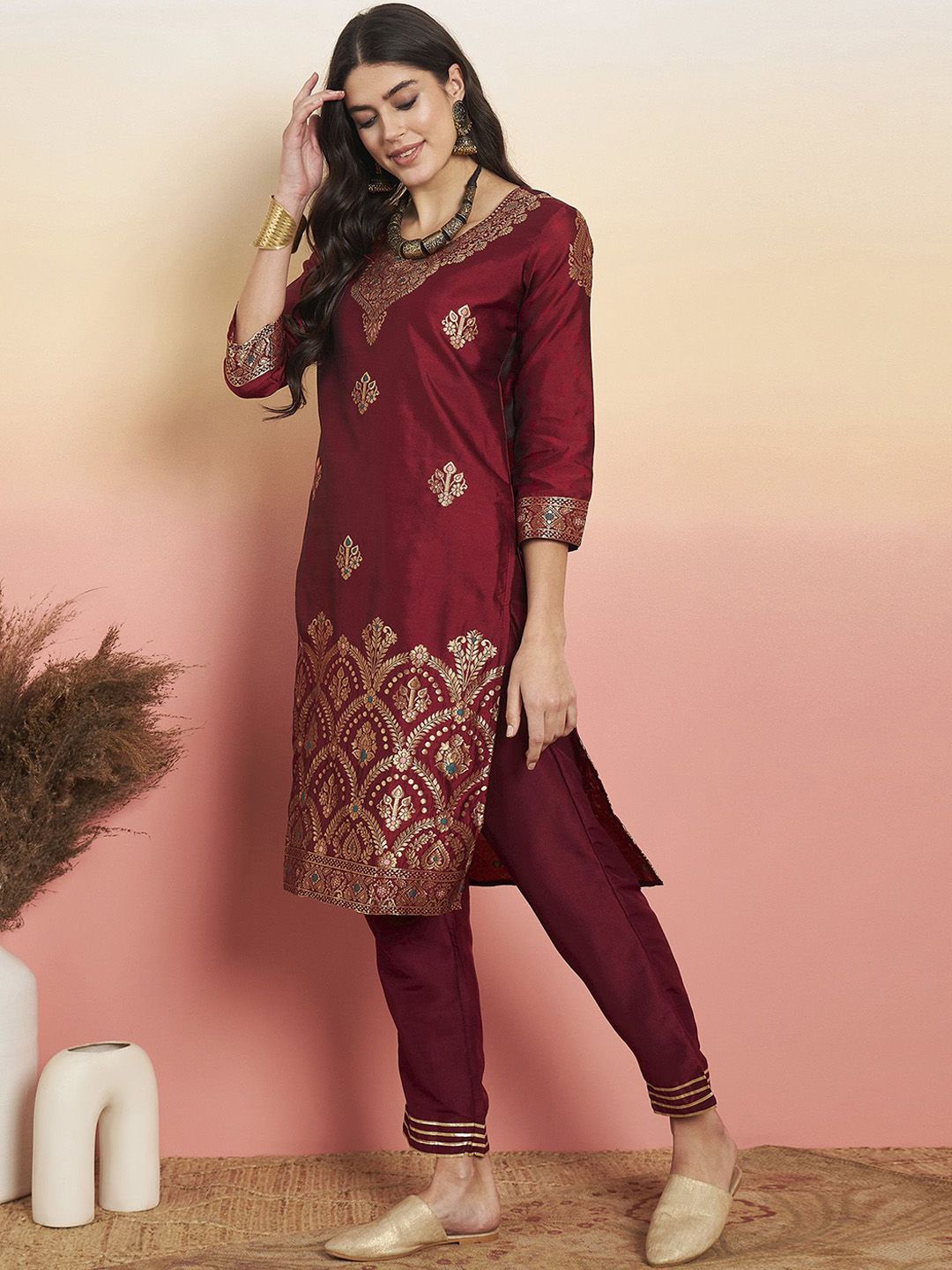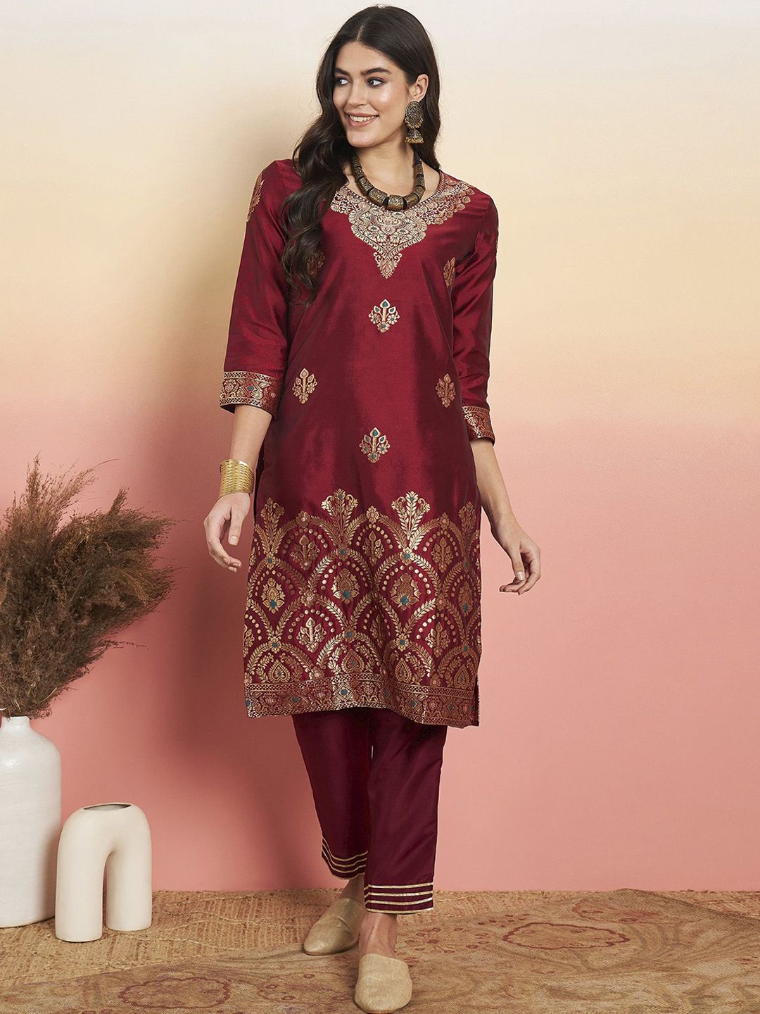 Anouk Woven Design Straight Kurta With Palazzos