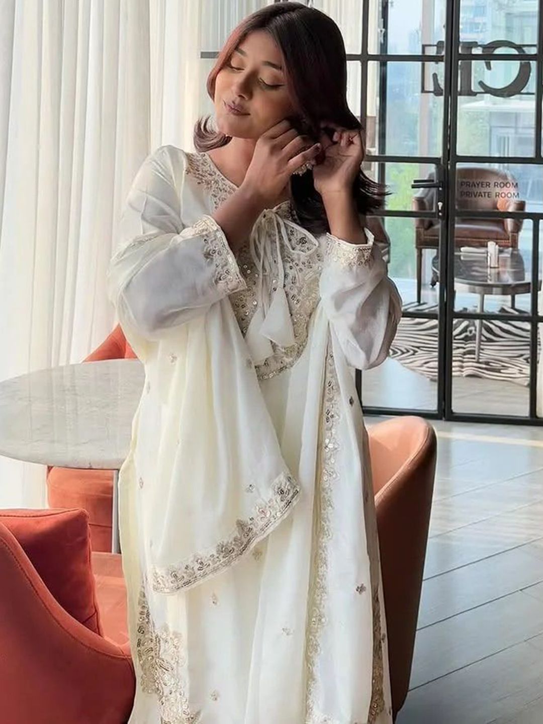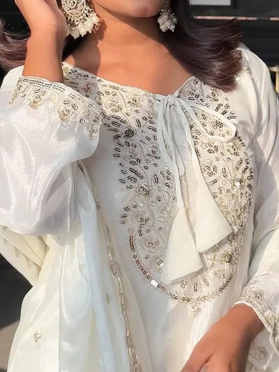 ANVERI TEXTILES Floral Embroidered Sequinnned Straight Pure Silk Kurta Palazzo & Dupatta