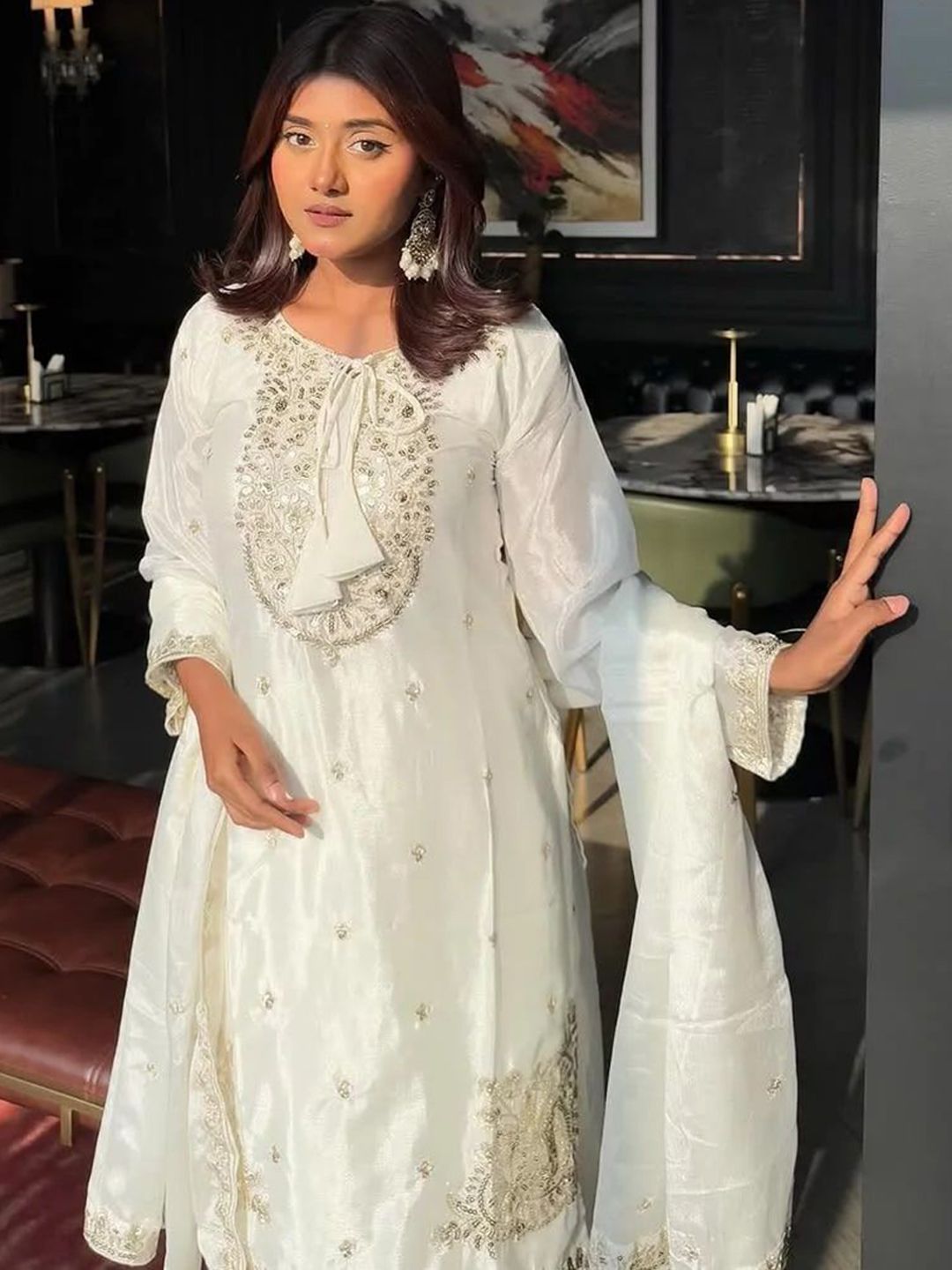 Buy this stylish ANVERI TEXTILES Floral Embroidered Sequinnned Straight Pure Silk Kurta Palazzo & Dupatta at Marincart Nepal. This product offers great quality and value. Perfect for those looking for the latest trends in fashion. Get yours now at unbeatable prices.