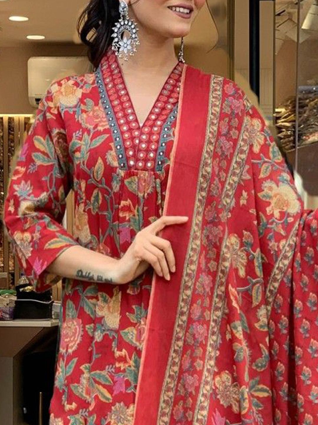 Art Avenue Floral Printed V-Neck Mirror Work Pure Cotton Kurta With Palazzos & Dupatta