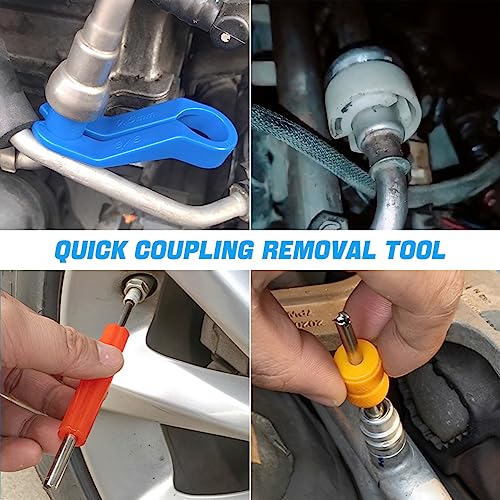 ?Quick Disconnect Tool?: This is a car air conditioning fuel line disconnect tool and valve core removal tool set, mainly used to separate car air conditioning and fuel line and dual head valve core removal. Professional design, can quickly complete the disassembly work.     ?Wide Application?: This 16 piece disassembly tool set can be widely used for 7 sizes of lines: 1/4", 3/8", 1/2", 5/8", 3/4", 7/8", 5/16". Fits most fuel, AC, air and oil, radiator and heater hoses.     ?Package Included?: You will get 7 pieces AC fuel line disconnect tool set, 7 pieces line quick connect release tool, 1 piece yellow dual head valve core remover, 1 piece red dual head valve core remover, total 16 pieces. A complete assortment and quantity, a ideal choice for you.     ?High Quality Material?: Made of sturdy ABS plastic, reliable material, not easy to bend, deform or break. High quality material, resistant to wear and tear, can complete long-term disassembly and repair work. Light weight and small size, easy to carry and fit in your pocket.     ?Orderly Storage?: The grip is polished smooth, easy to grip and use. They are stored in an orderly manner by a transparent box (8.1" x 4.7" x 1.2"), the tools are clearly engraved with dimensions, you can quickly identify and take the tools you need, easy to store and carry.