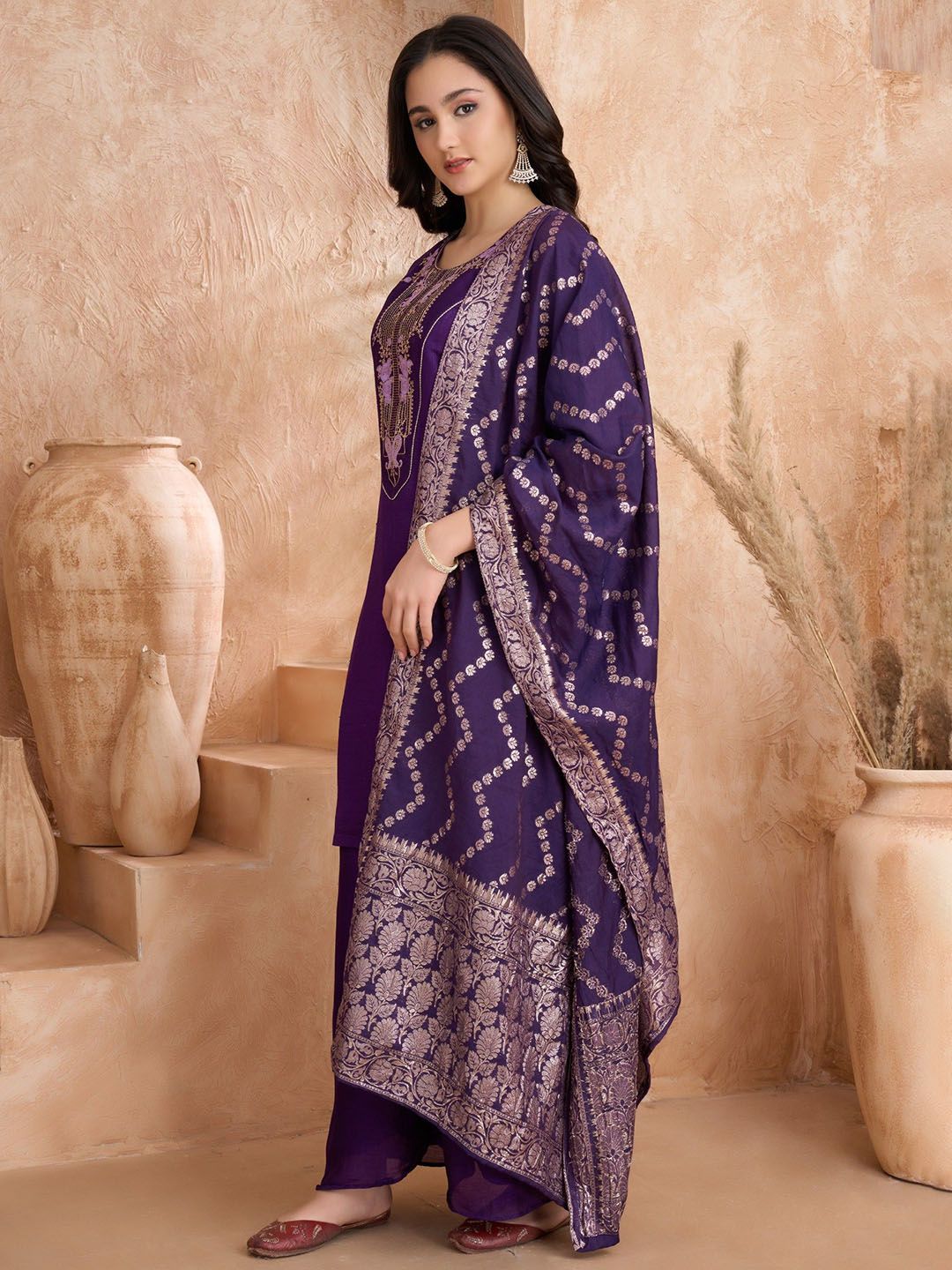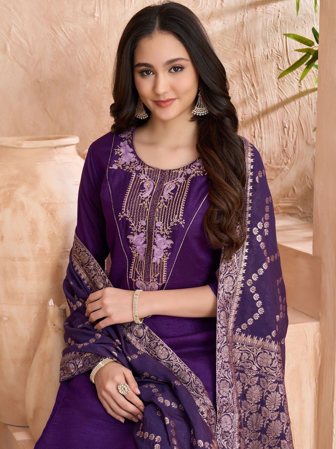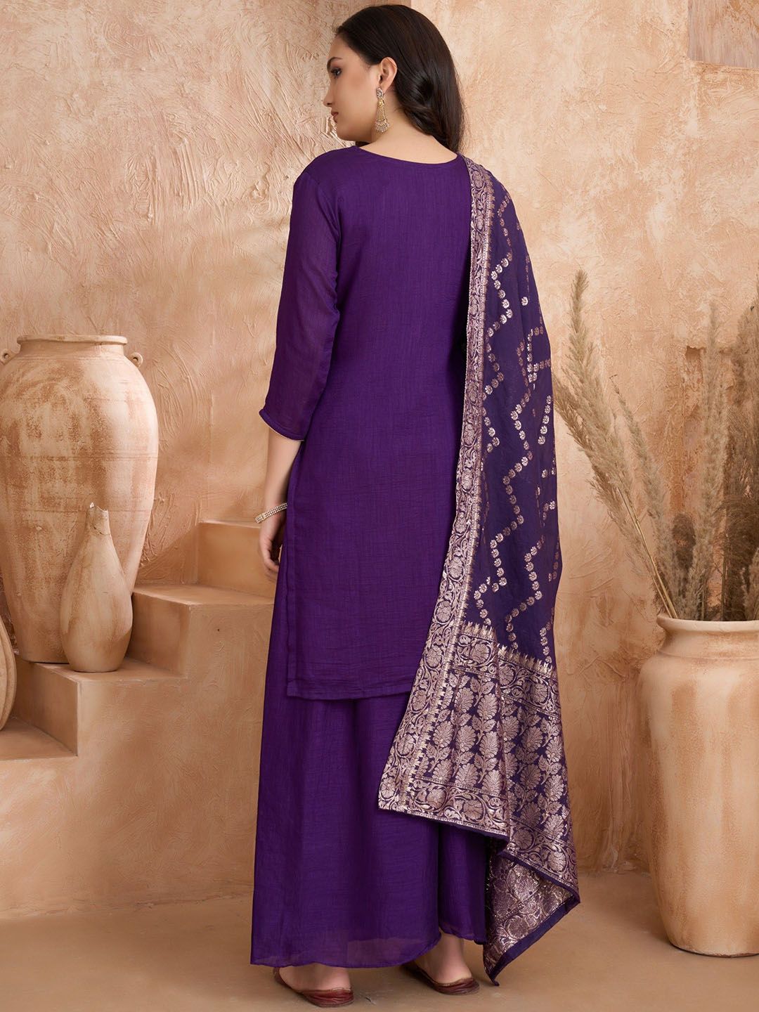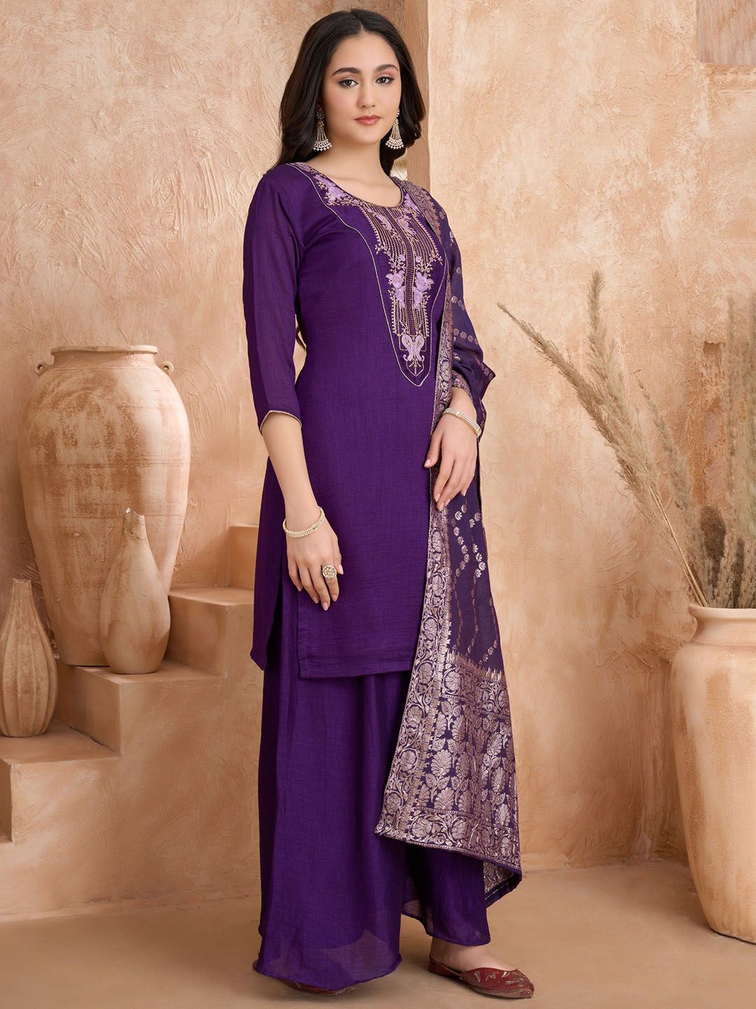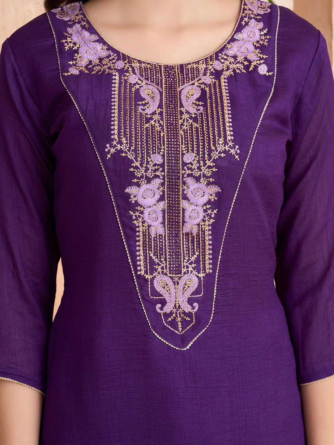 Aumira Floral Embroidered Thread Work Straight Kurti With Palazzos & Dupatta