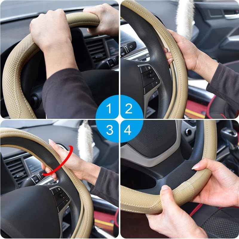 INCREASED SAFETY:- Skid proof, stable, heat resistant, A better grip on the steering wheel gives you more control on the road. The slim design restores the grip of the bare car, and the tight fit brings a better feel. The inner side is made of rubber and added with non-slip plaid, which can be firmly stabilized on the steering wheel. Make you journey safer and more assured. Easy to Install,Because of the ductility material, Any adult can easy install this steering wheel cover, no tools required. CUSTOM FIT FOR YOUR CAR: Car Specific Steering cover so you could choose right cover as per your car.
