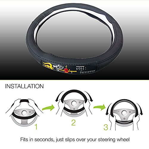 WELL-PADDED & STRESS RELIEF: Pleasantly soft microfiber leather filling with Thick foam, provides the perfect way for you to relieve stress during any drive of any distance. BREATHABLE & HIGH DURABILITY: This steering wheel cover is made of perforated microfiber leather that allows air to pass through it easily, so that protects your hands from extreme hot summer and cold winter. EASY to INSTALL: The virtually odor-free inner core allows for unexampled flexibility. Steering wheel cover slips right over your steering wheel for a super easy installation. Preheating with the hairdryer or in the sun will make it easier to install. RACING STYLE: Get the racing look you want while adding style, comfort, and protection to your daily drive, is perfect for anyone inspired by the racing lifestyle. Anti-slip Design - The 3D design contour along the side provides extra control for bumpy roads and hazardous conditions