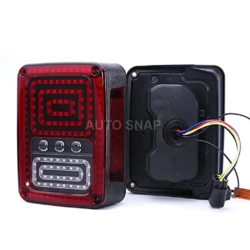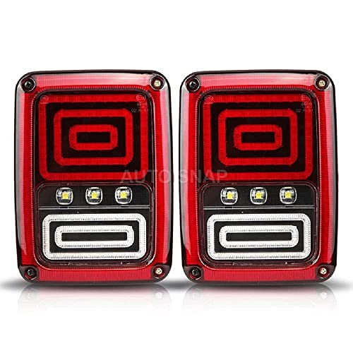 RELIABLE: AUTO SNAP LED tail light with durable black ABS housing and PMMA lens, Quake-proof, Anti-corrosion and waterproof, much brighter to Lower powered consumption; Much brighter to make driving much safer Installing easily: No drilling, take screws unscrews and then plugging in the OEM holes, plugging and playing no resistor needed HIGH PERFORMANCE CREE LED Chip: Our taillights are more brightness and endurance than factory bulbs. Bringing an exquisite style Used as a turn signal light, brake light, back up reverse light and running light and Improved luminance to the back of your JK.