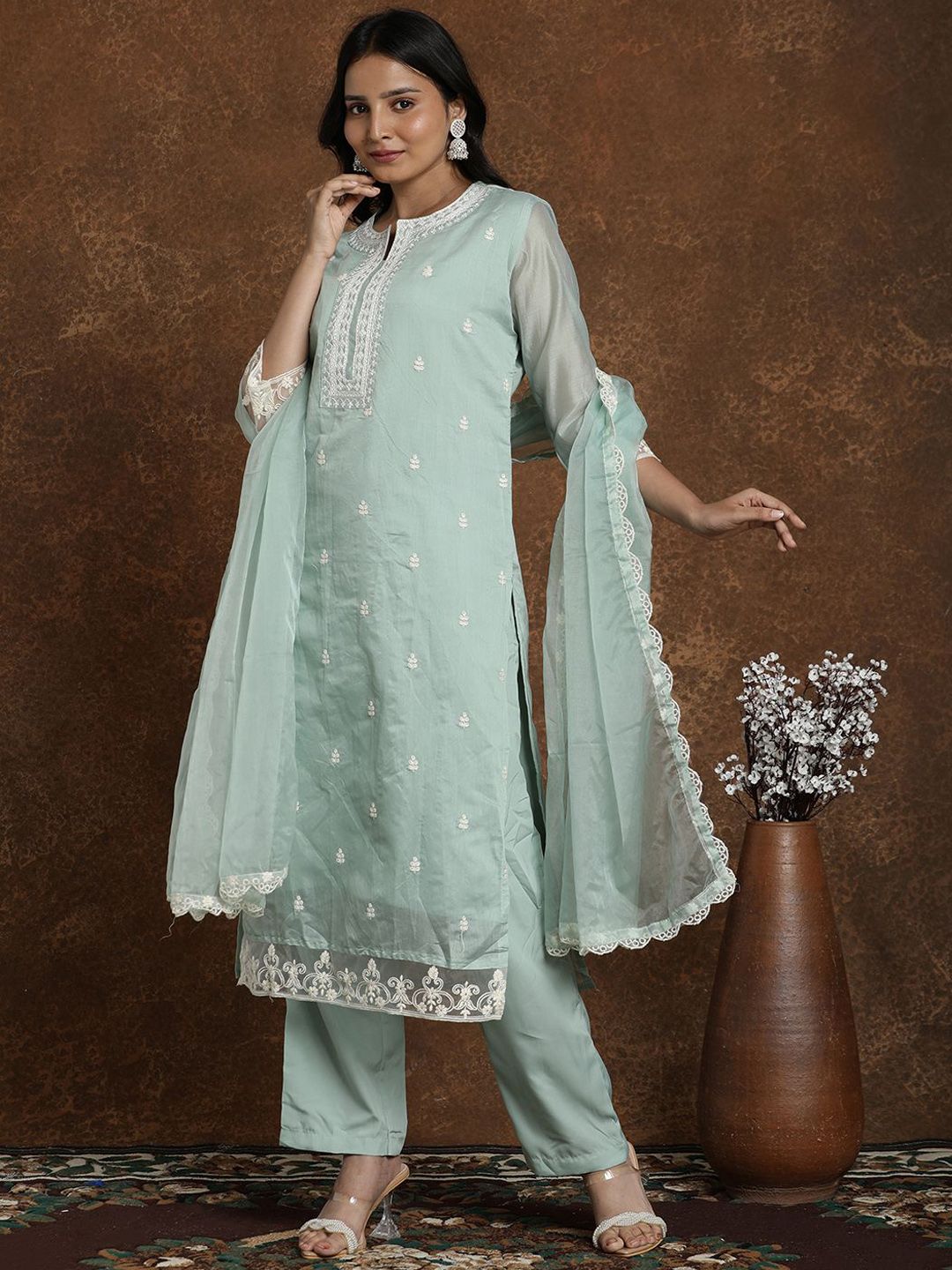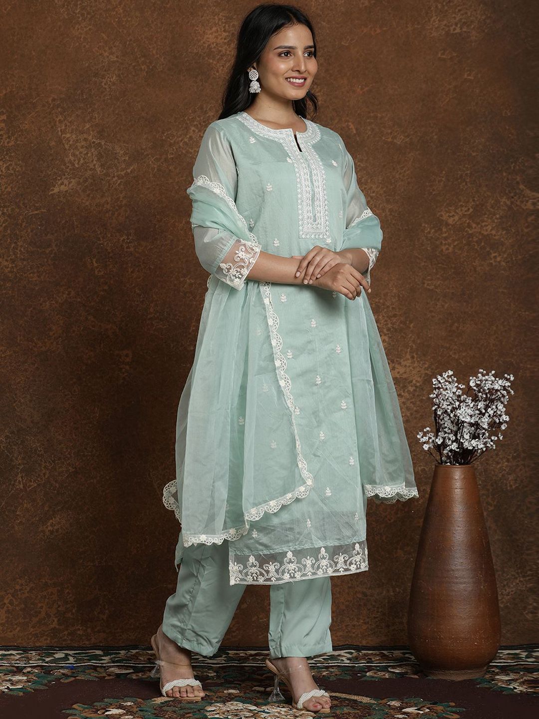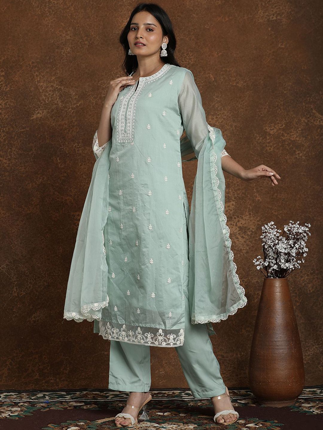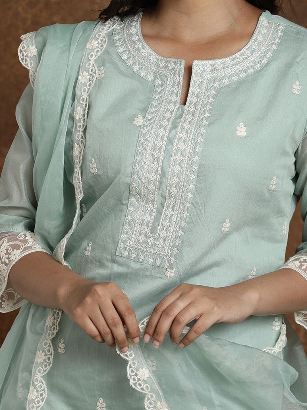 AVANSHEE Floral Embroidered Thread Work Chanderi Cotton Kurta With Trousers & Dupatta