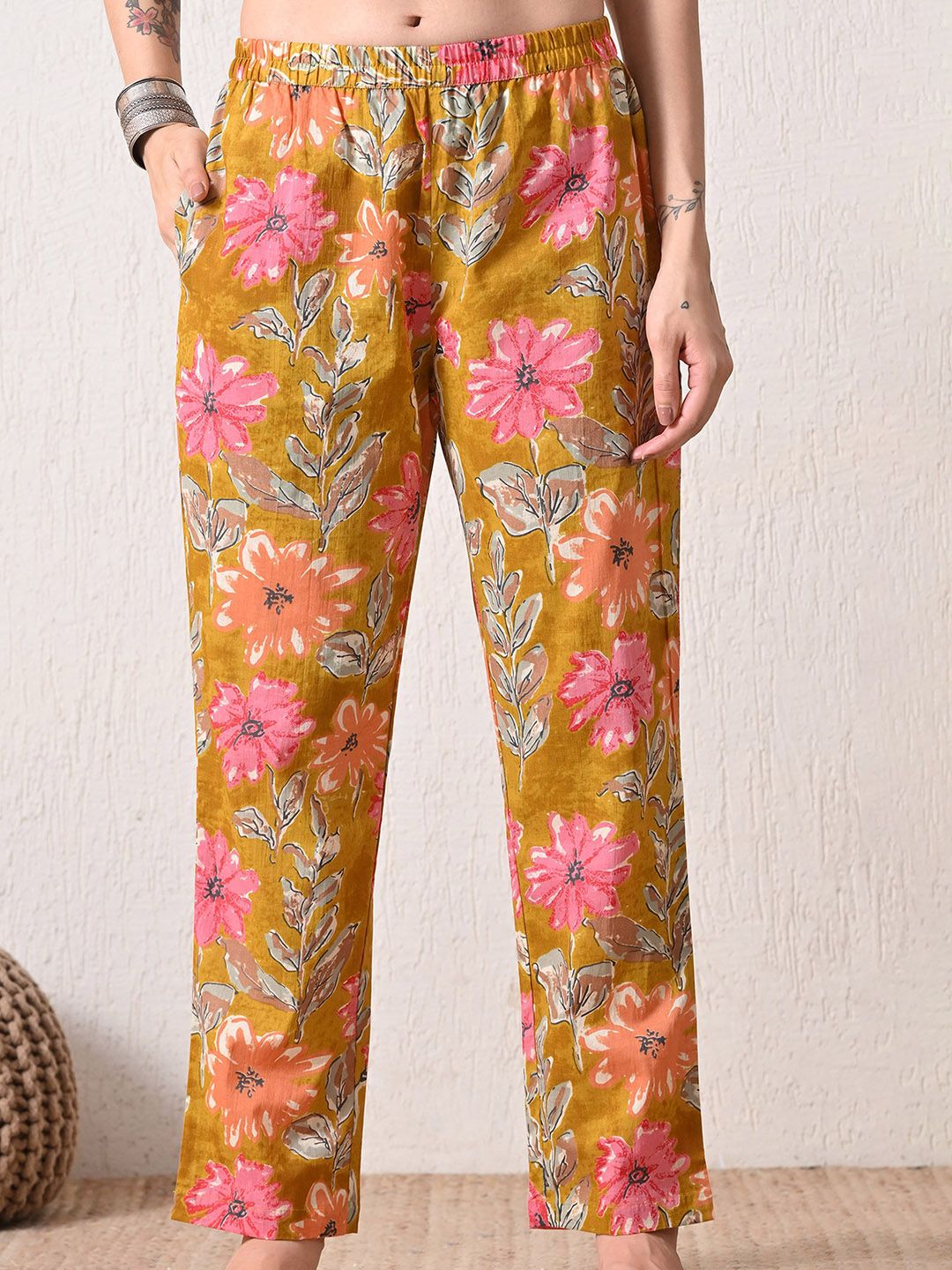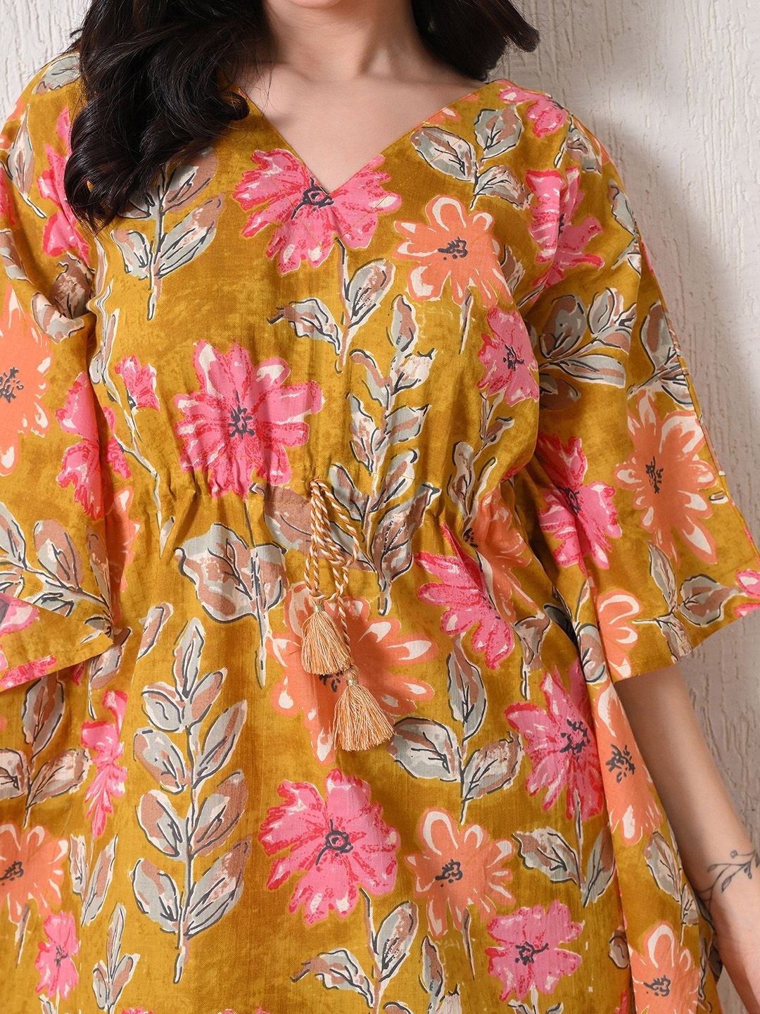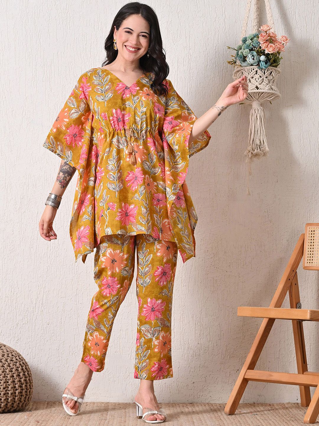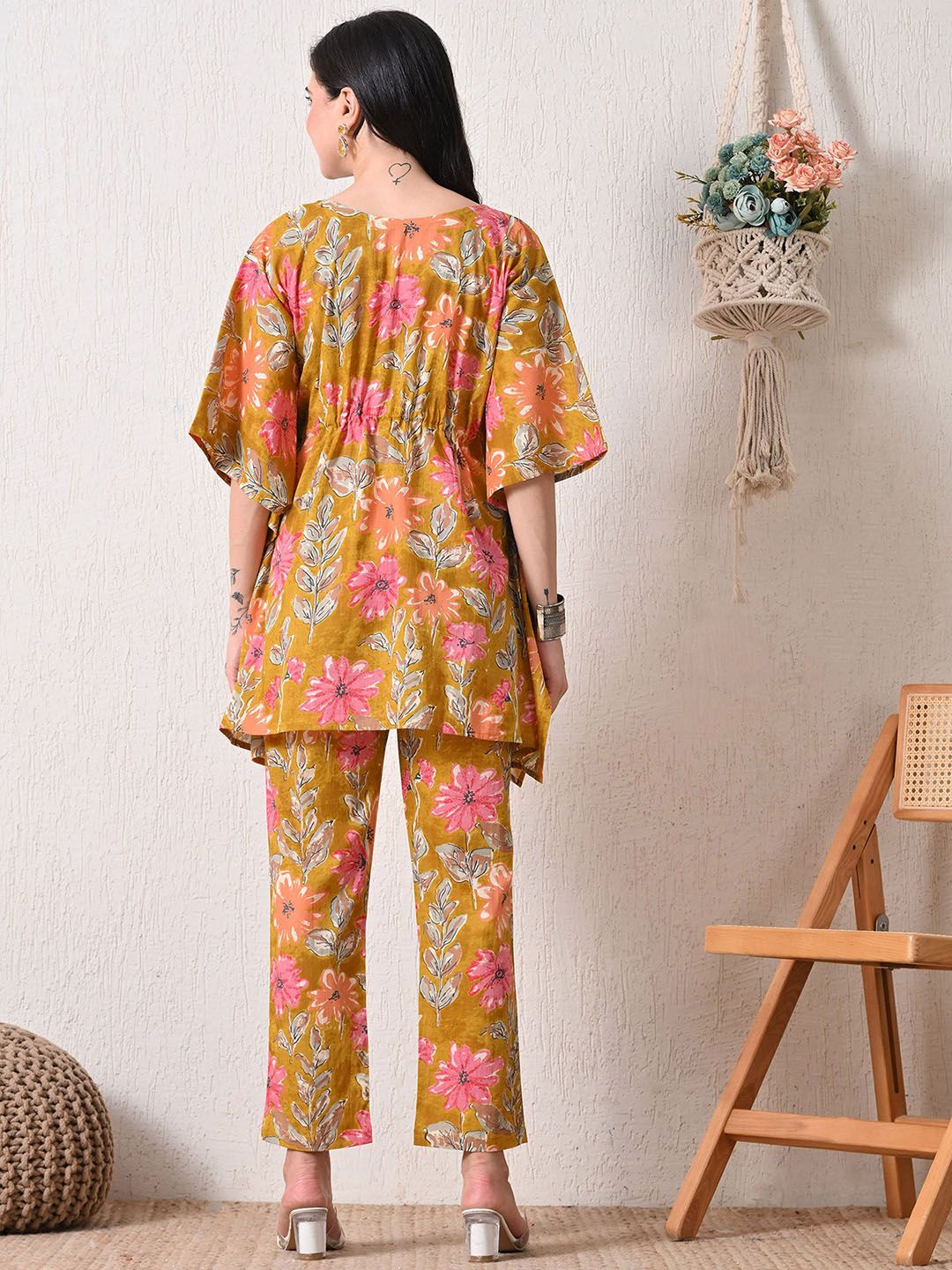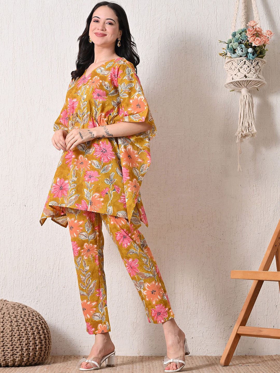 AVYCO Women Floral Printed Cotton Kaftan Kurta with Trousers