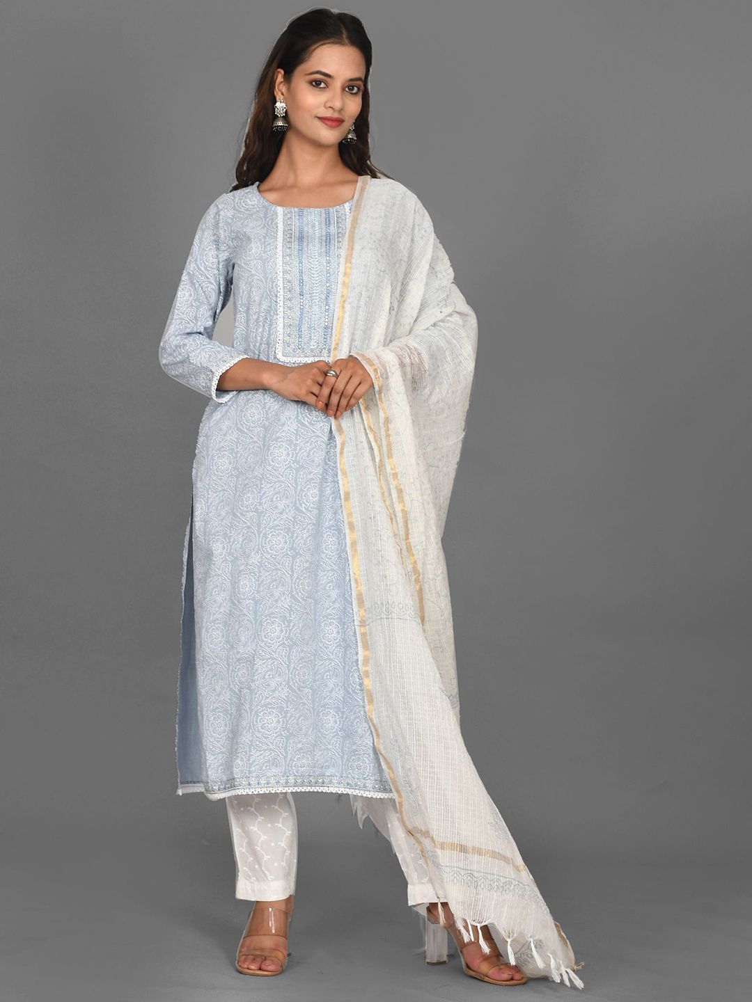 BAESD Floral Printed Round Neck Thread Work Pure Cotton Kurta With Trousers & Dupatta