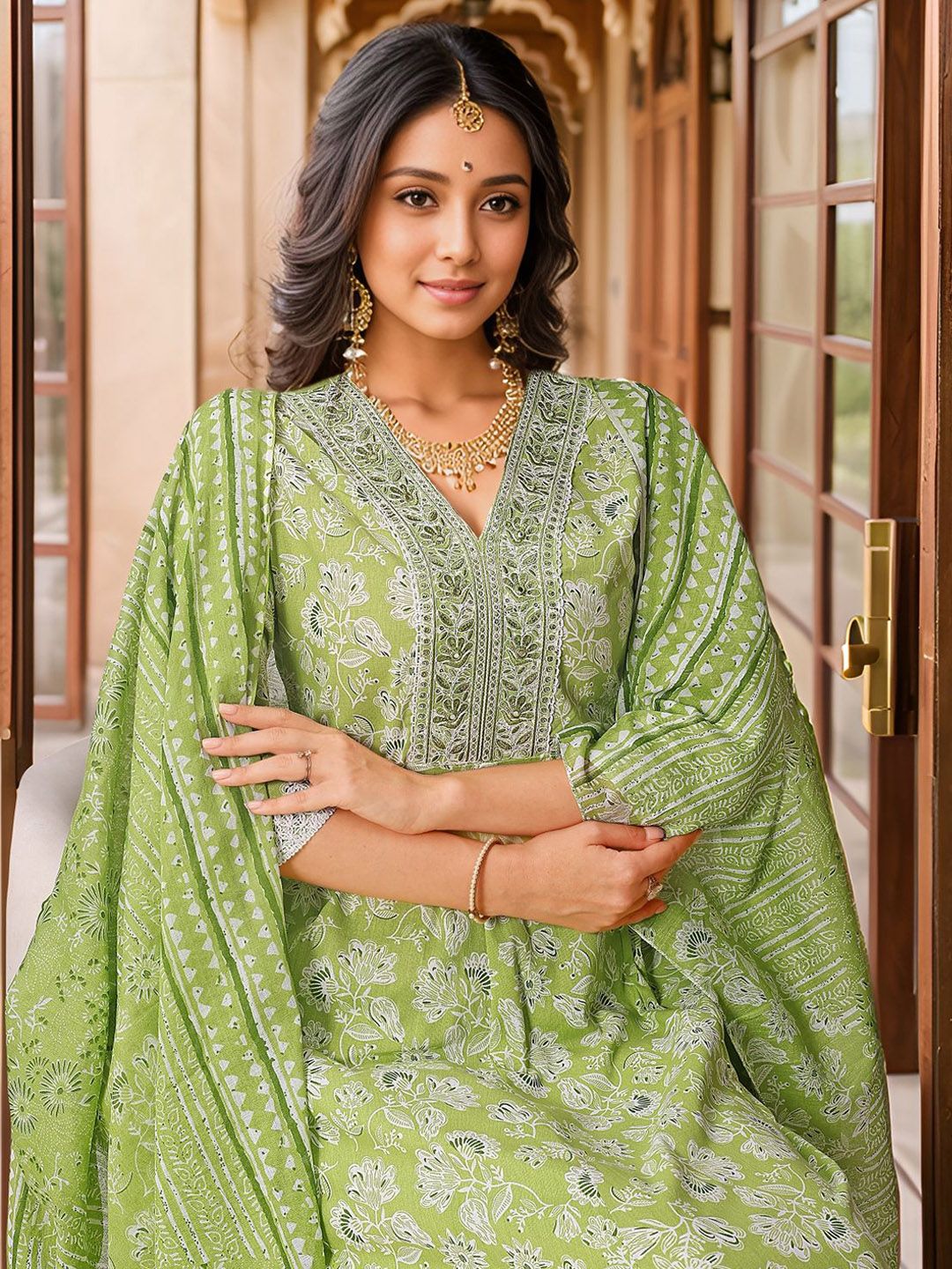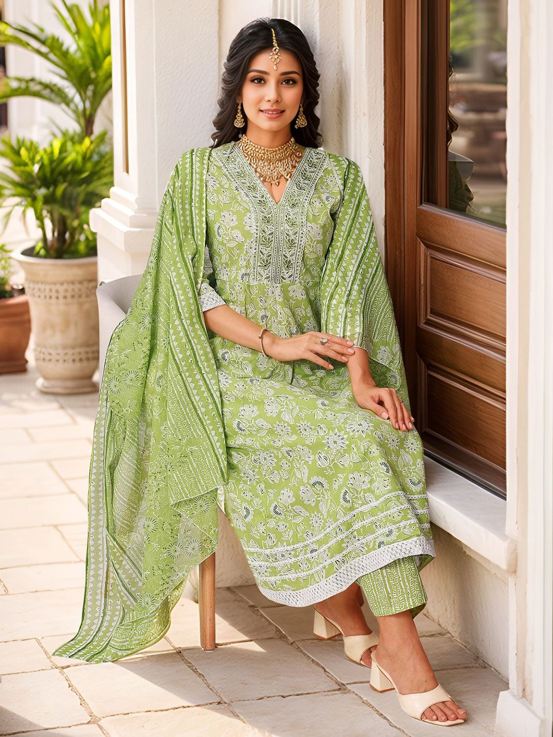 Banwaree Floral Printed Thread Work Pure Cotton Anarkali Kurti With Trousers & Dupatta
