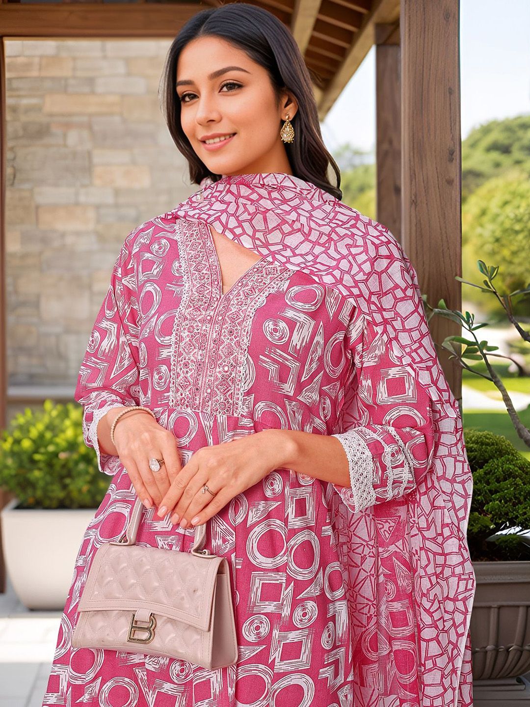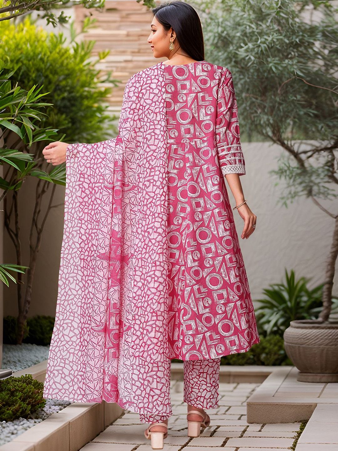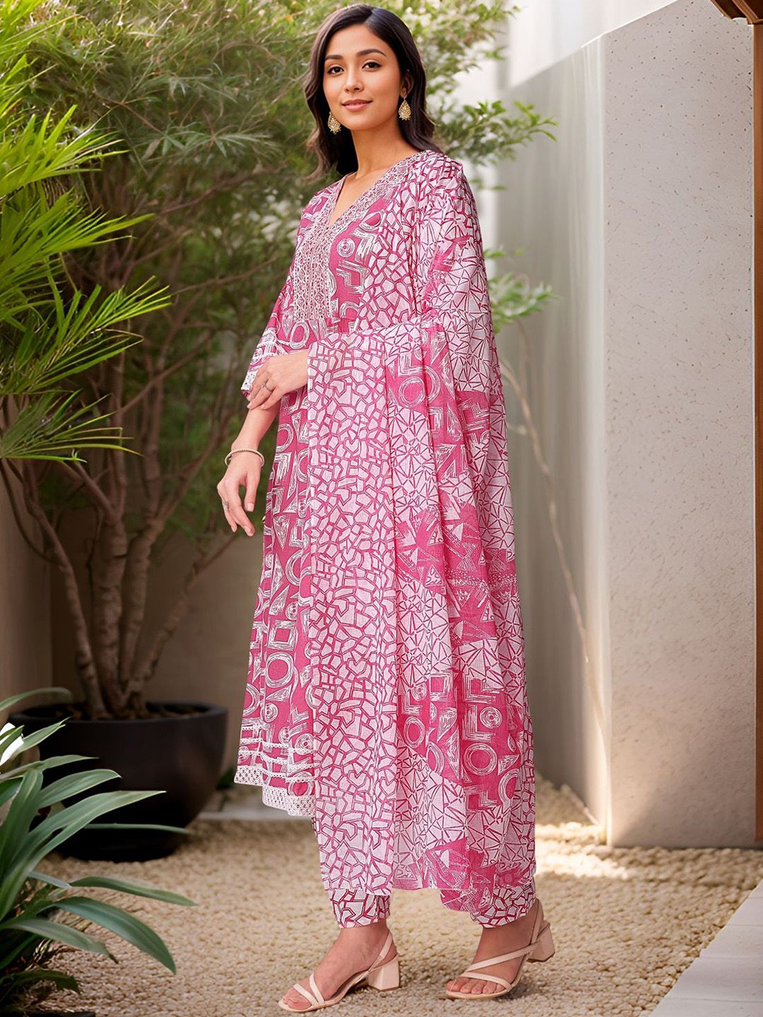 Banwaree Geometric Printed Thread Work Pure Cotton Anarkali Kurti With Trousers & Dupatta