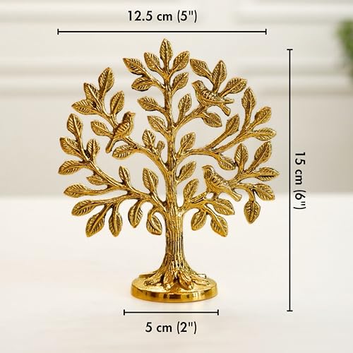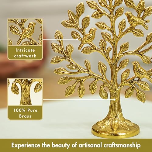 PURE SOLID BRASS CRAFT: Made from 100% pure brass with a rich golden finish. Durable, tarnish-resistant, and handcrafted to last for generations. SYMBOL OF ABUNDANCE & WISH-FULFILLMENT: Inspired by the sacred Kalpavriksha Tree of Life, believed to bring prosperity, wisdom, and fulfillment of desires. DETAILED HANDWORK WITH BIRDS: Intricately hand-carved with delicate branches and small birds perched on them-adding charm, symbolism, and artisan elegance. COMPACT & VERSATILE SIZE: 6" tall (15 cm), perfect for altar setups, work desks, console tables, or meditation corners. Lightweight yet visually striking. VASTU & FENGSHUI POSITIVITY: Enhances the energy of any space-ideal for attracting harmony, abundance, and spiritual growth in both homes and offices. MEANINGFUL GIFT IDEA – A beautiful and thoughtful gift for housewarming, Diwali, weddings, or festive occasions—comes safely packed for gifting in a giftable box.