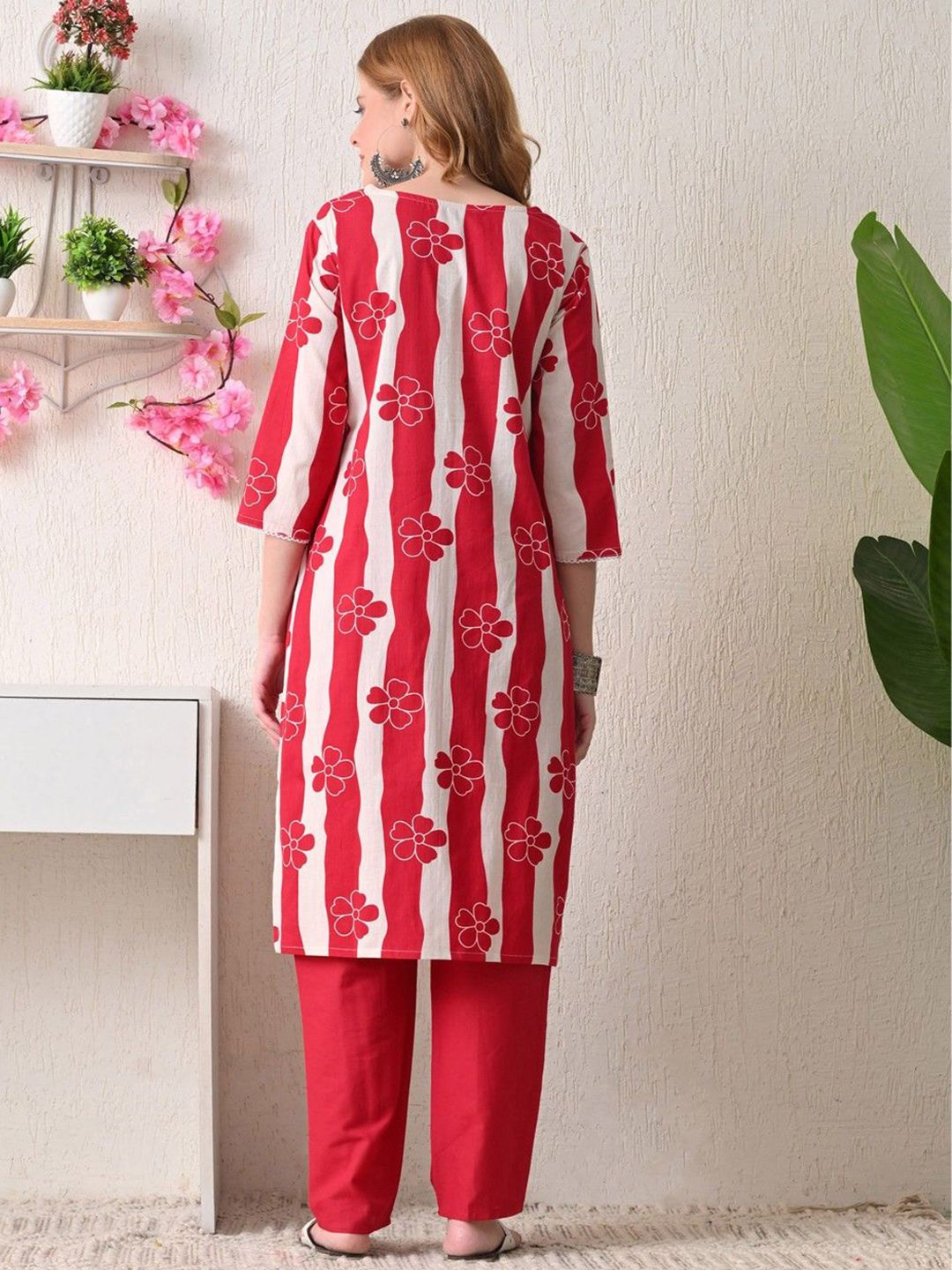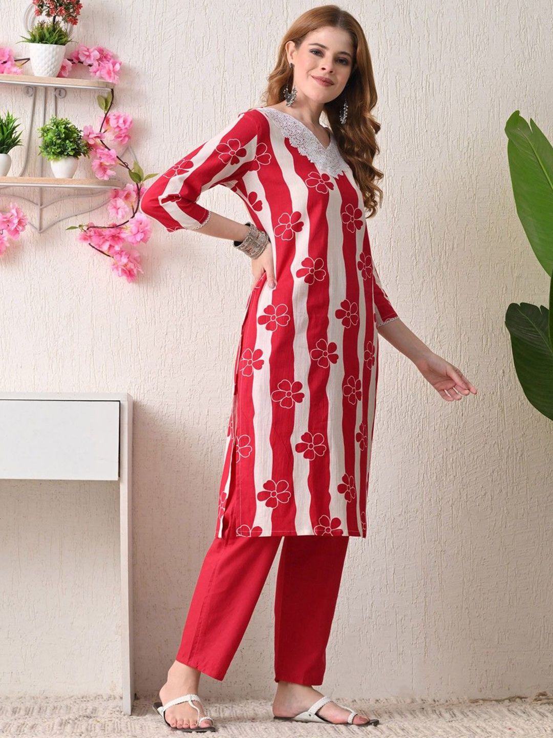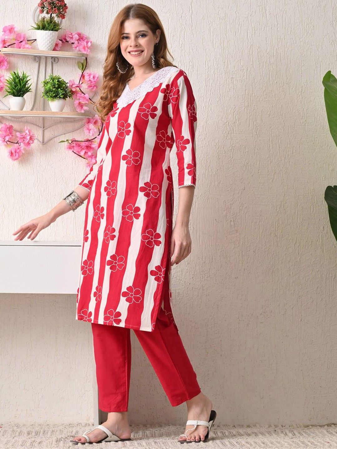 BKApparels Women Floral Printed Lace Detail Pure Cotton Kurta with Trousers