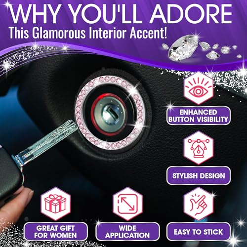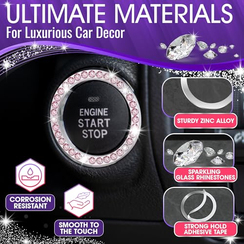 Bling Car Decor Crystal Rhinestone Car Bling Ring Emblem Sticker, Bling Car Accessories for Auto Start Engine Ignition Button Key & Knobs, Bling for Car Interior, Unique Gift for Women (Pink)
