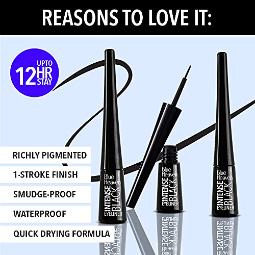 Waterproof and Smudge-proof: Blue Heaven Intense Glide On Eyeliner formulated to be waterproof and smudge-proof, ensuring your eye liner stays in place all day without fading or transferring. Long-lasting Wear: This liquid eyeliner provides upto 12hours of wear without the need for touch-ups, perfect for busy days or special occasions. This liquid eyeliner designed for easy and precise application, allowing you to create various eyeliner looks effortlessly. Intense Black Pigment: Boasts intense black pigment for bold and dramatic eye looks that make a statement. This Eyeliner is formulated with intense pigment to give you smooth one stroke application and be playful with your eye makeup. Versatile Use: This waterproof eyeliner is suitable for creating various eyeliner styles, including winged, cat-eye, or simple everyday looks.