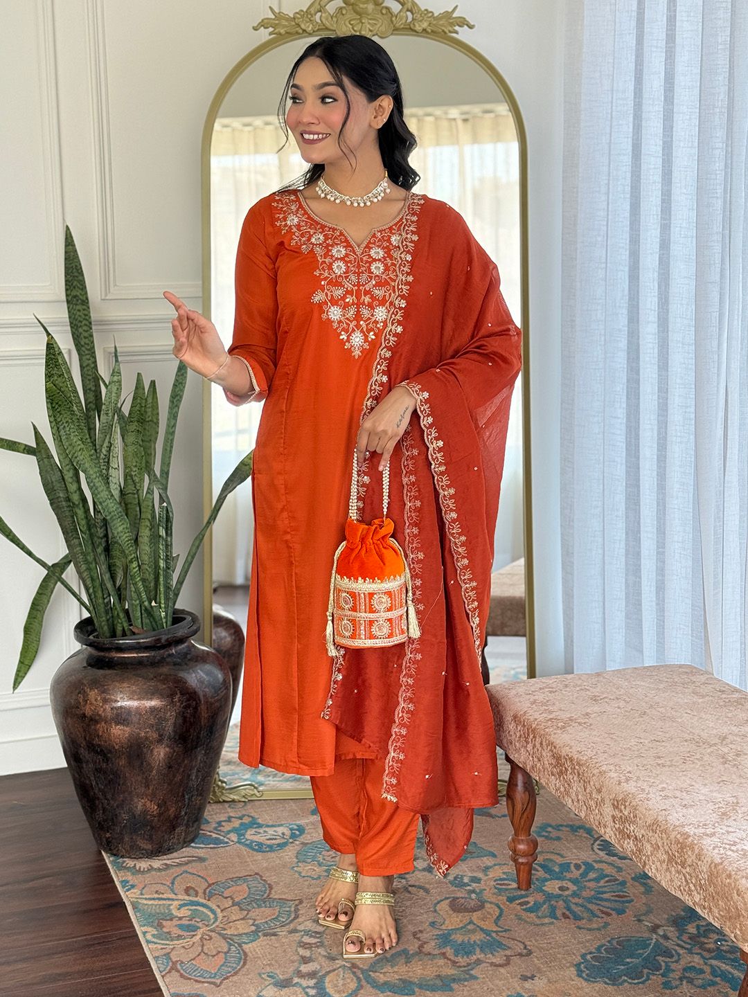 BlueRang Floral Yoke Design Notch Neck Chanderi Silk Straight Kurta With Trouser & Dupatta