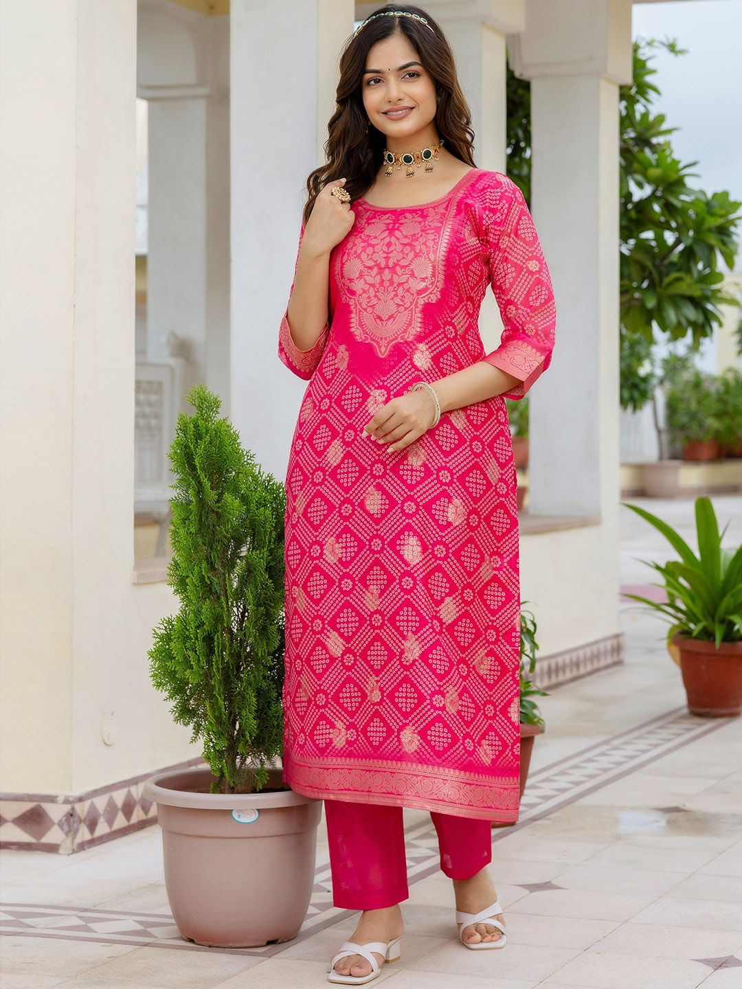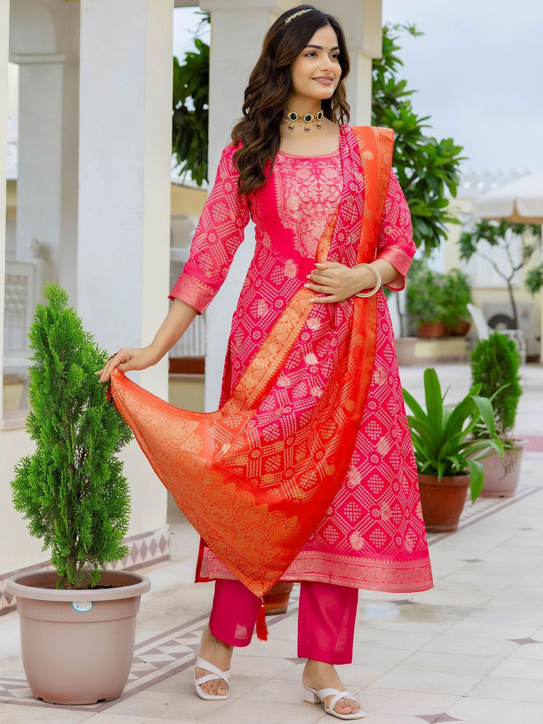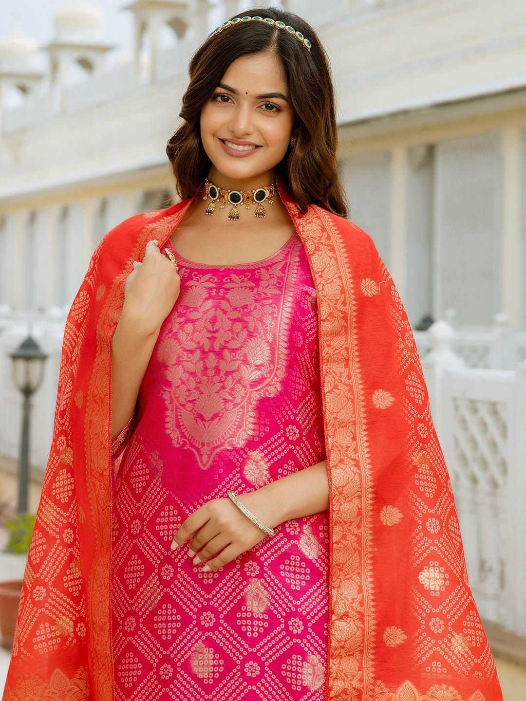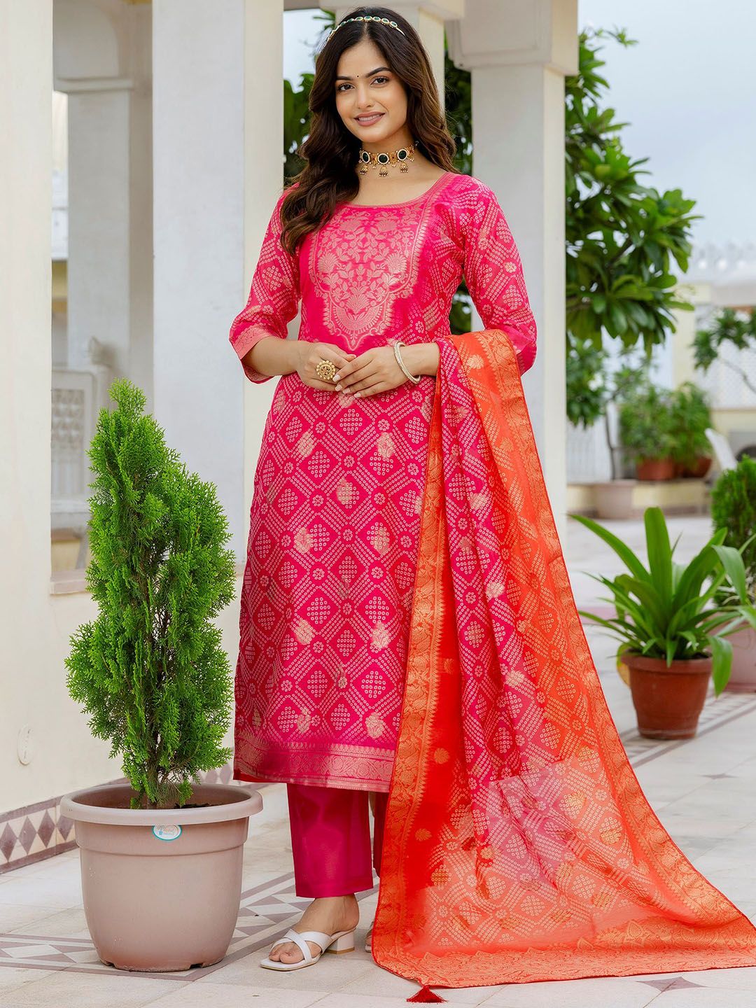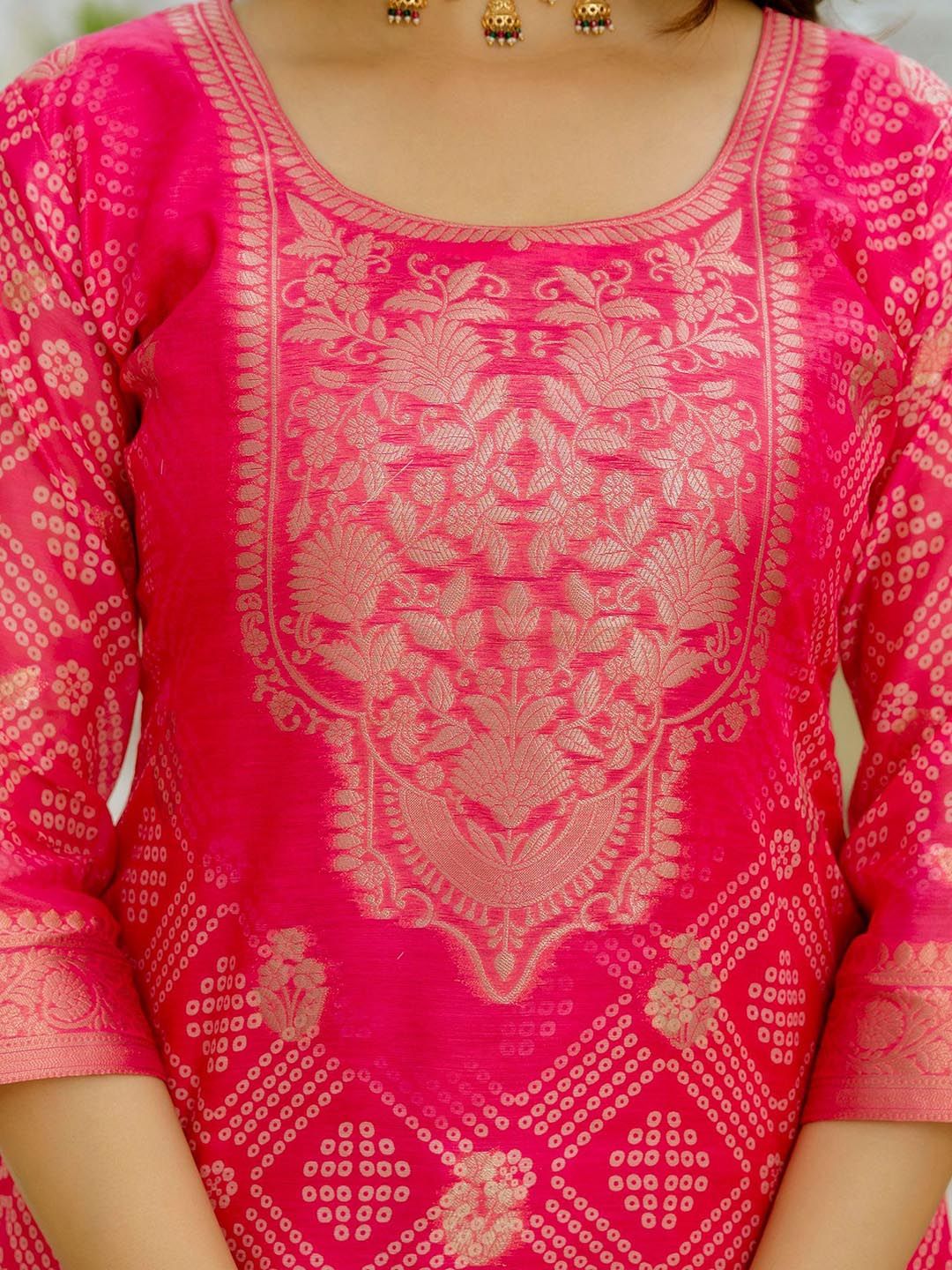 Brand Hill Bandhani Woven Design Round Neck Zari Straight Kurta With Trousers & Dupatta
