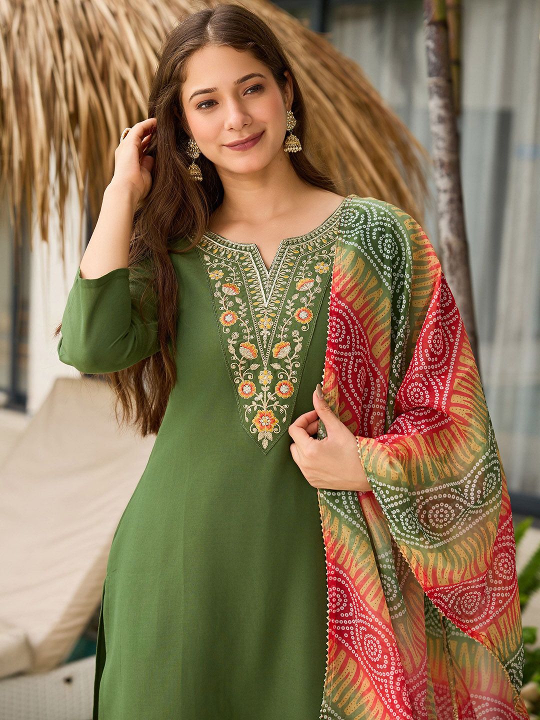 Brand Hill Bandhani Yoke Design Notch Neck Thread Work Kurta With Trousers & Dupatta