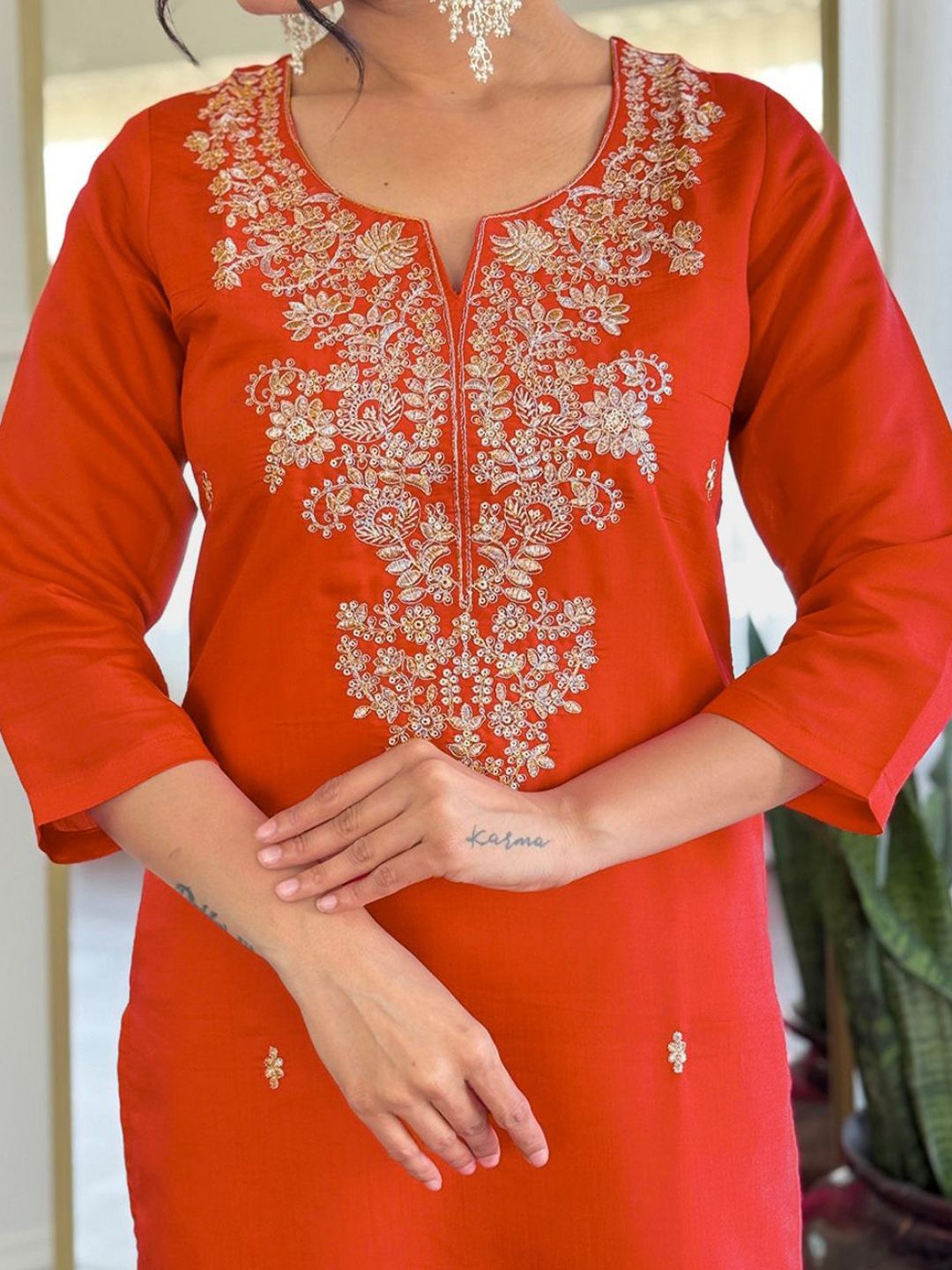 Brand Hill Embroidered Notch Neck Sequinned Chanderi Silk Kurta With Trousers & Dupatta
