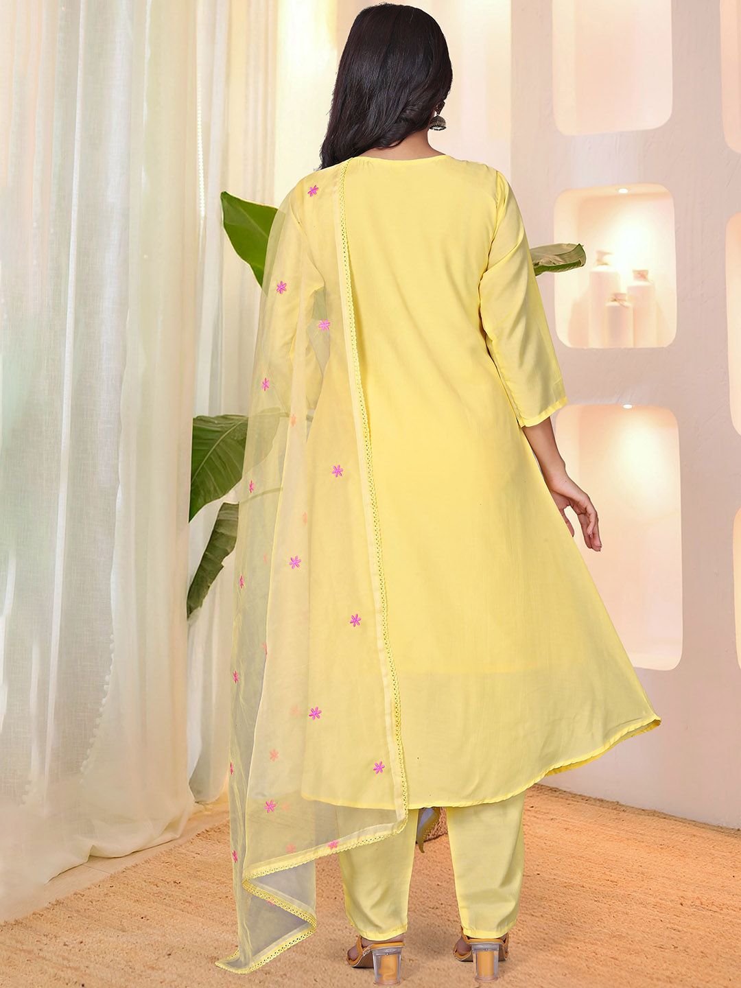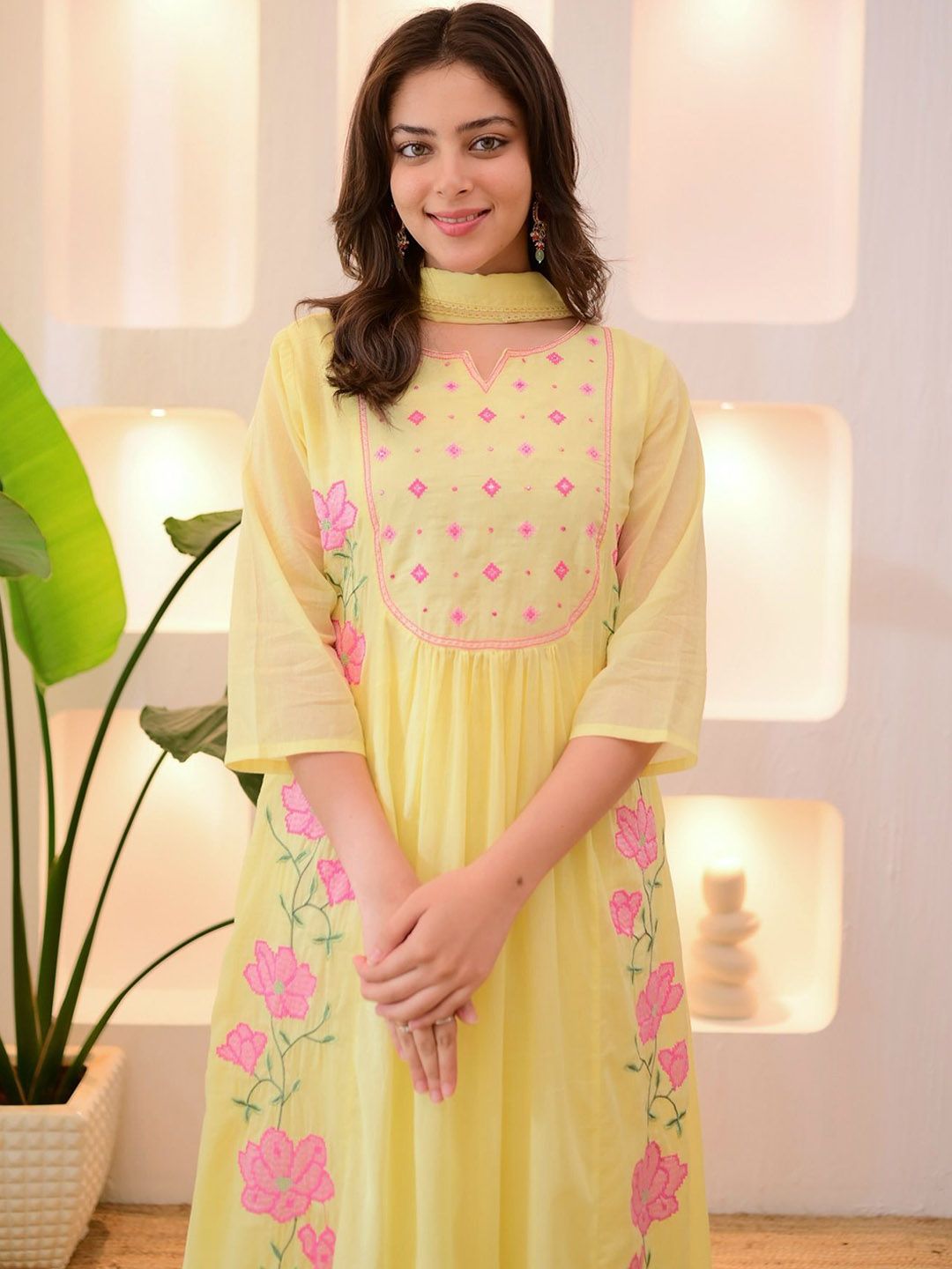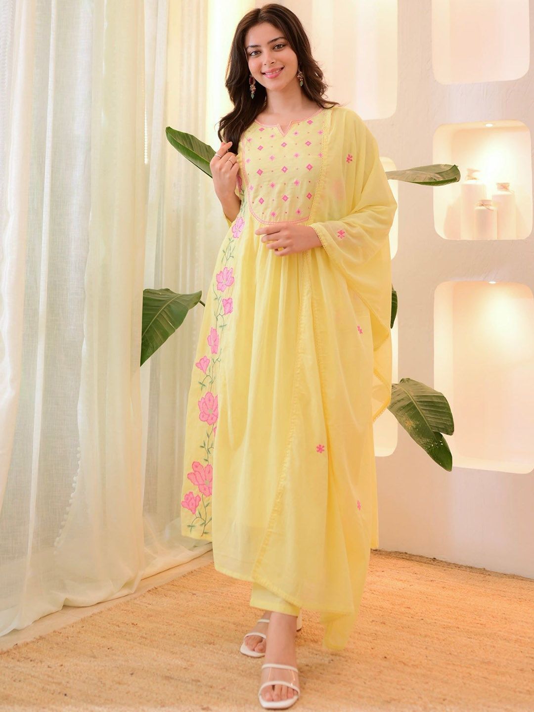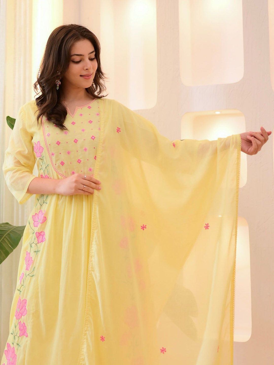 Brand Hill Floral Embroidered Notch Neck Thread Work A-Line Kurta With Trousers & Dupatta