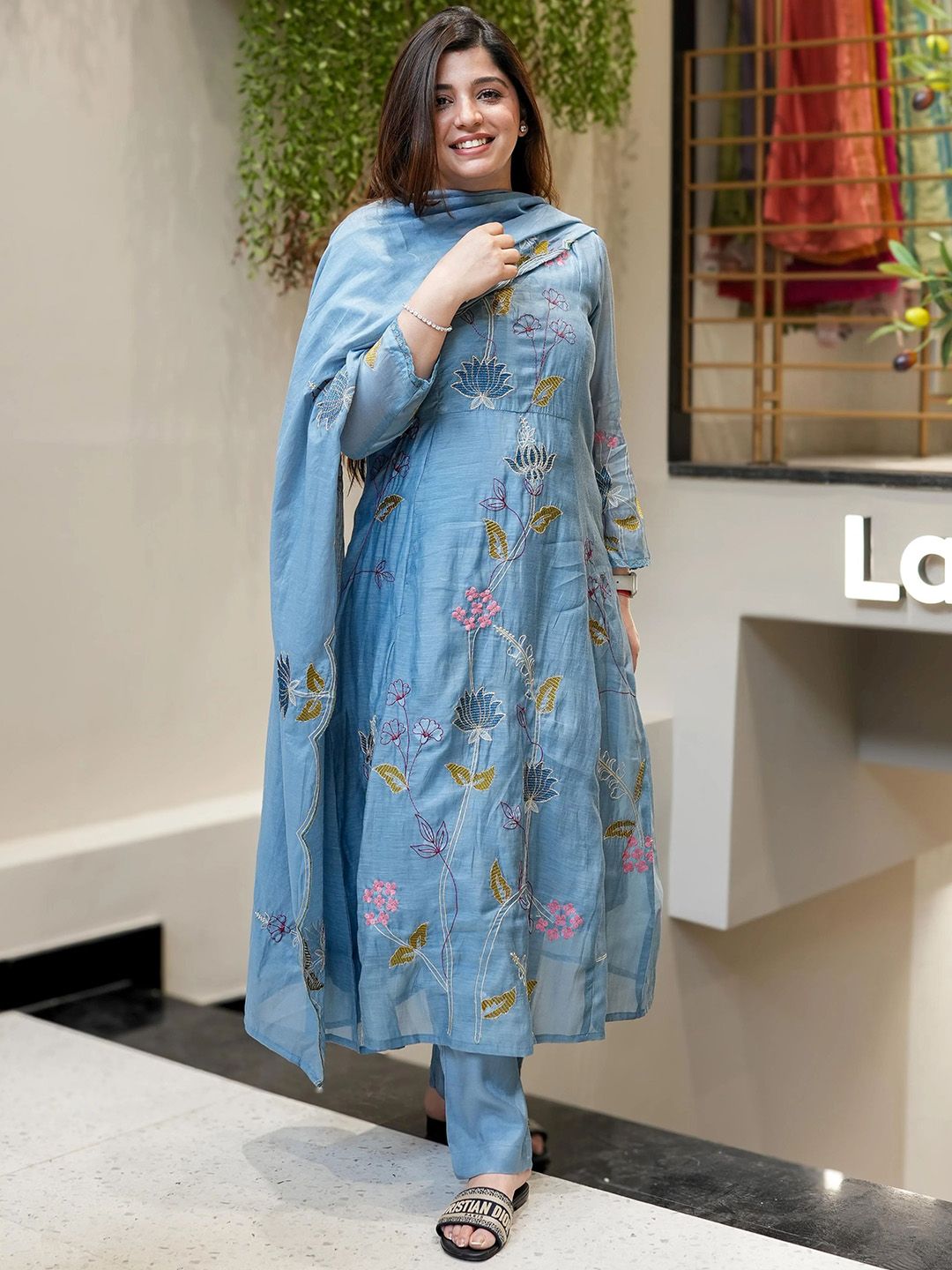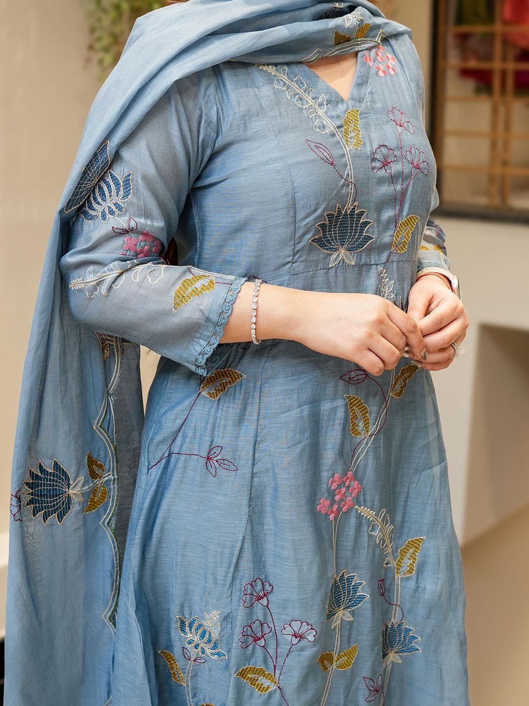 Brand Hill Floral Embroidered V-Neck Thread Work Pure Cotton Kurta With Trousers & Dupatta
