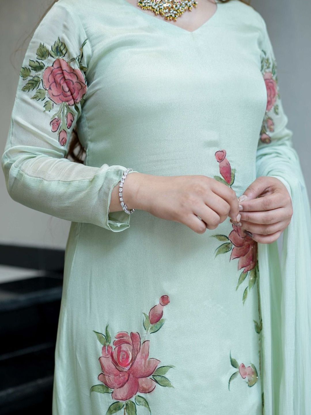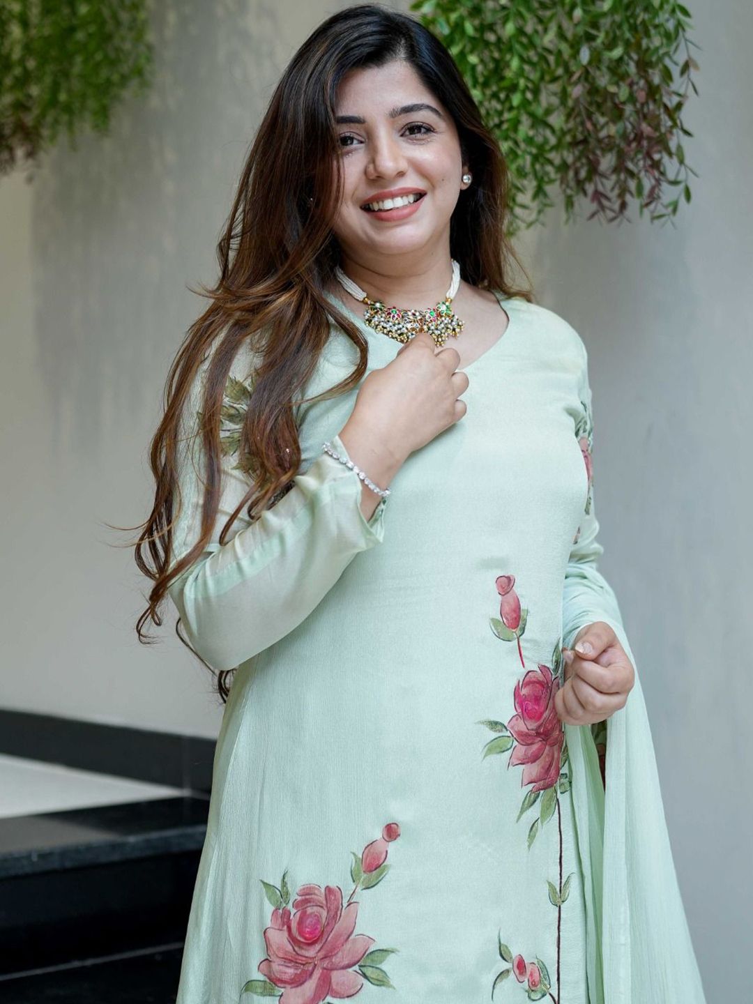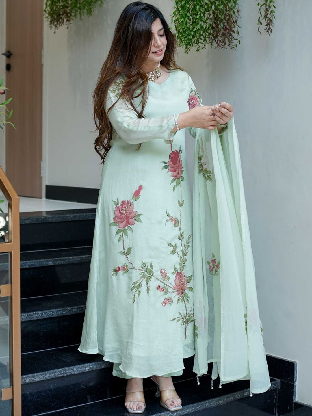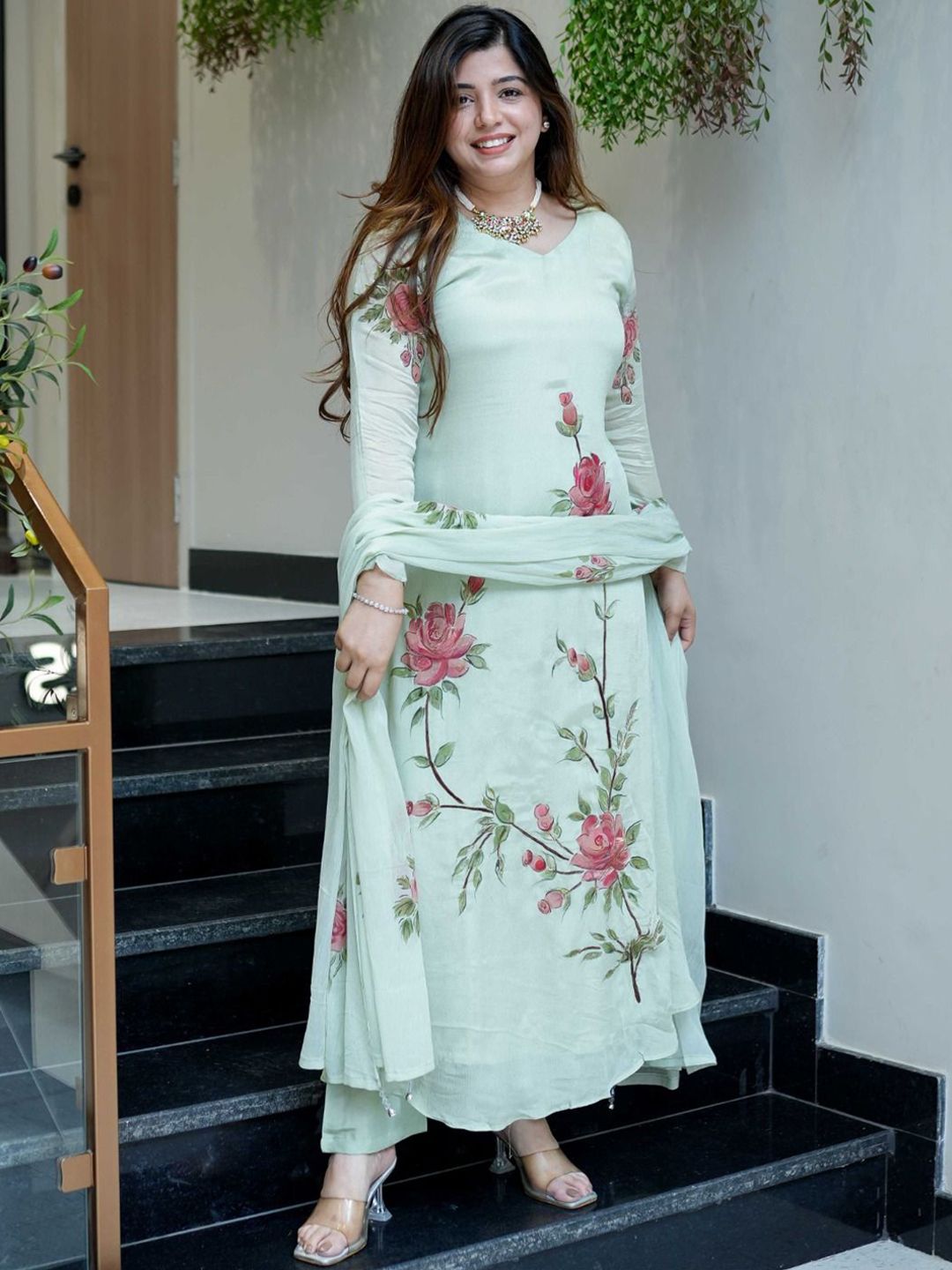 Brand Hill Floral Printed V-Neck A-Line Kurta With Trousers & Dupatta