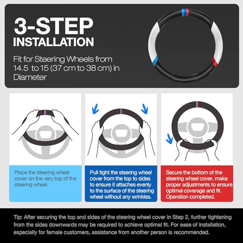 High-quality materials: The steering wheel cover is made of high-grade leather, super soft, comfortable, durable, cold and heat-resistant, four-season universal, whether in the cold winter or hot summer does not affect the performance of this steering wheel cover. Fashion design: The cover selected high-grade bamboo charcoal leather, super flat interface process, combined with the ergonomic design principle of production, the style is new and unique, beautiful and fashionable, with breathable, sweat absorption, massage effect. Good anti-slip performance: Our steering wheel protector has a stylish streamlined three-dimensional shape, with efficient anti-slip play a real security role, and with anti-slip inner ring, effectively improve the anti-slip coefficient, for your safe travel escort! Easy and quick installation: This steering wheel cover is easy and quick to install, just warm up the steering wheel cover, and then slide it onto the steering wheel, light and not bulky. Universal size: Fits all medium size steering wheels, 14 1/2" to 15" (37 cm to 38 cm) in diameter, measure the steering wheel diameter first to ensure a snug fit.