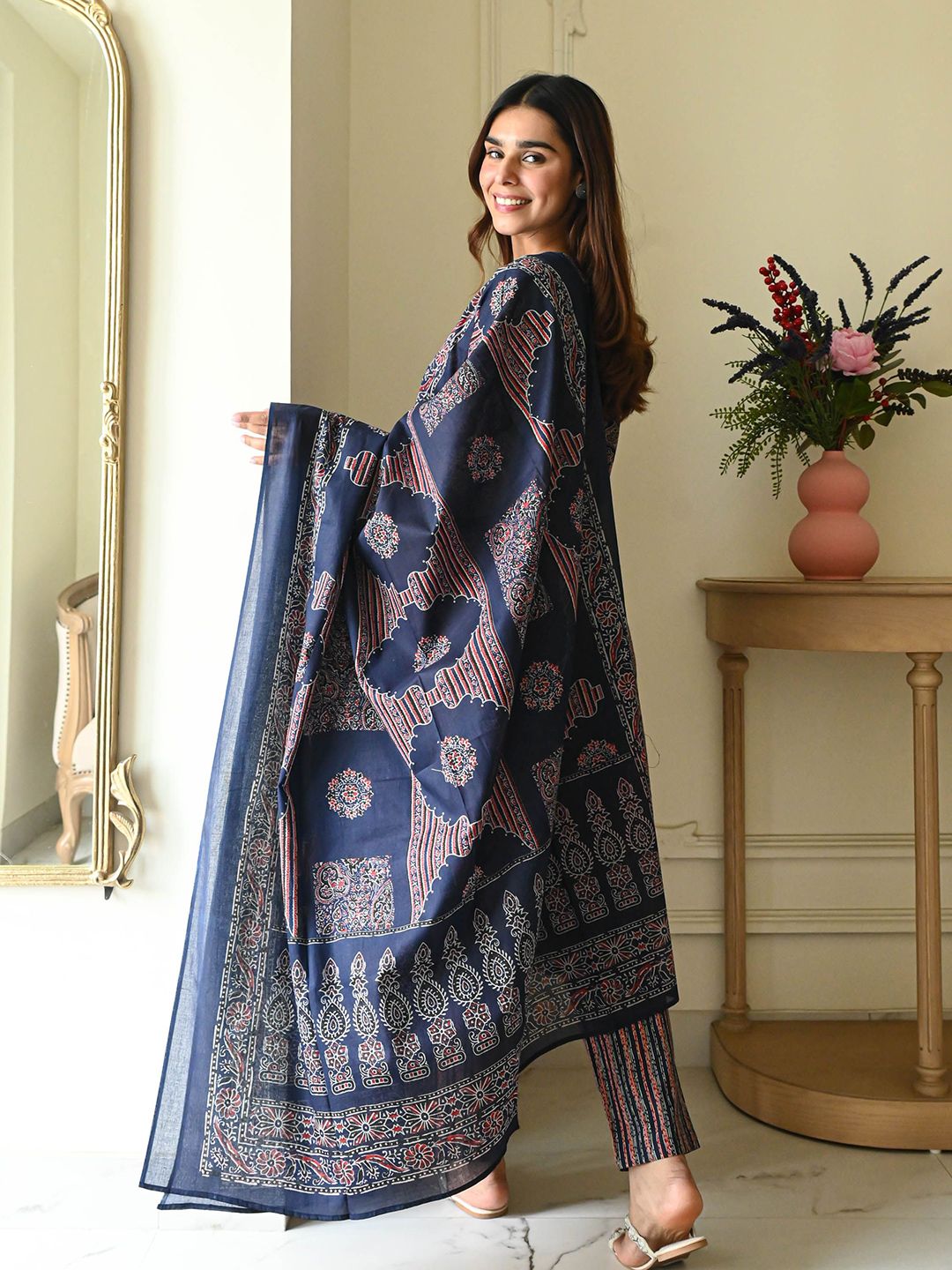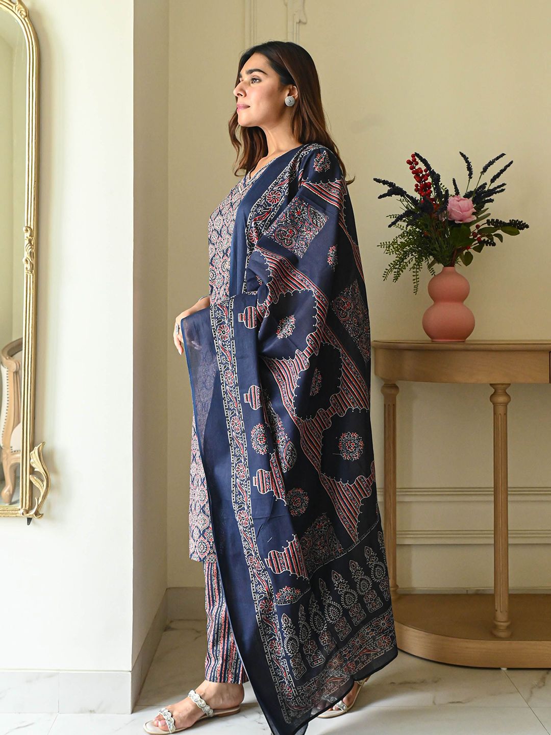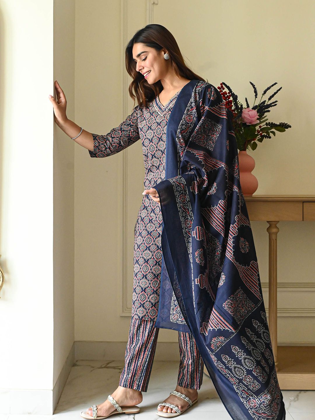 Bunaai Avika Floral Printed V-Neck Straight Kurta With Trousers & Dupatta