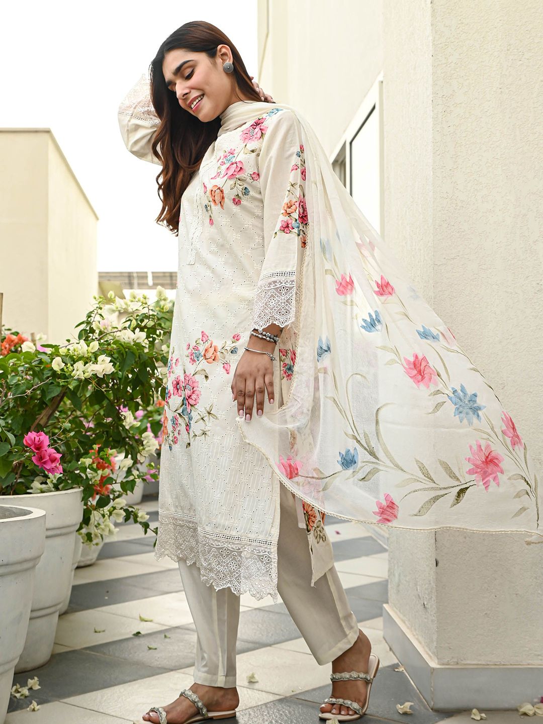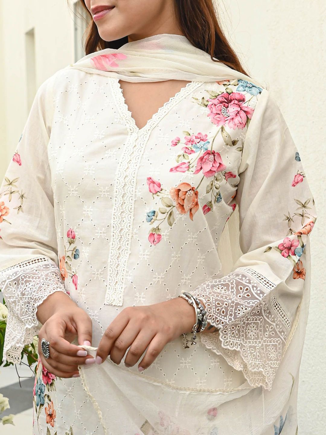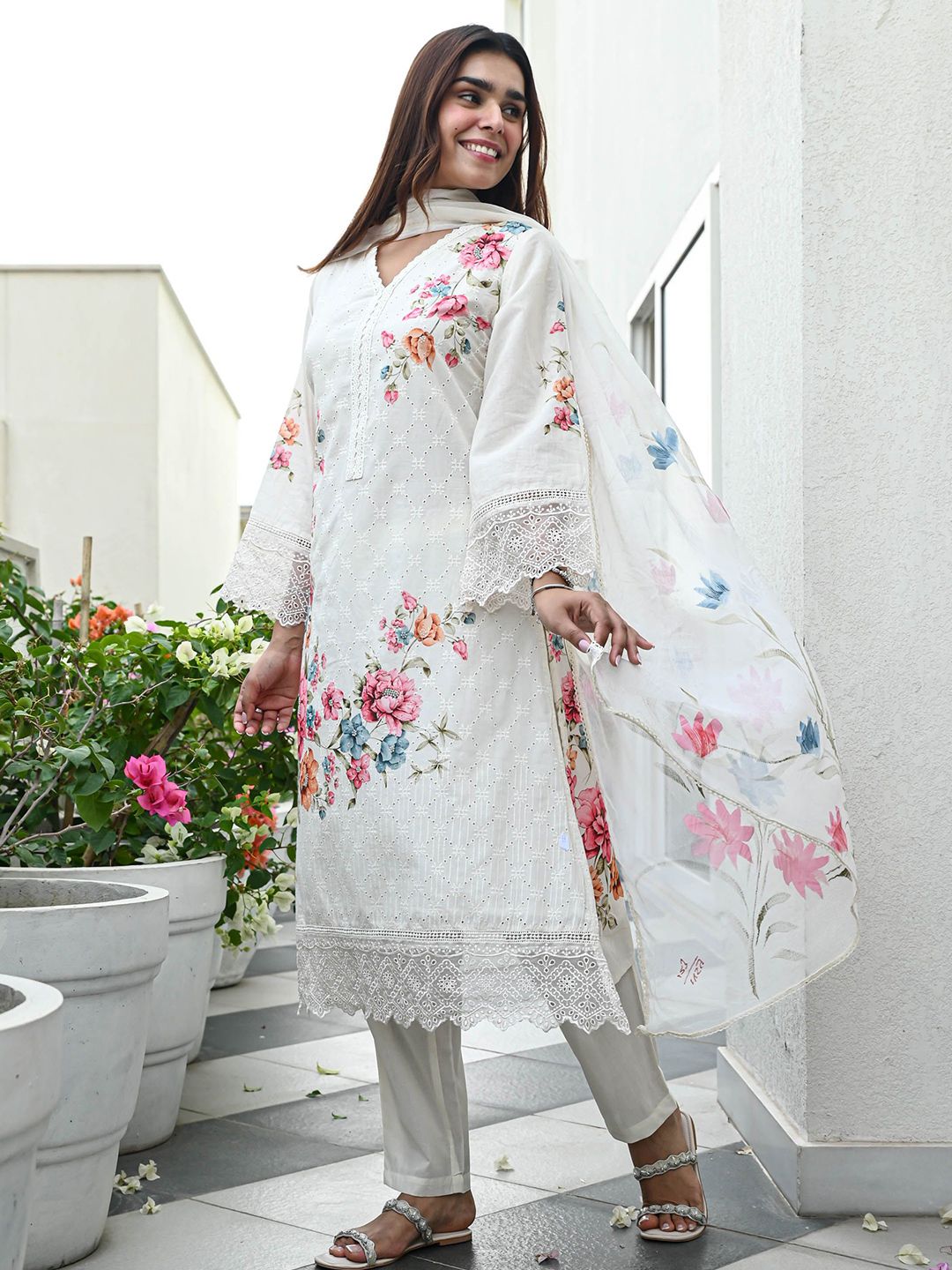 Bunaai Floral Printed V-Neck Straight Kurta With Trousers & Dupatta