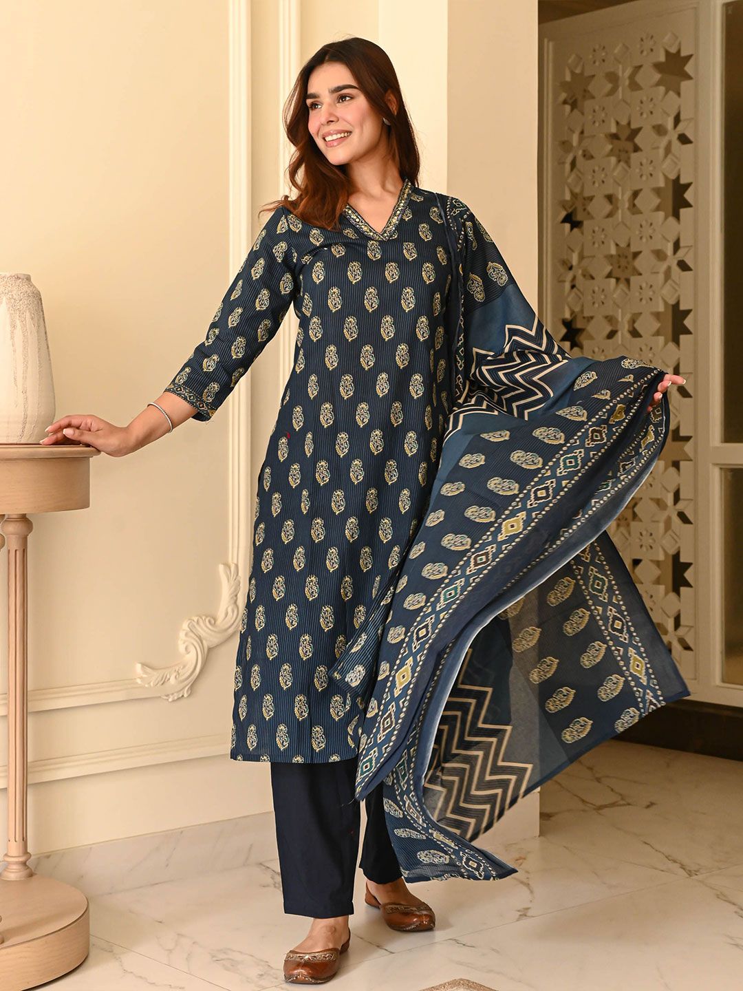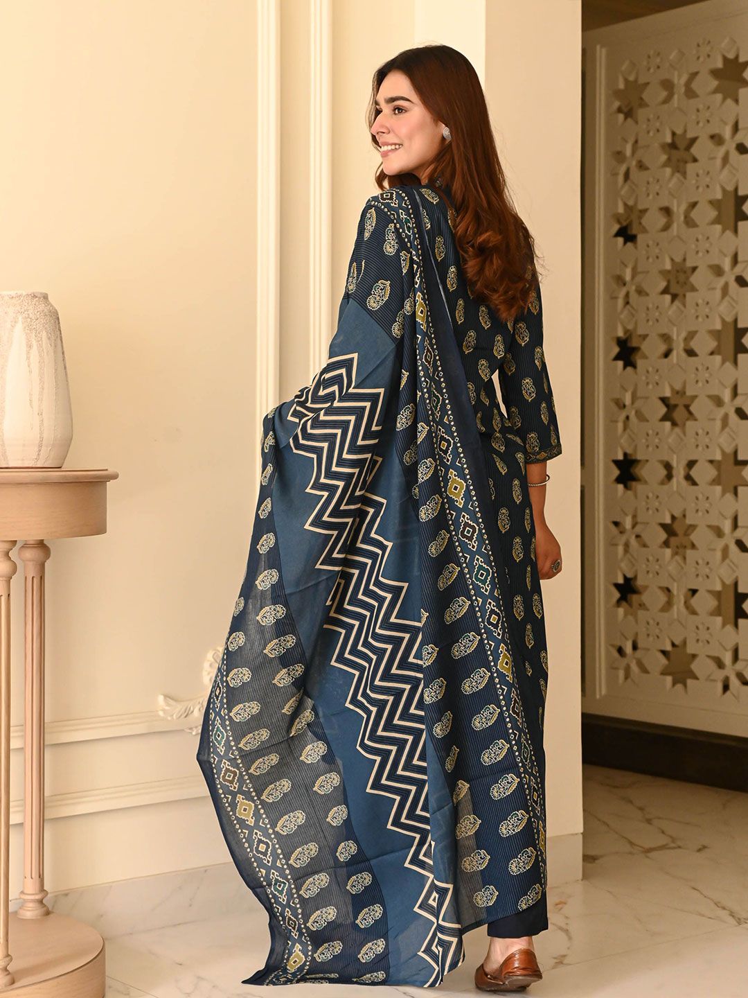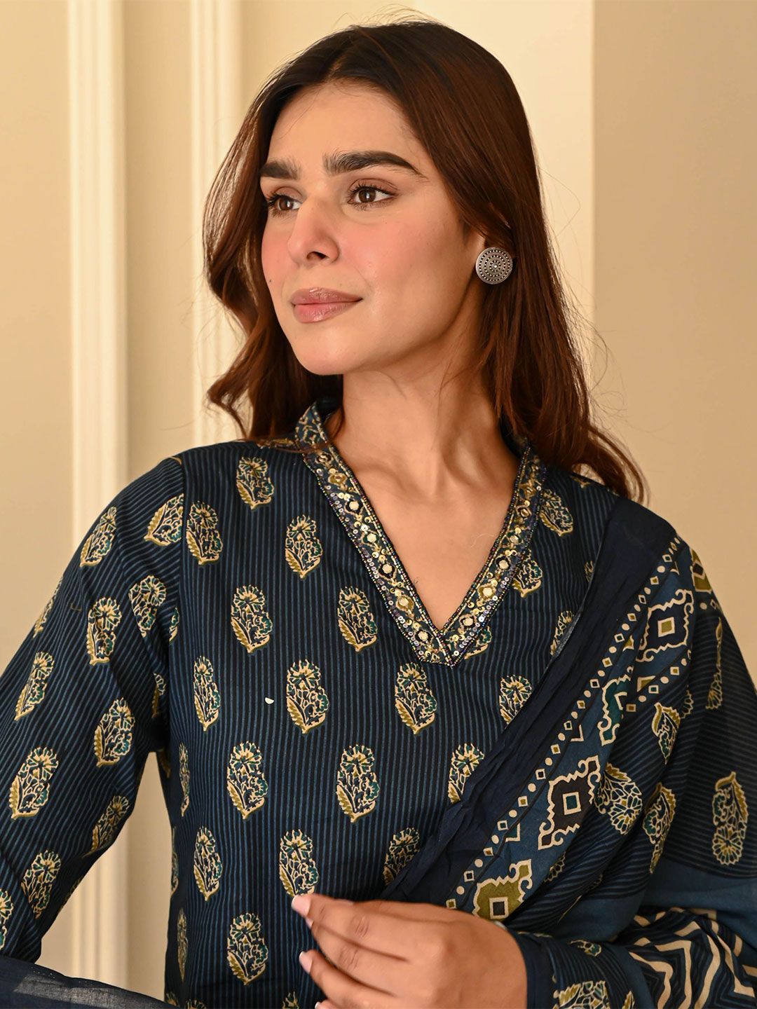 Bunaai Kajol Floral Printed Pure Cotton Sequinned Kurta With Trousers & Dupatta