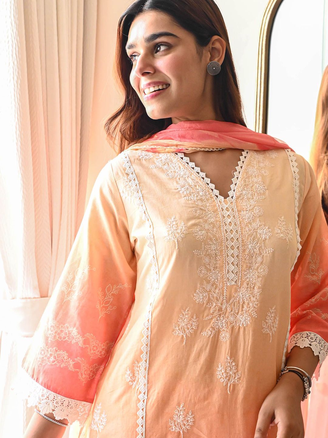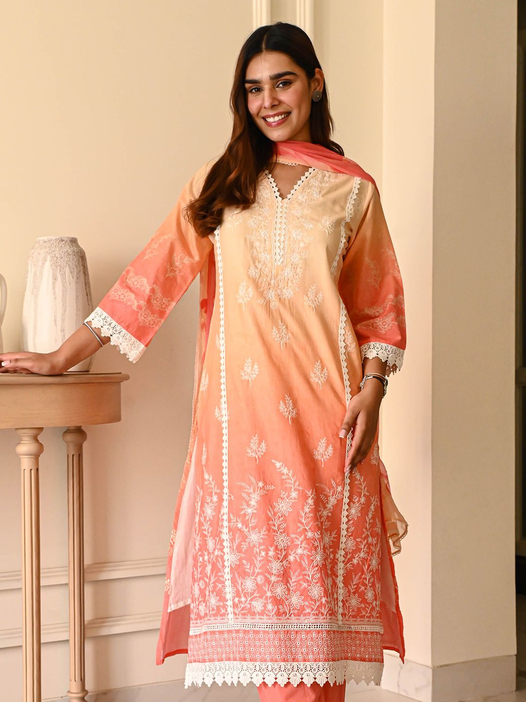 Bunaai Neerja Floral Embroidered V-Neck Chikankari Kurta With Trousers & Dupatta