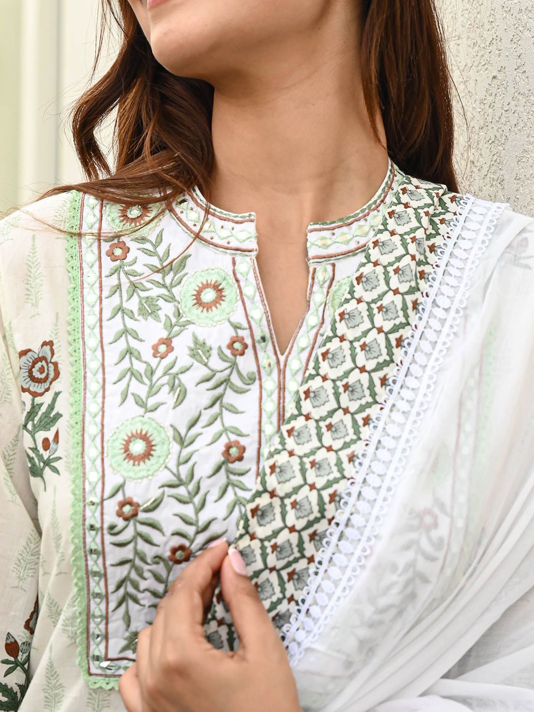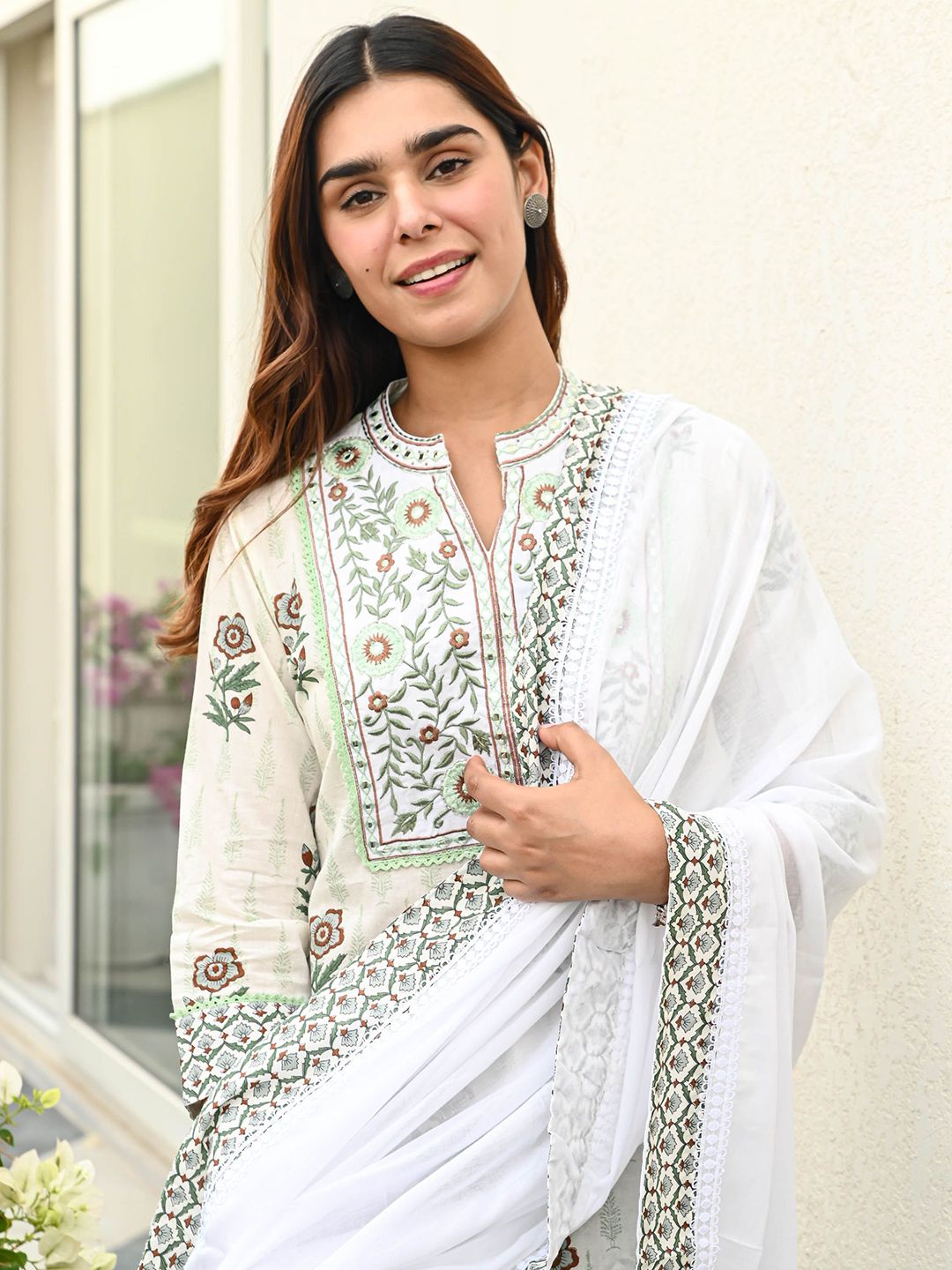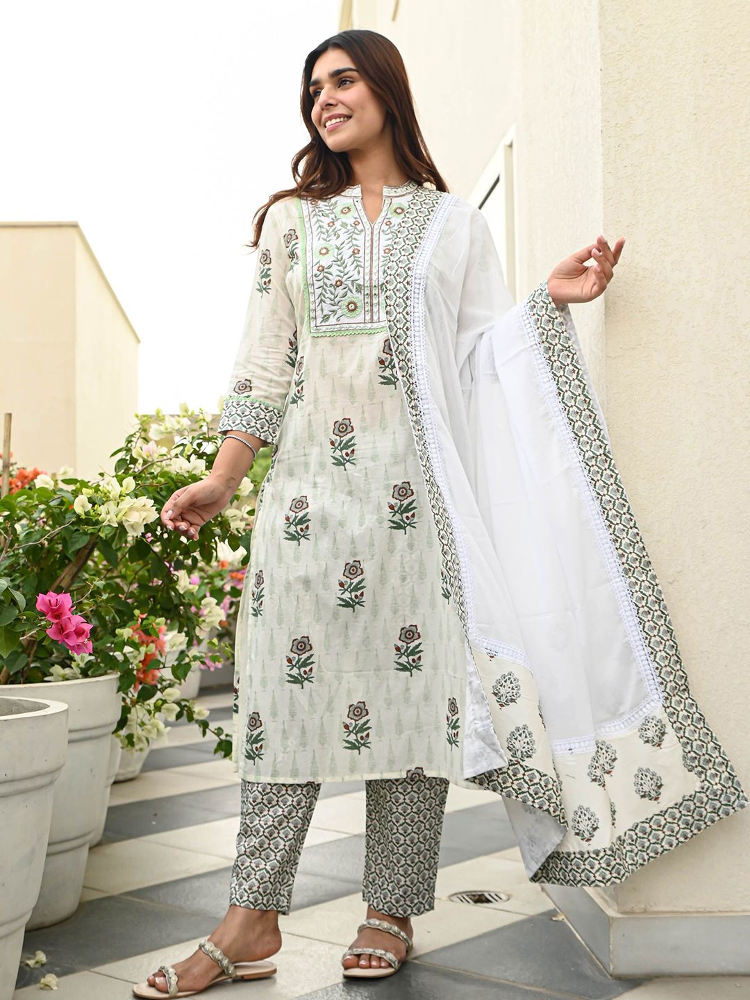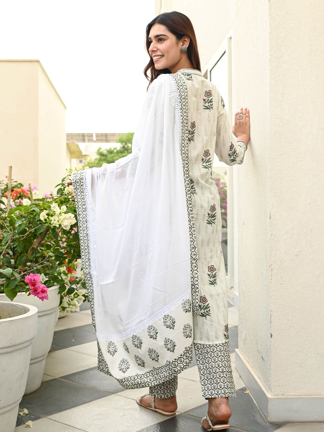 Bunaai Rani Floral Printed Mandarin Collar Thread Work Kurta With Trousers & Dupatta
