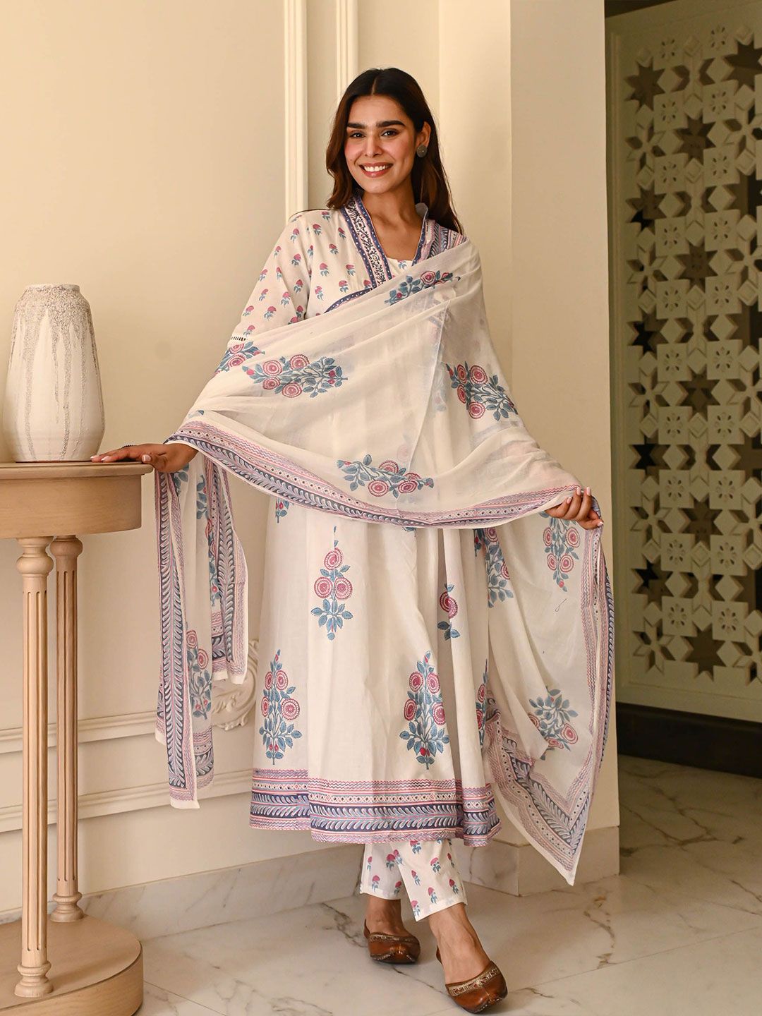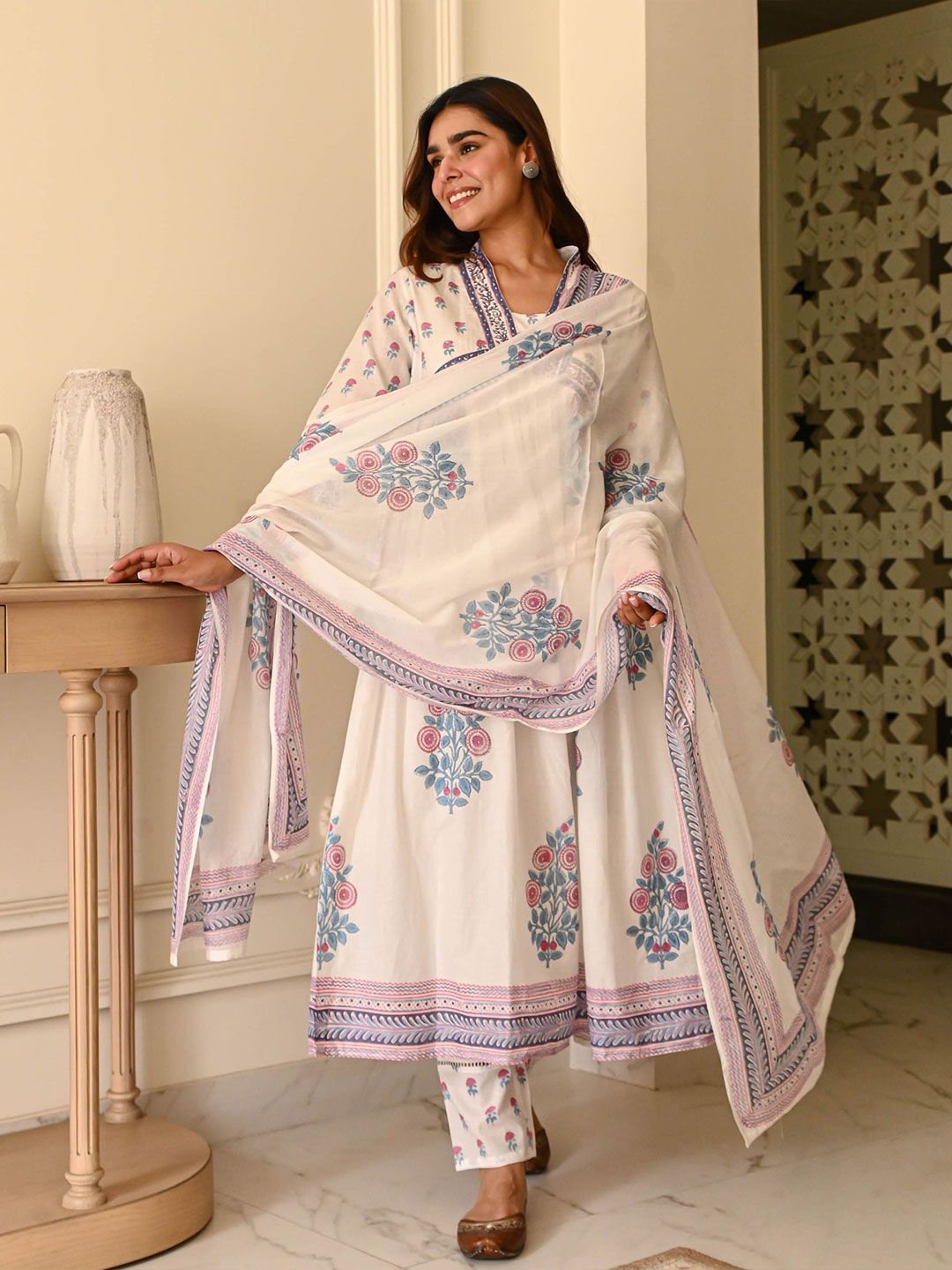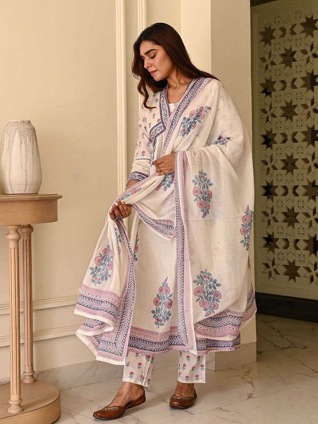 Bunaai Saanjh Floral Printed Empire Pure Cotton Kurta With Trousers & Dupatta