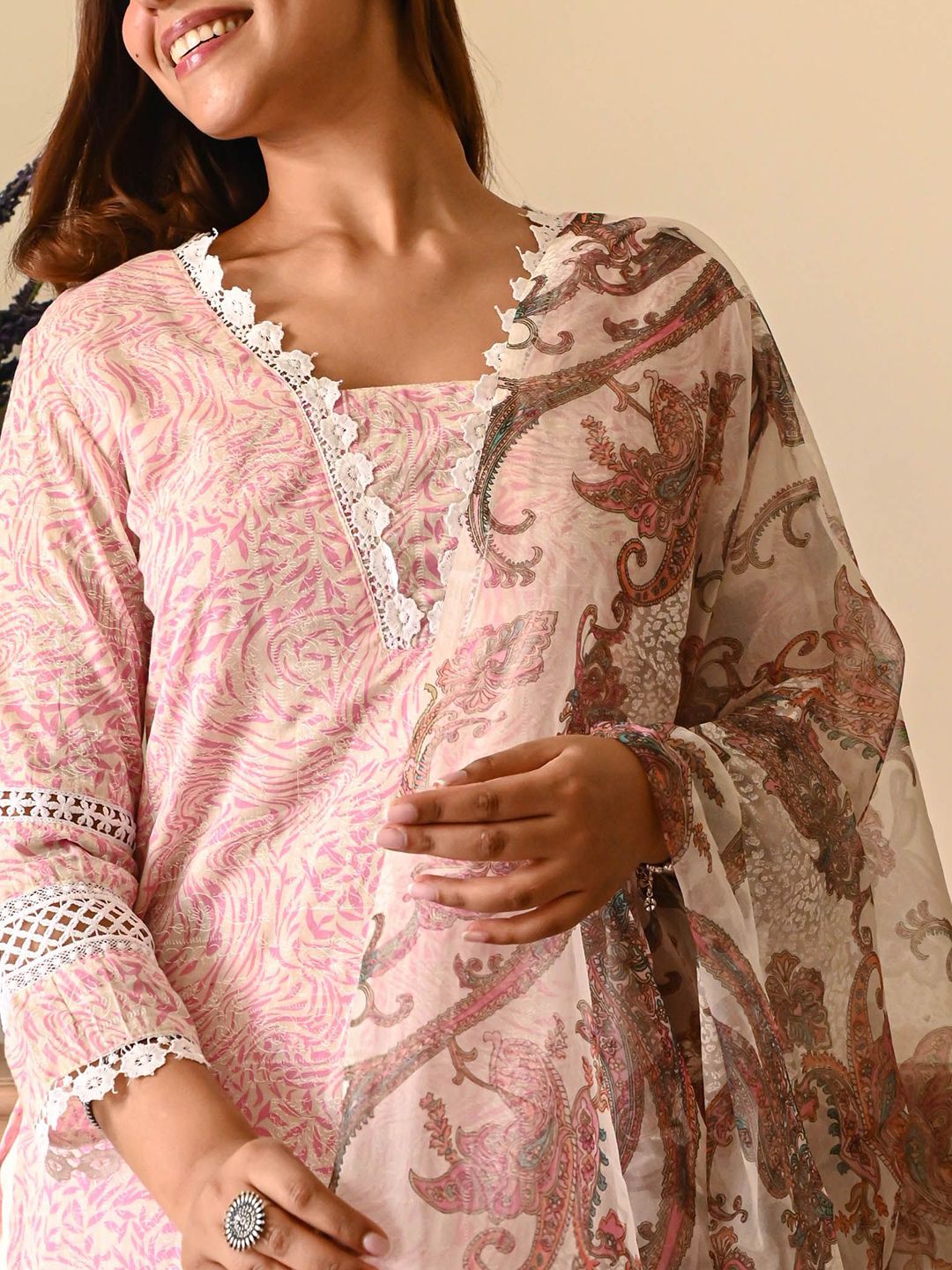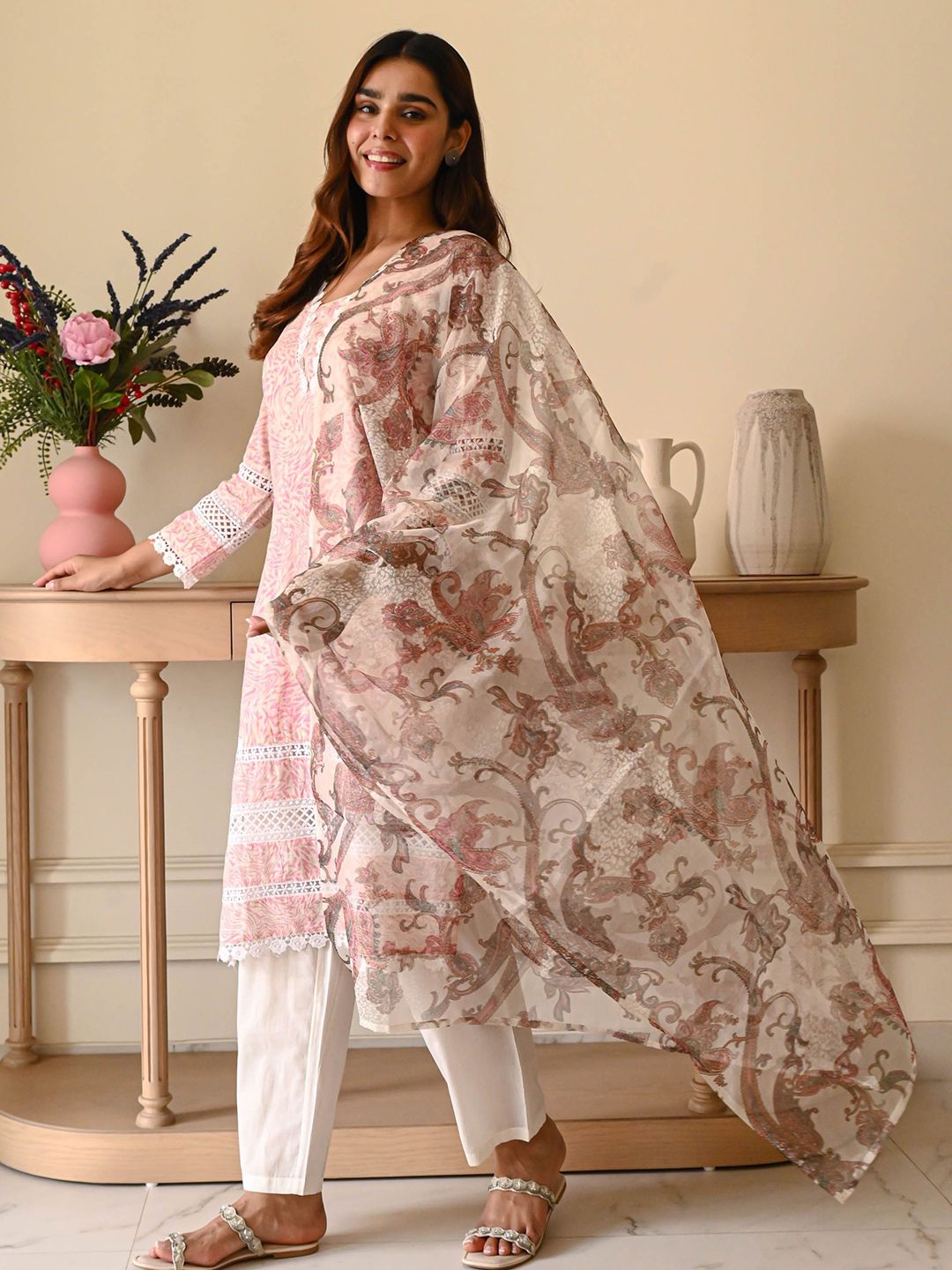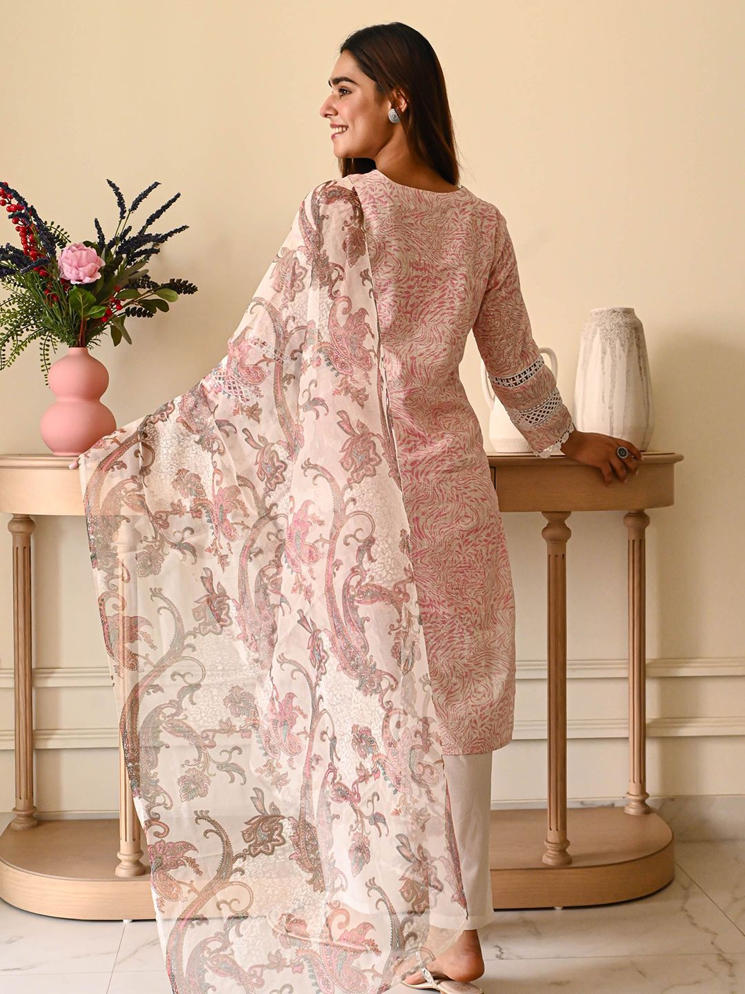 Bunaai Tarini Floral Printed Square Neck Straight Kurta With Trousers & Dupatta