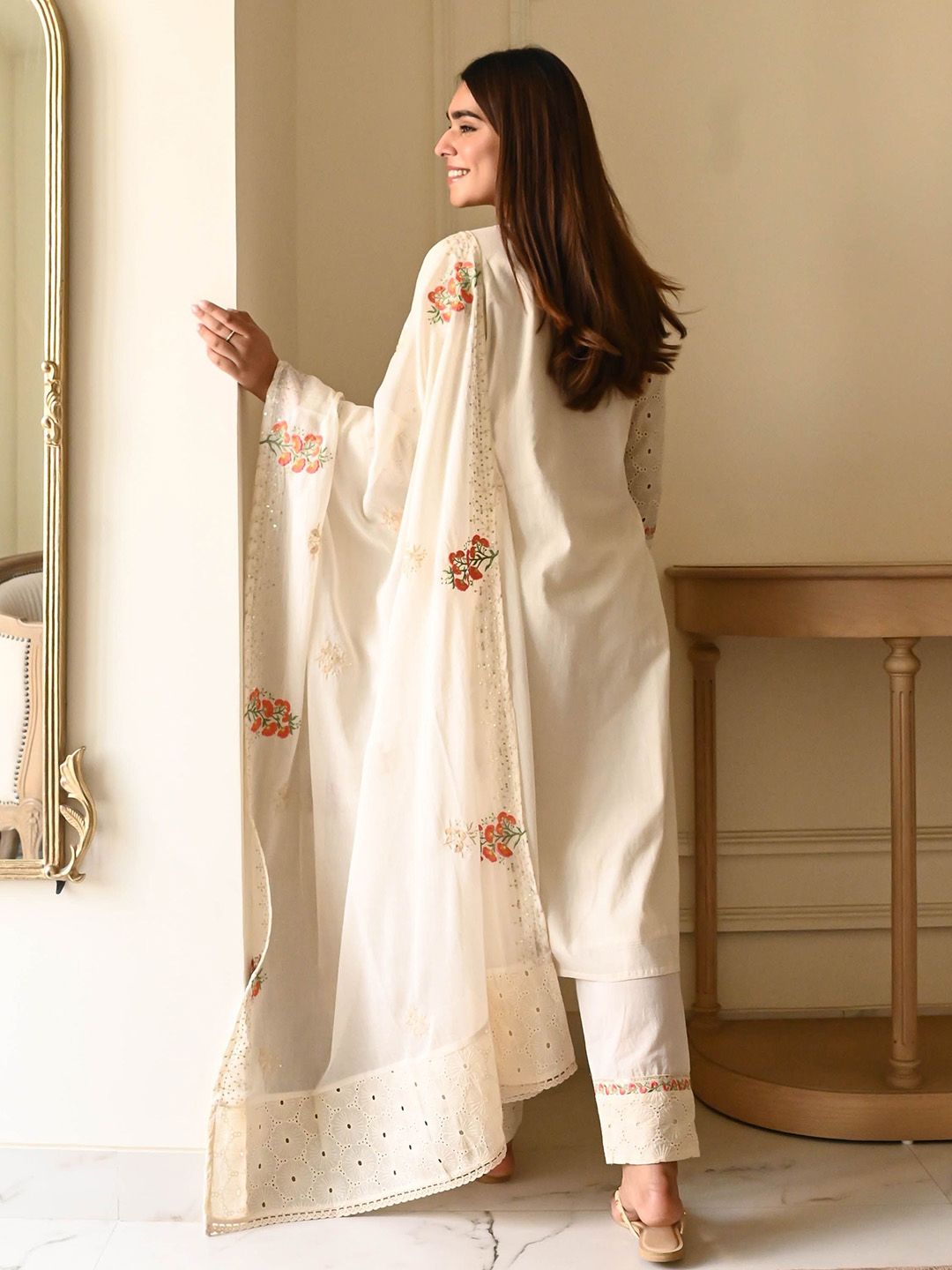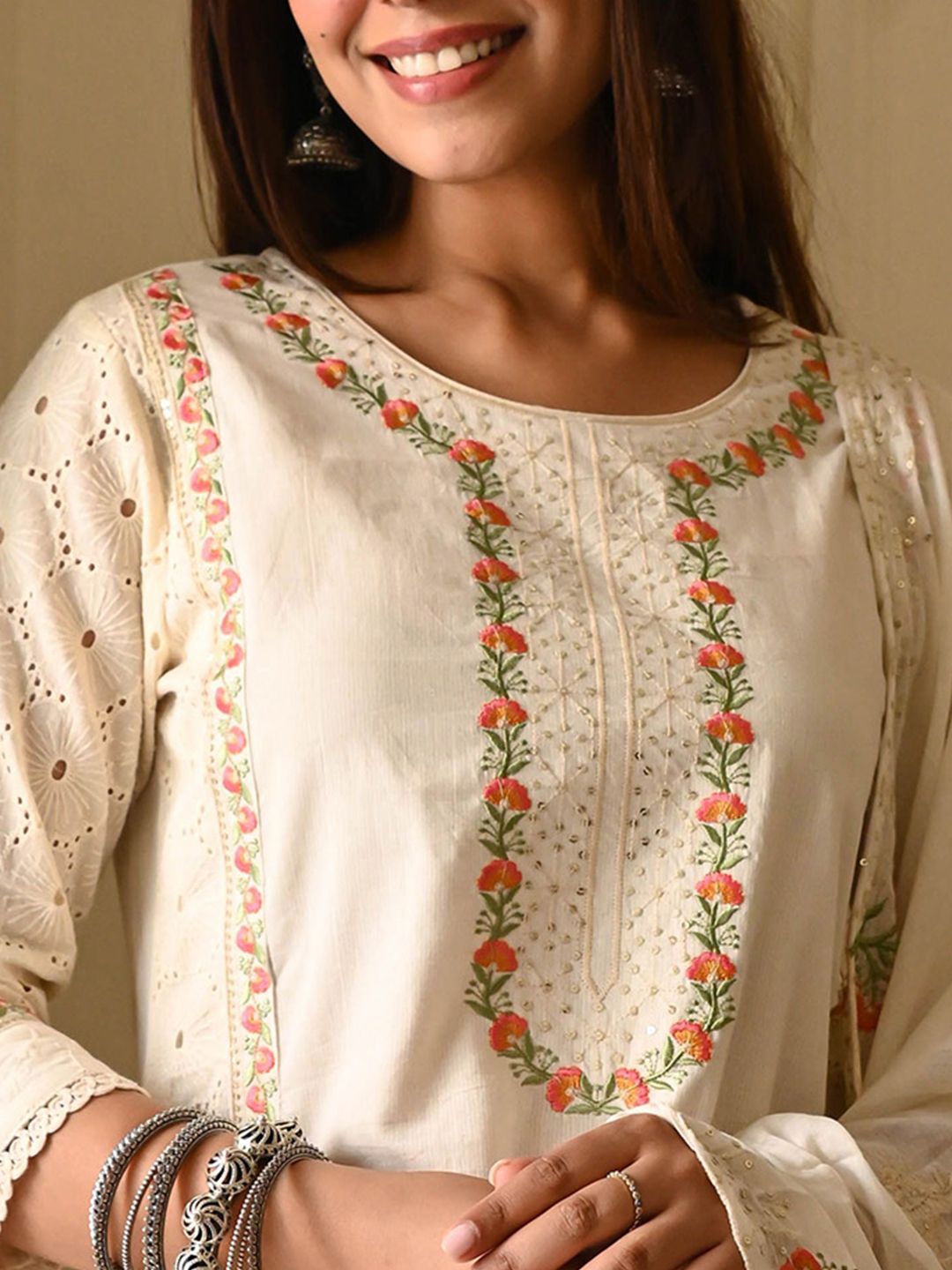 Bunaai Vanya Floral Embroidered Thread Work Kurta With Trousers & Dupatta