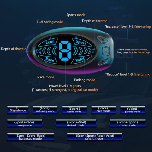 [FUNCTIONS]- The Electronic Throttle Accelerator can removes response delays on your electronic gas pedal, improve the sensitivity of the car to adapt to different driving habits. Just like driving a new car every day, it's amazing! [Small size, portable and easy to install] Ultra-thin equipped with phone USB connector, install this accelerator when the car is powered off, follow the user manual or installation photos to operate, plug and play. All adjustments must be convenient during safe driving. [Clear display and easy adjustment] The electronic throttle accelerator has a 3-character LED display and 3 adjustable buttons. You can see the mode number and intensity level on the display, and you can easily adjust the mode through the buttons. [9 Drive and 10 Modes] - 10 Modes: N—Normal mode, Econ—fuel-saving mode, Sport—sports mode, Race—racing mode, Valet—parking mode, Sport+Race—powerful mode, Econ+Valet—anti-slip mode, Econ+ Sport—comfortable mode, Econ+Sport+Race—balanced mode, Econ+ Sport+Race+Valet—smart mode. 9 levels ( 1-9) for the acceleration, the acceleration sense from weak to strong is very obvious and not affect the throttle control capability. [Model 809 Compatible Vehicles] Compatible with DODGE RAM 1500 New Body Style 2019+ (5th Gen Only), Jeep Wrangler JL 2018+, Jeep Gladiator JT 2020+, Titan Trucks 2016+ (2th Gen Only), Astra 2009-2014, Classic 2002-2016, Cruze 2009-2015, Malibu 2010-2016, Omega 2008-2012, Trailblazer 2012-2019, Montana 2010+, Onix 2013+, Prisma 2009+, S10 2007+, Spin 2011+, Tracker 2013+