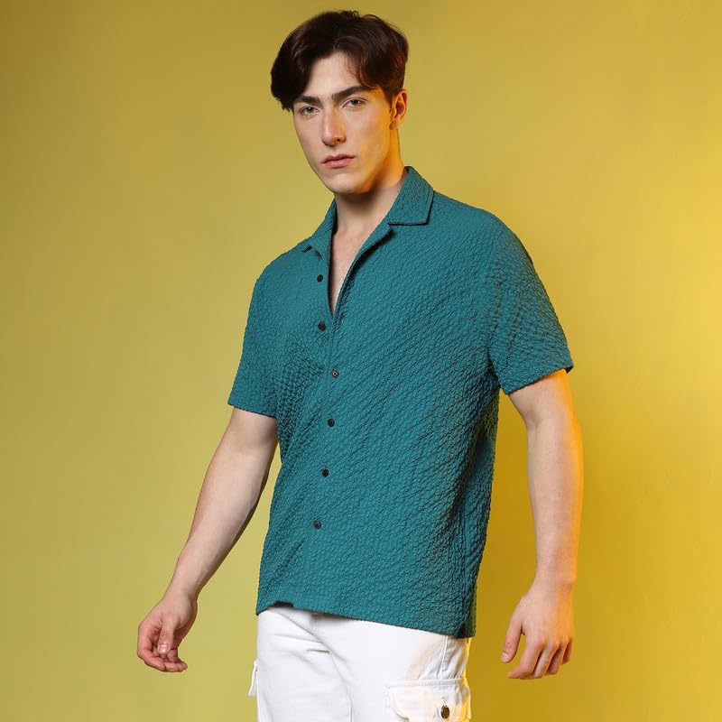 Discover the features and benefits of the Campus Sutra Men's Teal Green Self-Design Creased Striped Shirt for Casual Wear | Spread Collar | Short Sleeve | Button Closure | Shirt Crafted with Comfort Fit for Casual Wear available at Marincart Nepal. This product offers high quality and great value.