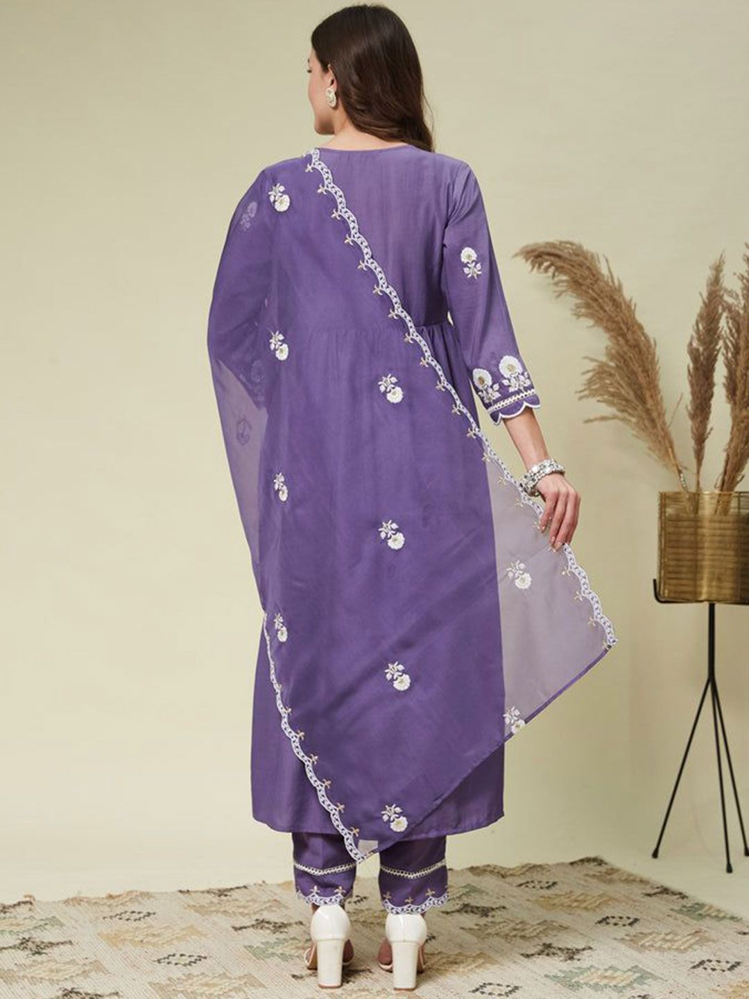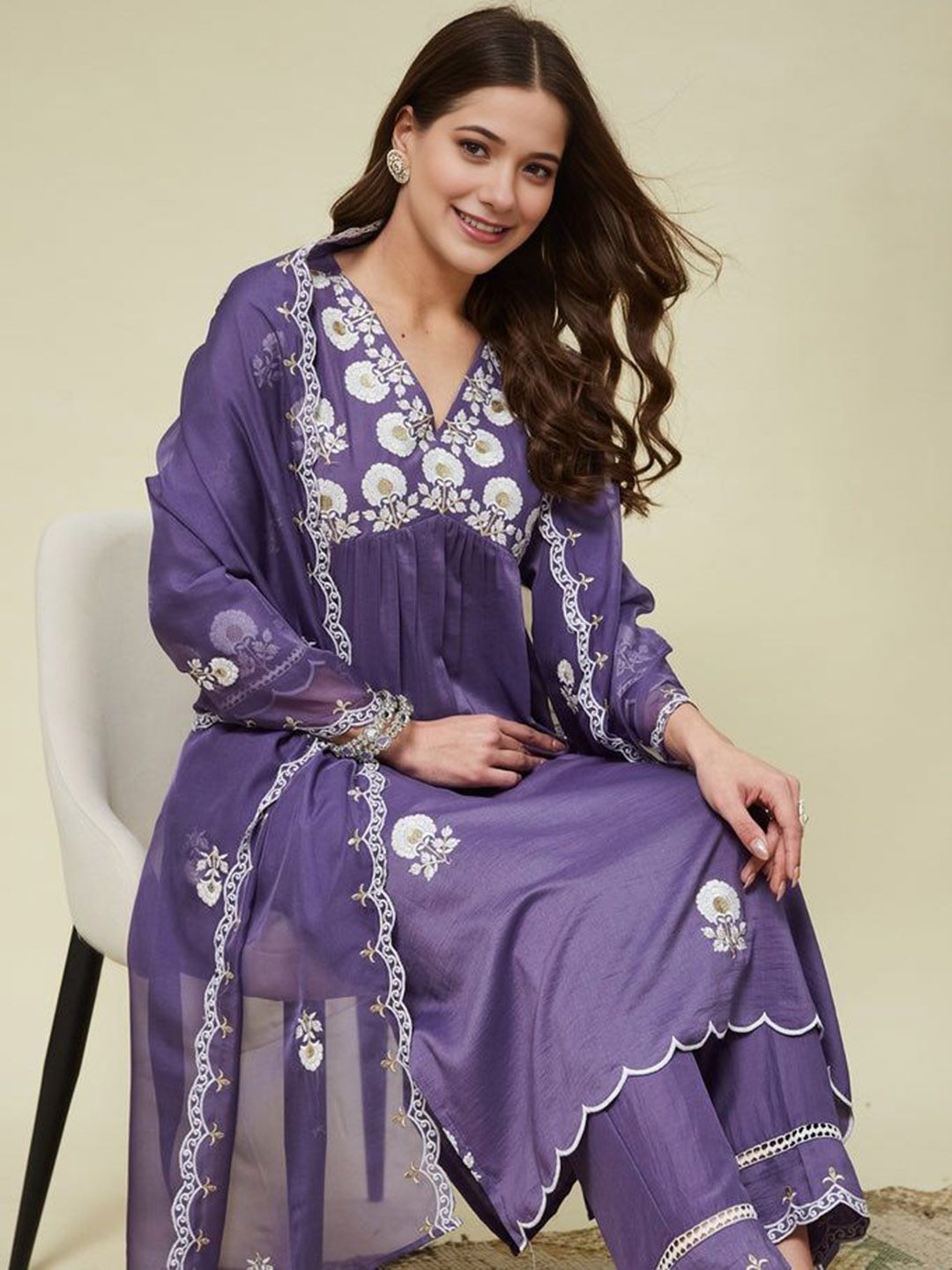CANBIA Floral Embroidered Empire V-Neck Thread Work Anarkali Kurta With Trousers & Dupatta