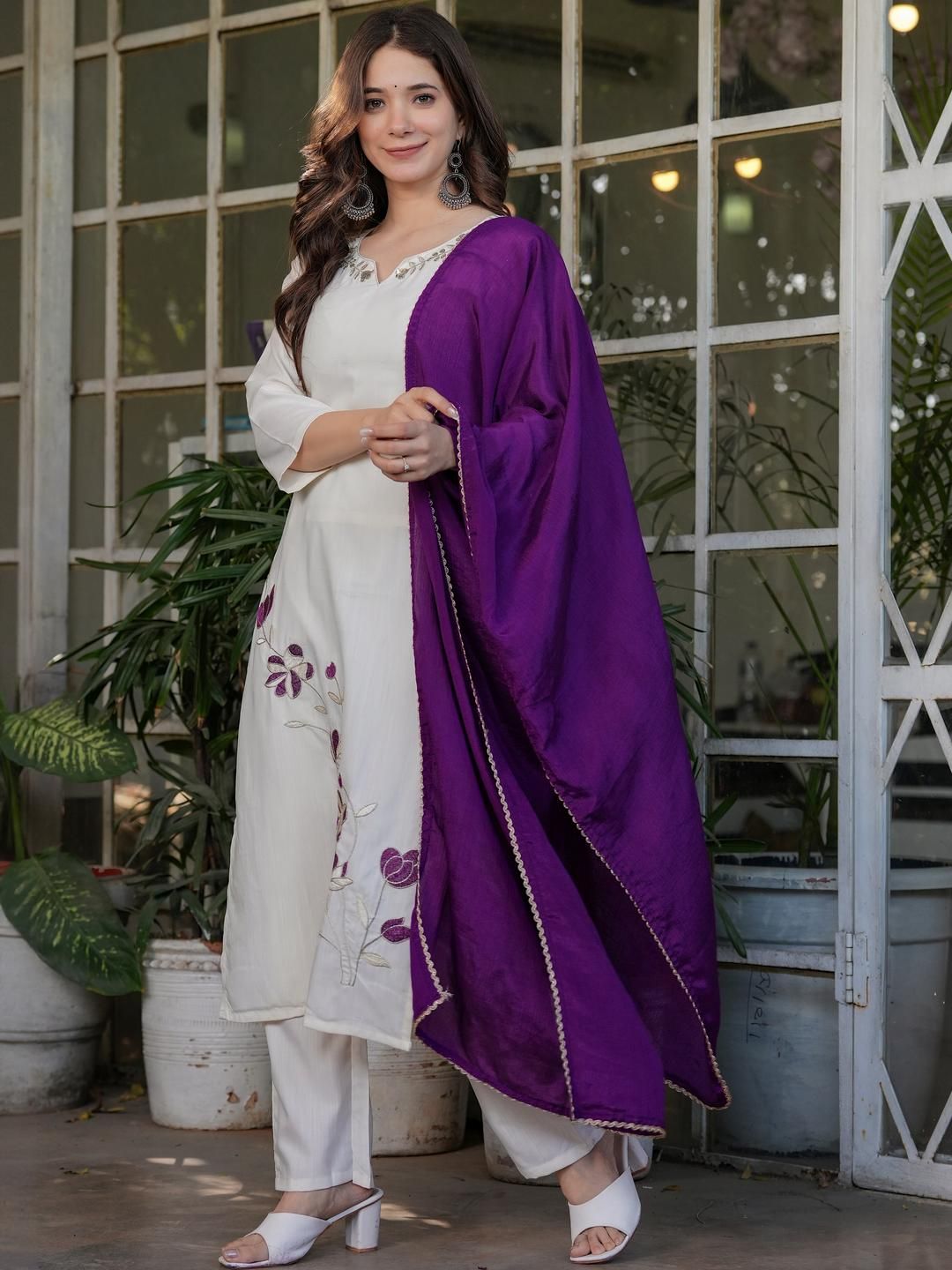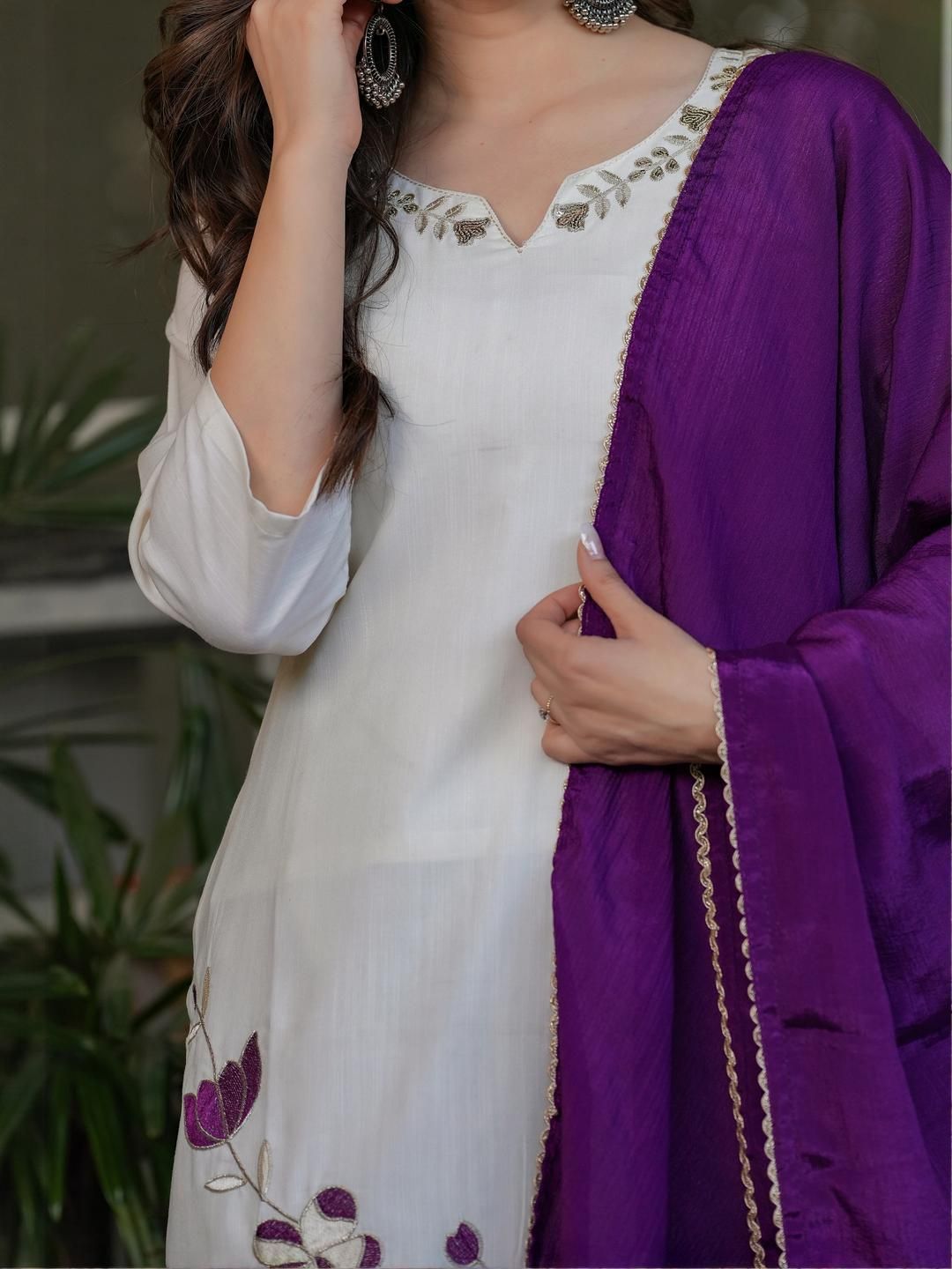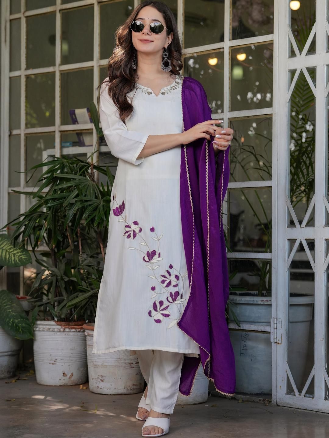 CaniBani Women Floral Embroidered Straight Kurta With Trousers And Dupatta