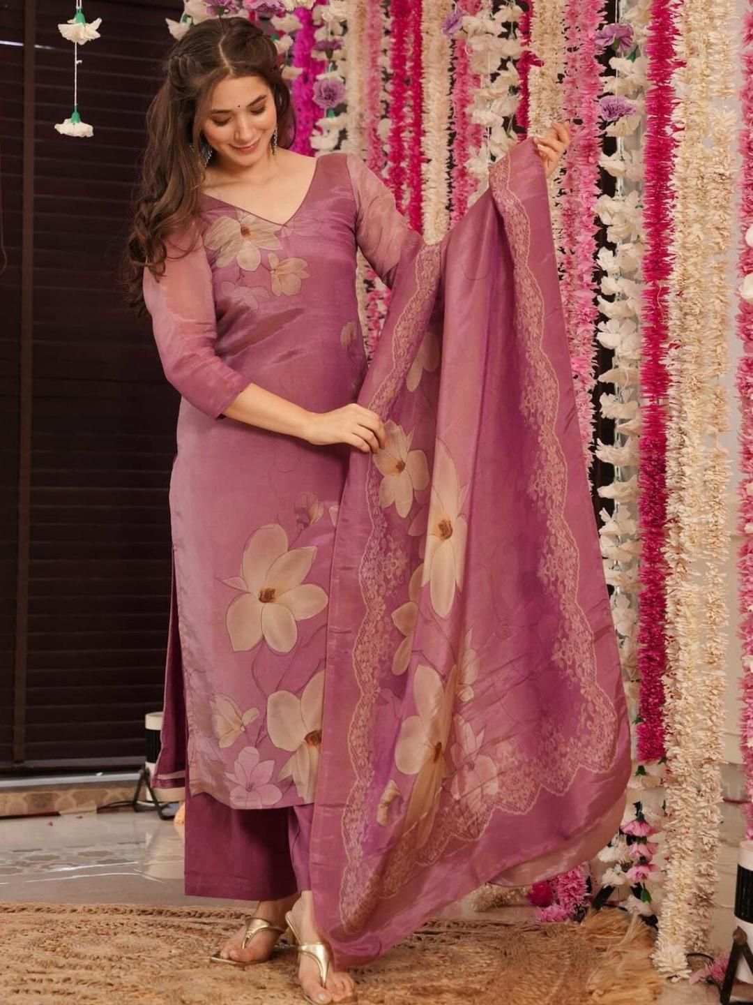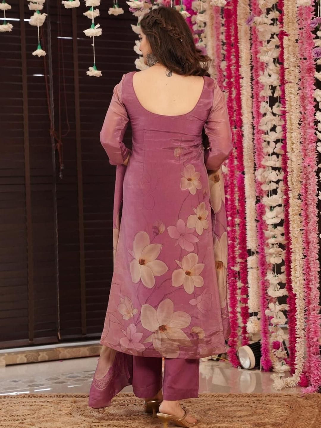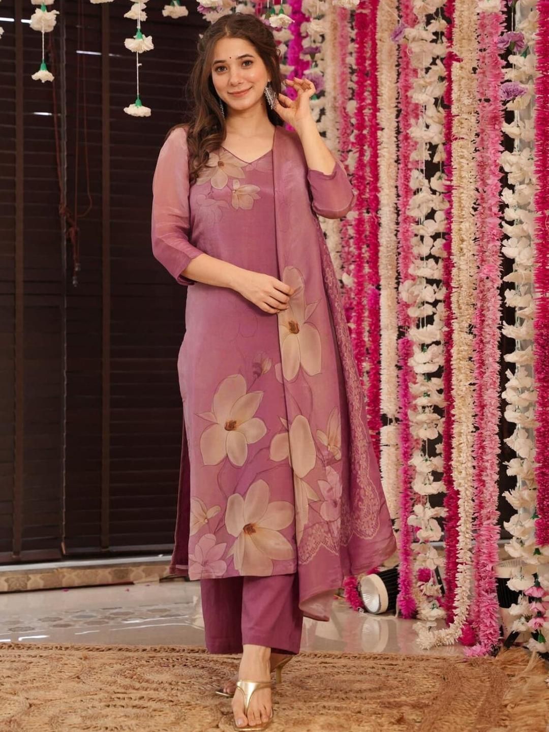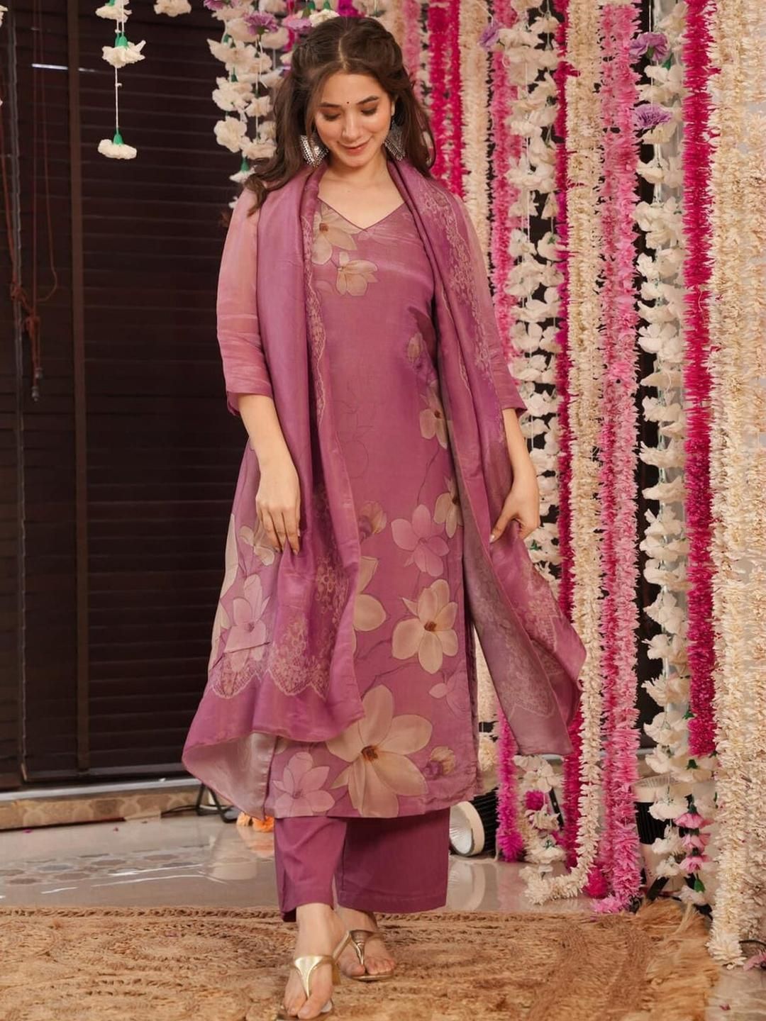 CaniBani Women Mauve Printed Silk Blend Kurta & Trousers With Dupatta