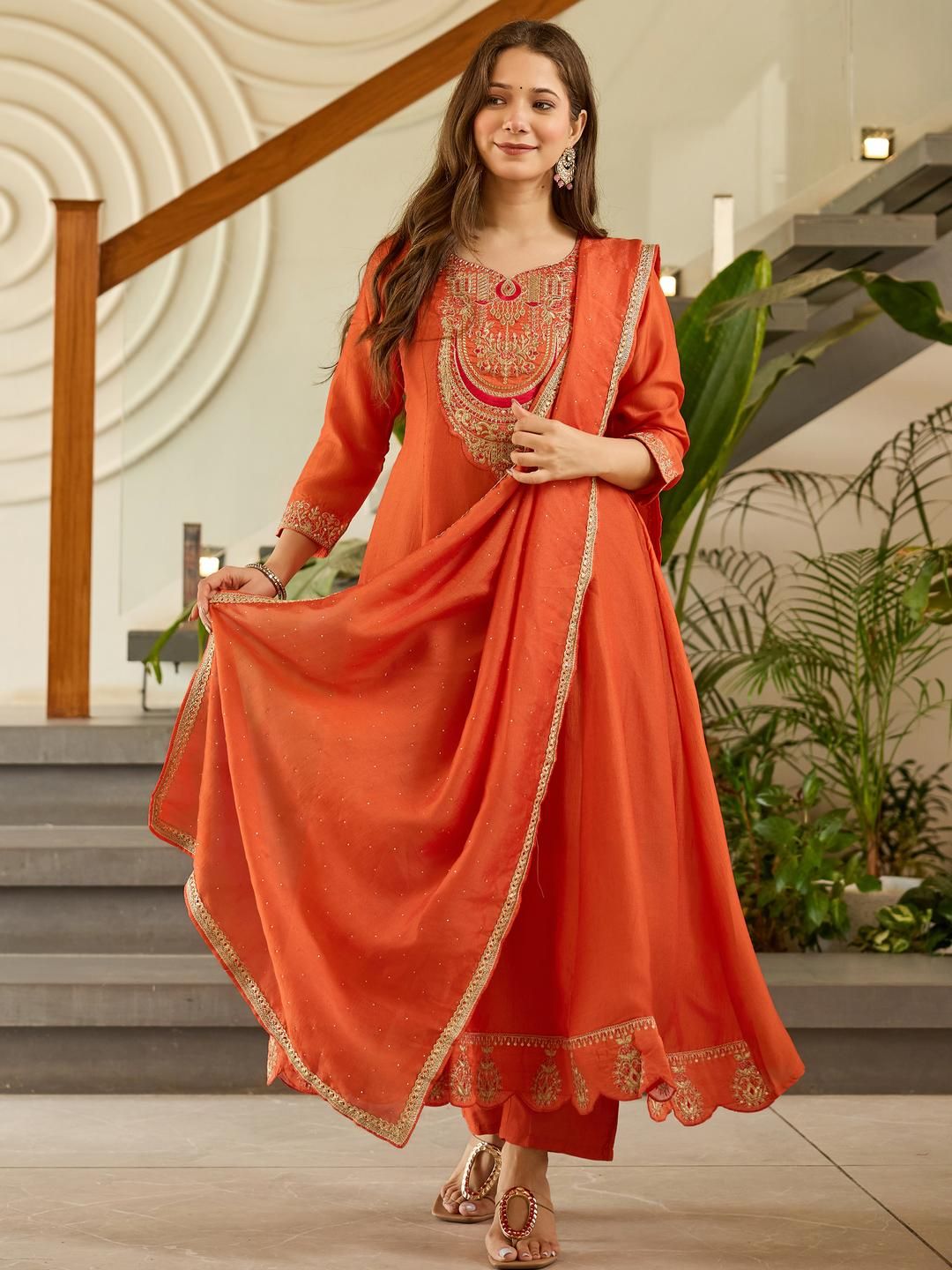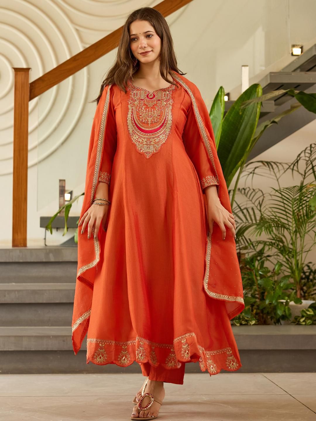 Buy this stylish CaniBani Women Orange Embroidered Chanderi Silk Kurta & Trousers With Dupatta at Marincart Nepal. This product offers great quality and value. Perfect for those looking for the latest trends in fashion. Get yours now at unbeatable prices.