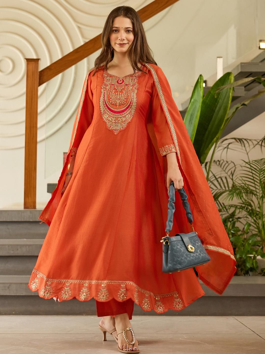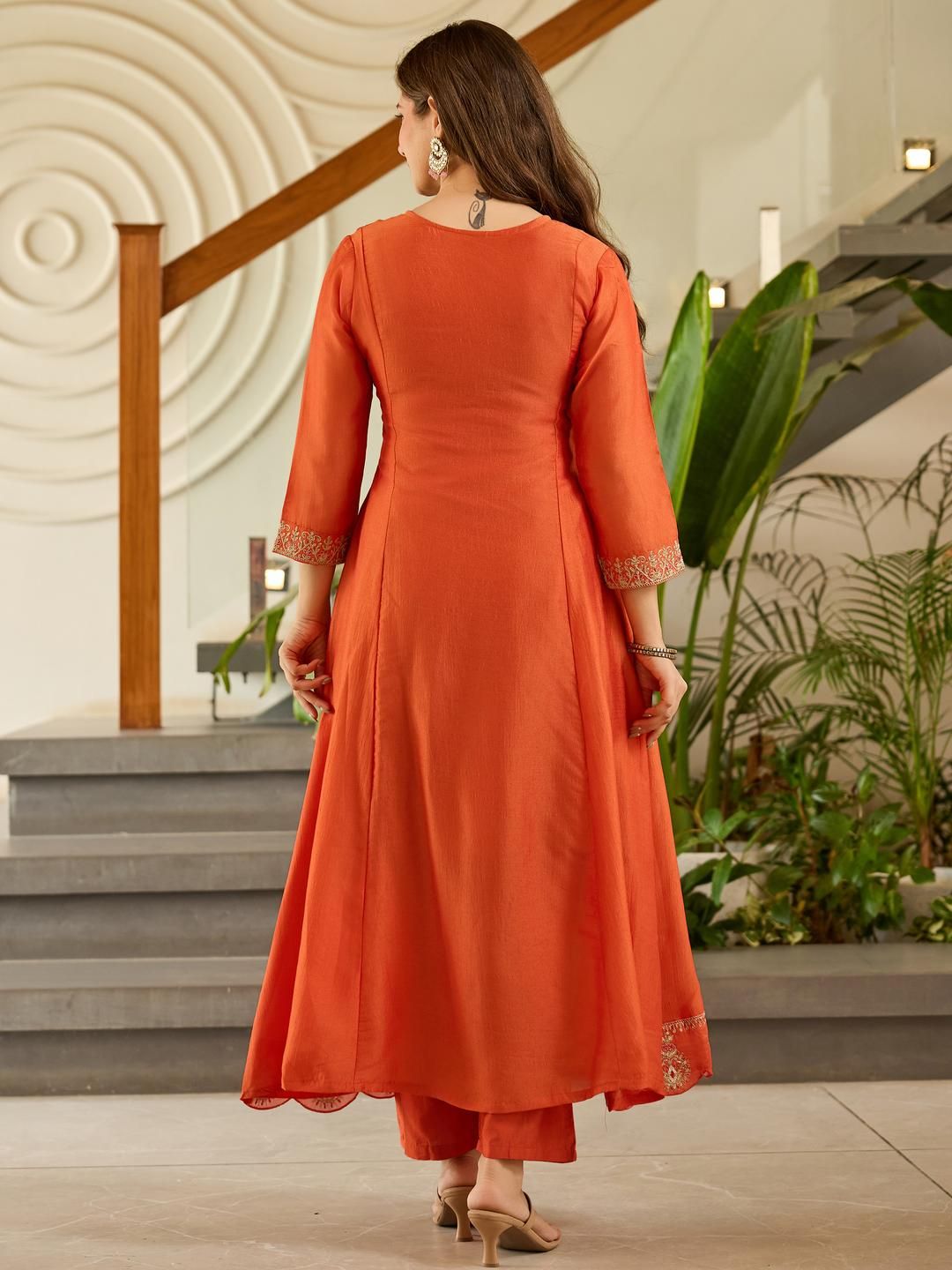 CaniBani Women Orange Embroidered Chanderi Silk Kurta & Trousers With Dupatta