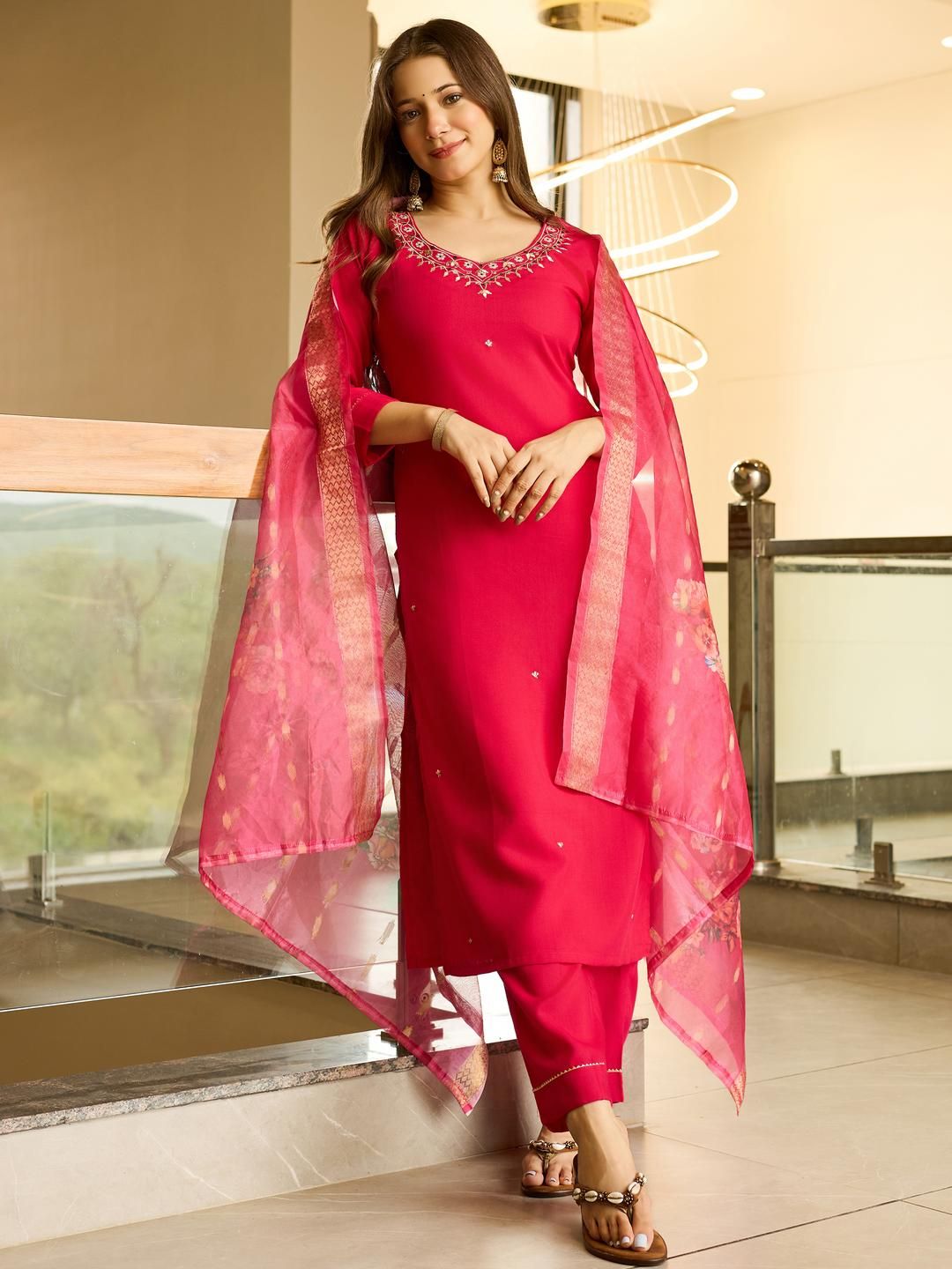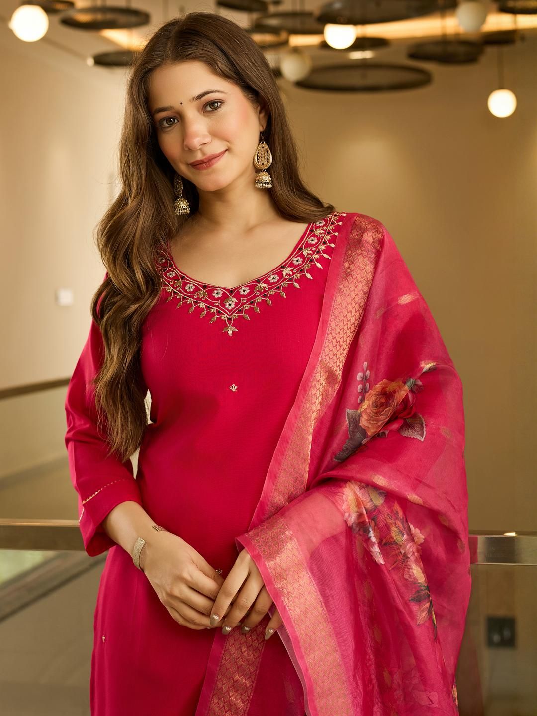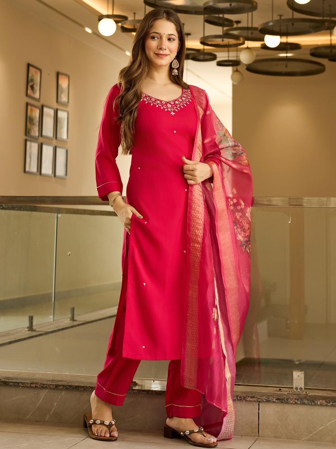 Buy this stylish CaniBani Women Pink Embroidered Chanderi Silk Kurta & Trousers With Dupatta at Marincart Nepal. This product offers great quality and value. Perfect for those looking for the latest trends in fashion. Get yours now at unbeatable prices.