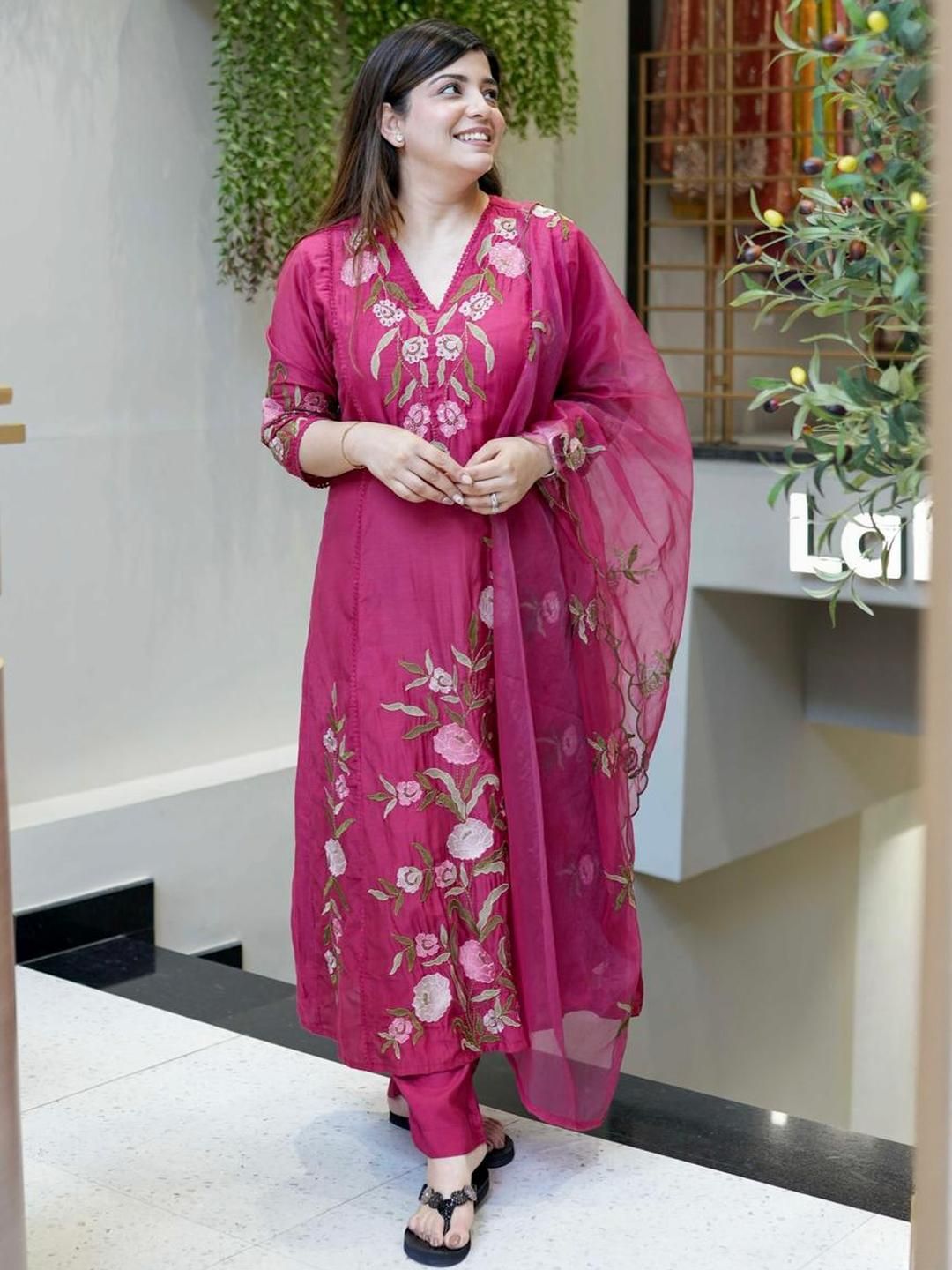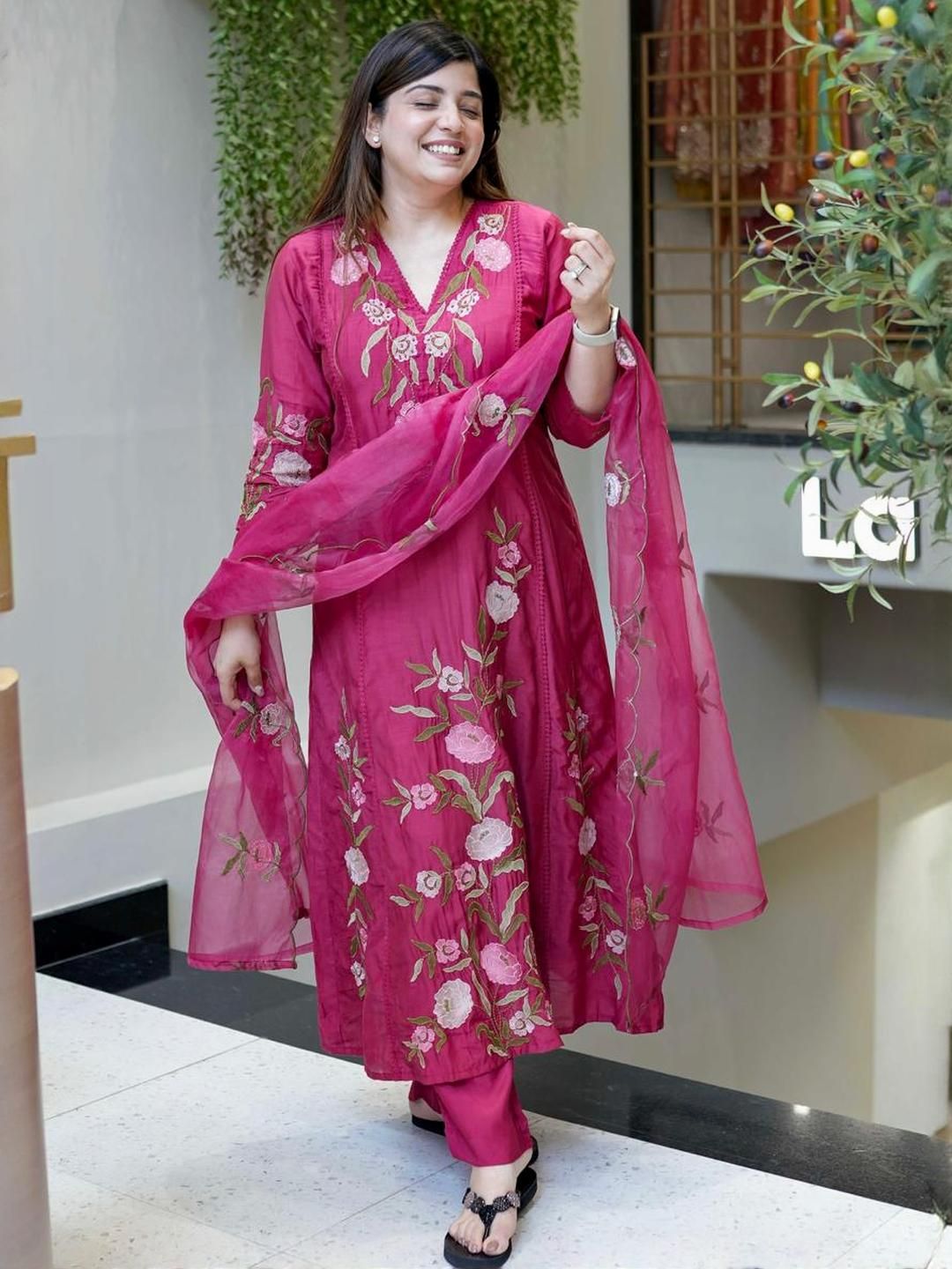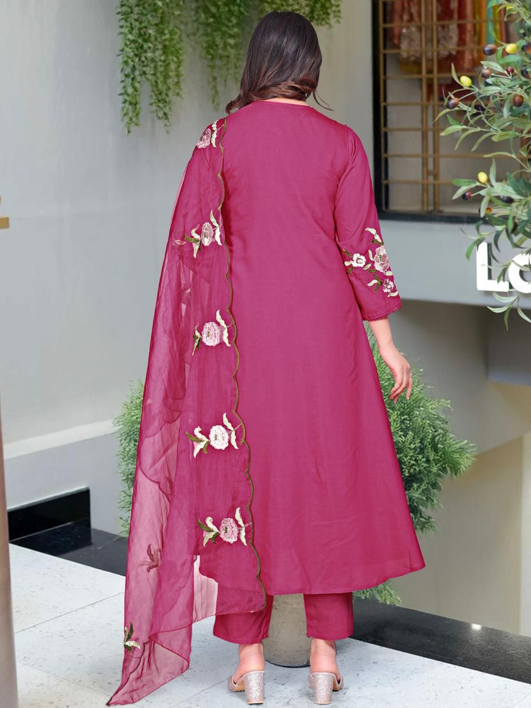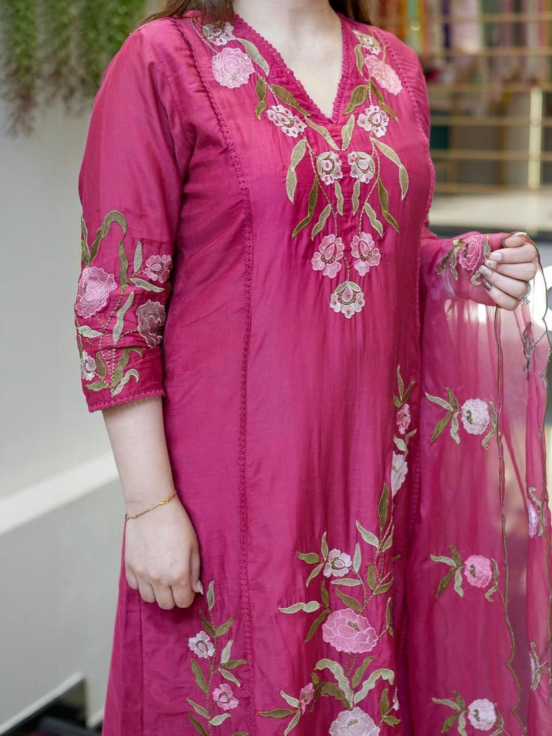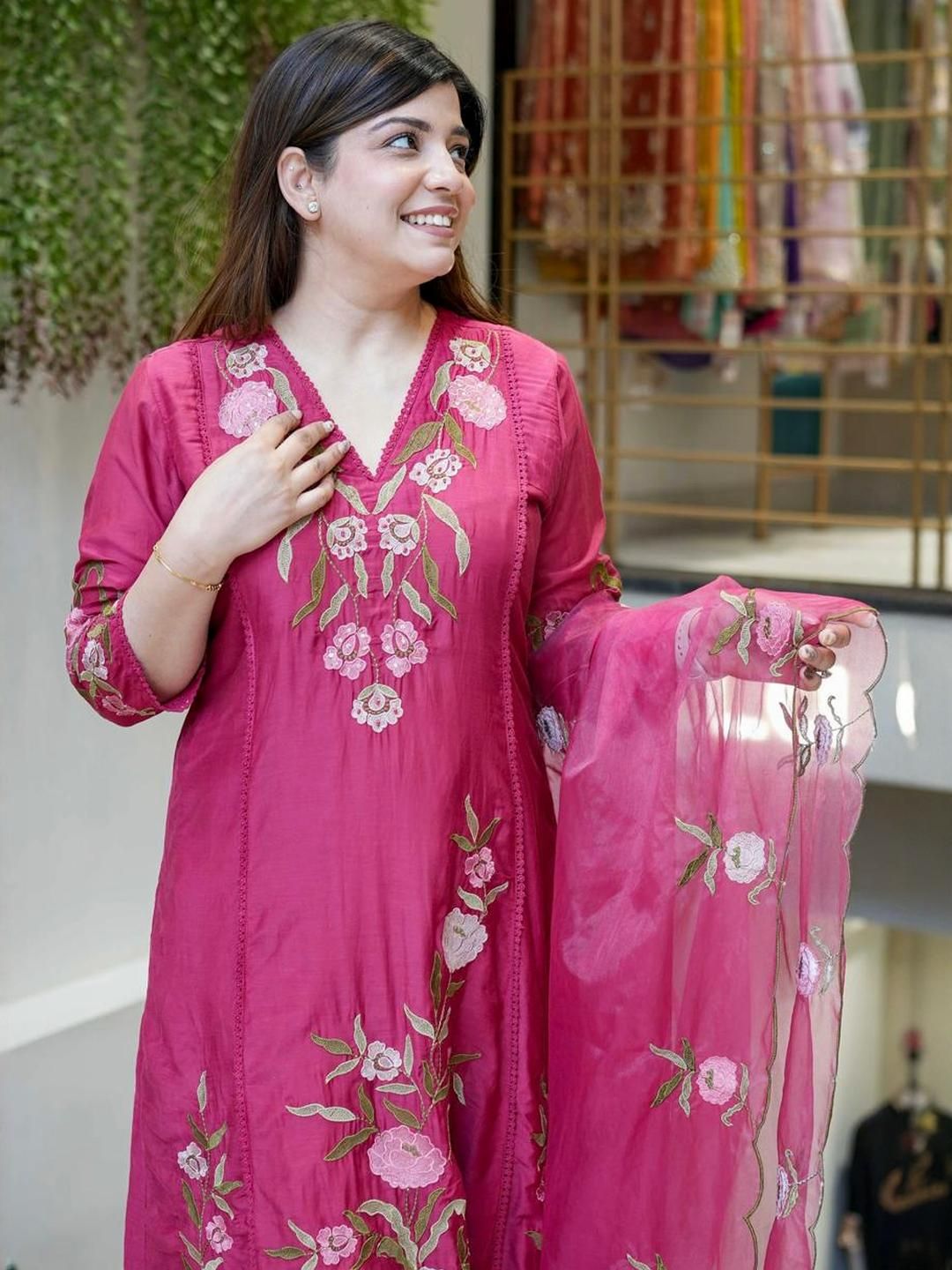 CaniBani Women Pink Embroidered Silk Blend Kurta & Trousers With Dupatta