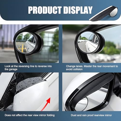 Integrated Design: This rearview mirror features a sleek integrated design that combines the rain eyebrow and blind spot mirror into one elegant unit, enhancing the overall appearance and seamlessly blending with your vehicle. Carbon Fiber Pattern Rain Eyebrows: Equipped with carbon fiber pattern rain eyebrows, this rearview mirror effectively prevents rainwater from reaching the mirror surface, ensuring a clear view and improved visibility. Push-Type Adjustment: The blind spot mirror utilizes a push-type adjustment system, allowing for easy customization of angle and position to meet the needs of different drivers. It supports 360-degree adjustment, providing a broader field of view, reducing blind spots, and enhancing driving safety. High-Definition Vision: Made from high-transparency mirror material, this rearview mirror offers clear visibility, making it easier for drivers to monitor surrounding traffic. The mirror surface is specially treated to minimize sunlight and vehicle light reflections, reducing glare and enhancing safety. Package Contents: You will receive two integrated rearview mirror rain eyebrow blind spot mirrors. For any questions or concerns about the product, please feel free to reach out to us, and we will do our best to assist you.