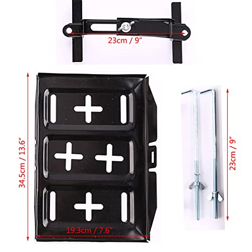 Metal material, Sturdy metal construction, good bearing capacity and durable in use. Recessed slots design, so battery won't make contact with tray fasteners. The clamping range is adjustable. Clamping width range is 5.9 inch - 8.66 inch (15-22cm) and clamping height range is 5.5 inch-9 inch (14-23cm). Only fit for batteries within 13inch x 7.5inch (33x19cm). Battery tray and hold down clamp kit. Fit for automotive or marine use.